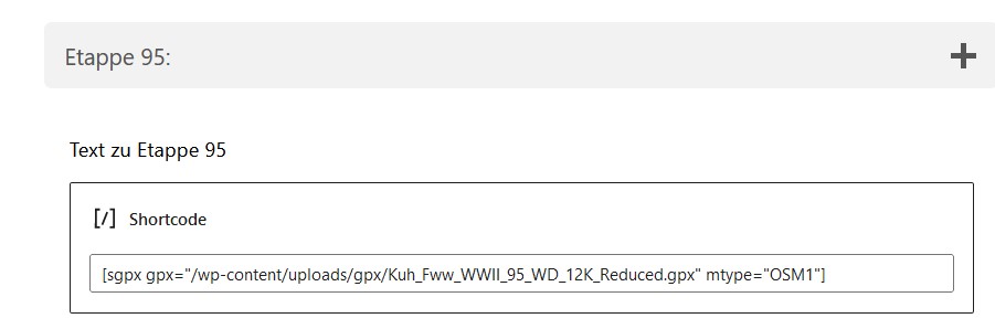 EckigeKlammerAuf sgpx gpx=”relativer Pfad und Dateiname der unter Punkt 14 hochgeladenen .gpx Datei” mtype=”OSM1″EckigeKlammerZu