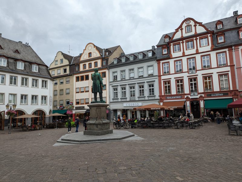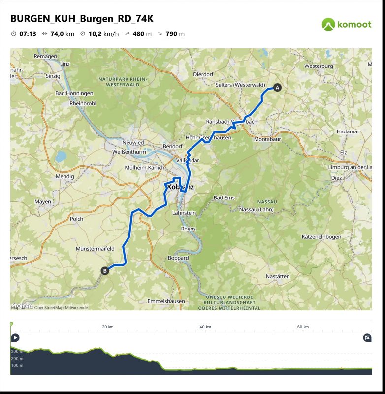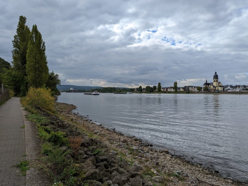 Bei bedecktem Wetter ging es gegen 10 Uhr in Kunidorf Richtung Westen das kleine Saynbachtal hinunter. Da es in Richtung Rhein keine direkte sicher befahrbare Radstrecke durch den Westerwald gibt und eine Rheinbrücke zur Querung angefahren werden muss, ist die Strecke, obwohl eigentlich bergab, recht anspruchsvoll. Immer wieder rechts/links durch die Ortschaften, die Verkehradern meidend dauert es, bis die Abfahrt von Höhr nach Vallendar erreicht ist. Nach Aufzeichnung kommen hier etwa 300 der 380 Höhenmeter der Tour zusammen. Der Rest ist Koblenz und der Mosel geschuldet. Die Fahrt durch Koblenz bis zum Beginn des Moselradwegs hinter Metternich ist auch nicht ohne Ansstrengung. Die Rückfahrt auf dem Radweg bis zum deutschen Eck ist da die bessere Variante.