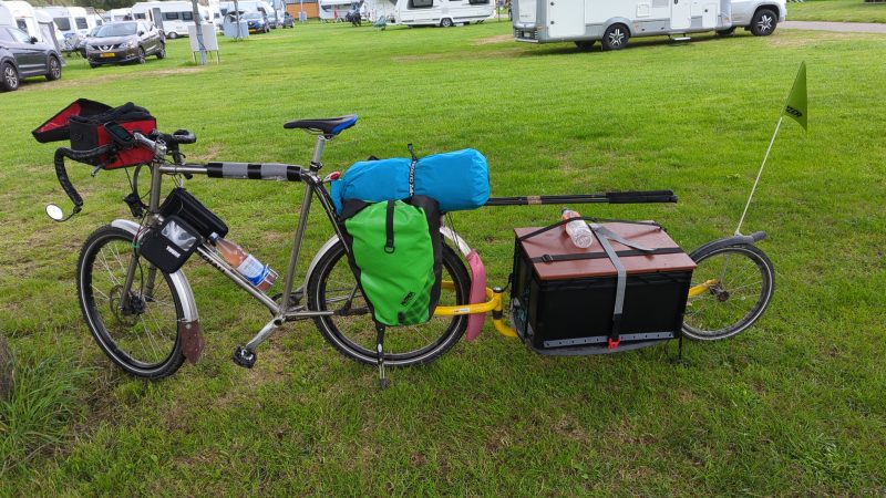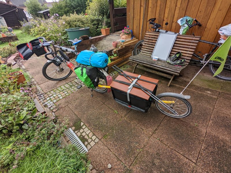 Liege- und Sitz- und Schlafkomfort sollte die Liege Uquip Moony liefern. Das Zelt war dann wieder das Bach Tipi. Mit Isomatte Innenfootprint wurde alles in eine hohe Eurobox mit Sitz(Holz)Deckel verstaut. Das Zelt musste zusammen mit den Wanderstöcken auf dem Gepäckträger verstatut werden. Der Schlafsack benötigt viel Platz, aber bei angekündigten Temperaturen von 0 Grad gehörte der auch zu der Komfortausstattung. Die Wäsche für die Laufrunde kommt in den Laufrucksack, die Wanderstöcke auf den Gepäckträger. Die Ortliebtaschen werden rechts mit dreckigen Sachen (Überschuhe, Werkzeug, Laufschuhe, Badeschuhe) und links mit Getränken, Lebensmitteln und Tageskleidung gefüllt.