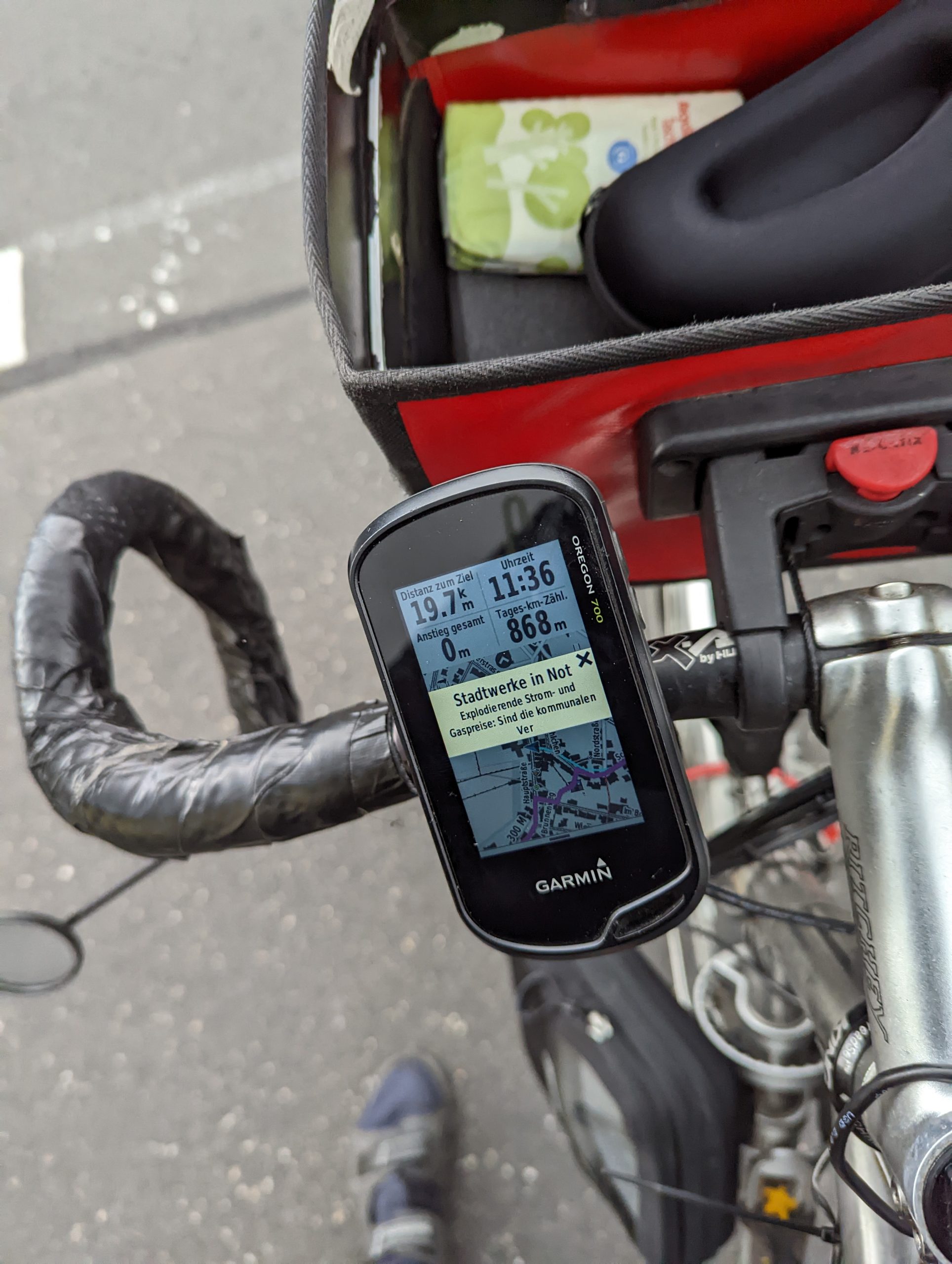 Den Strom stellen 3 Powerbanks am 75 Wh zur Verfügung. Geladen werden muss das Garmin Oregon, das Pixel 6 Smartphone und die Garmin Fenix 6. Für die 3 Tage reichen 1,5 Powerbanks. Der Oregon könnte auch durch die Fenix 6 im Navigationsmodus am Lenkerhalter ersetzt werden, wenn die Herzfrequenz durch den Brustgurt aufgezeichnet wird. Die Fenix war nach den 3 Tagen noch zu 40 Prozent geladen. Auf die Fenix gelangen die Strecken über das Garmin Connect Konto. In Outdooractive geplante Strecken werden von dort automatisch ins Garmin Konto übertragen und stehen auf der Uhr (ggf. durch aktive Übertragung in der Garmin Connect Smartphone App) zur Verfügung.