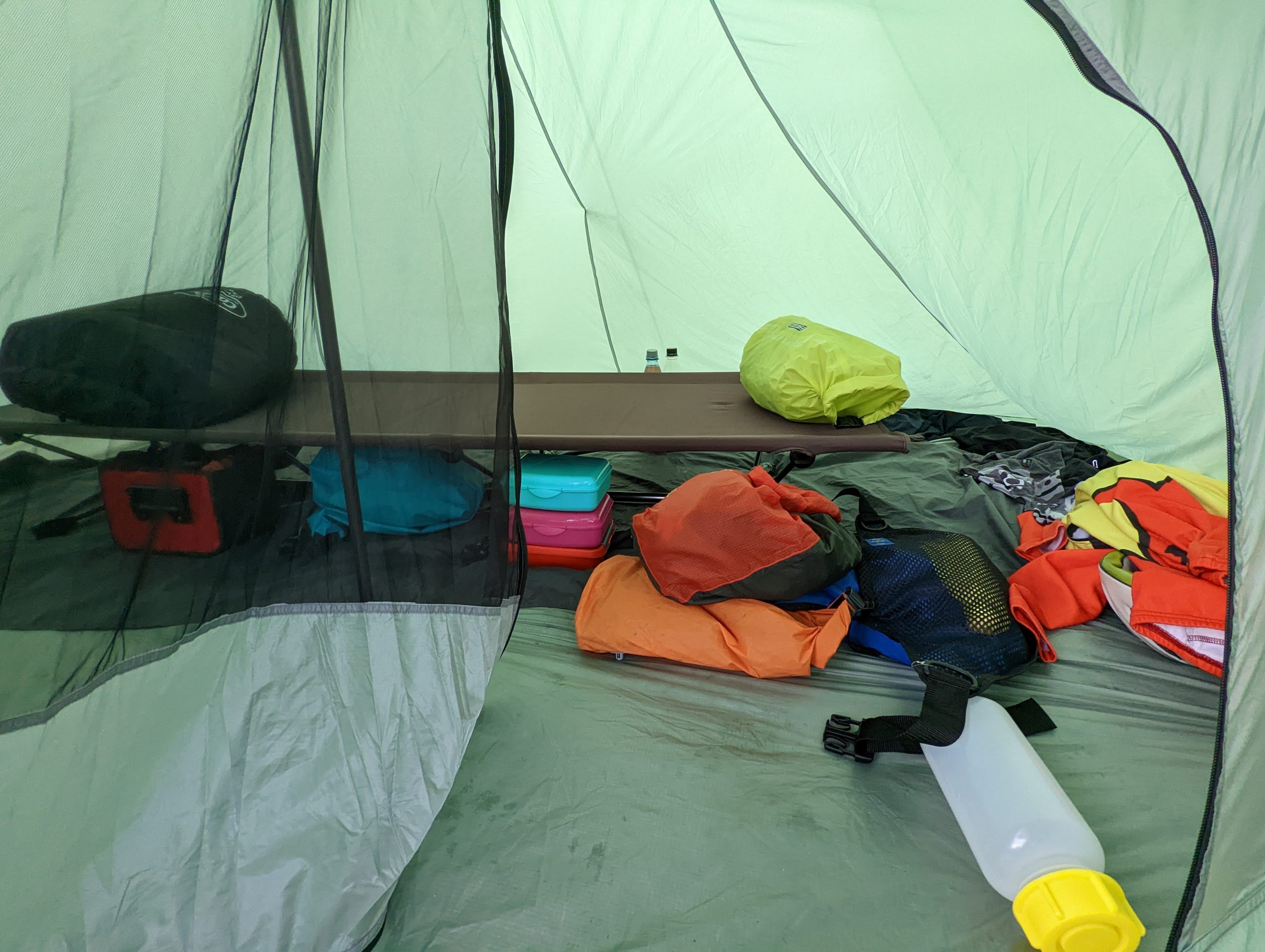 Zelt: Das Tipizelt bleibt für die Größe irgendwie unbequem. Die Liege ist für den Komfort recht schwer und so gut schläft man auf ihr auch nicht, wenn auch besser als auf mit der Luftmatratze dem Boden. Für den nächsten Ausflug habe ich daher über eine Variante mit Minizelt und Tarp mit Stuhl und zusätzlicher Luftmatratzenunterlage nachgedacht. Diese Kombination ist 3,5 kg leichter und mit dem Tarp könnte man sich vor dem kleinen Zelt ein komfortables Dach bauen, unter dem man auch mal im Sitzen essen oder planen könnte