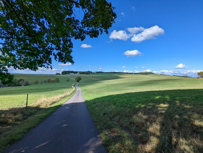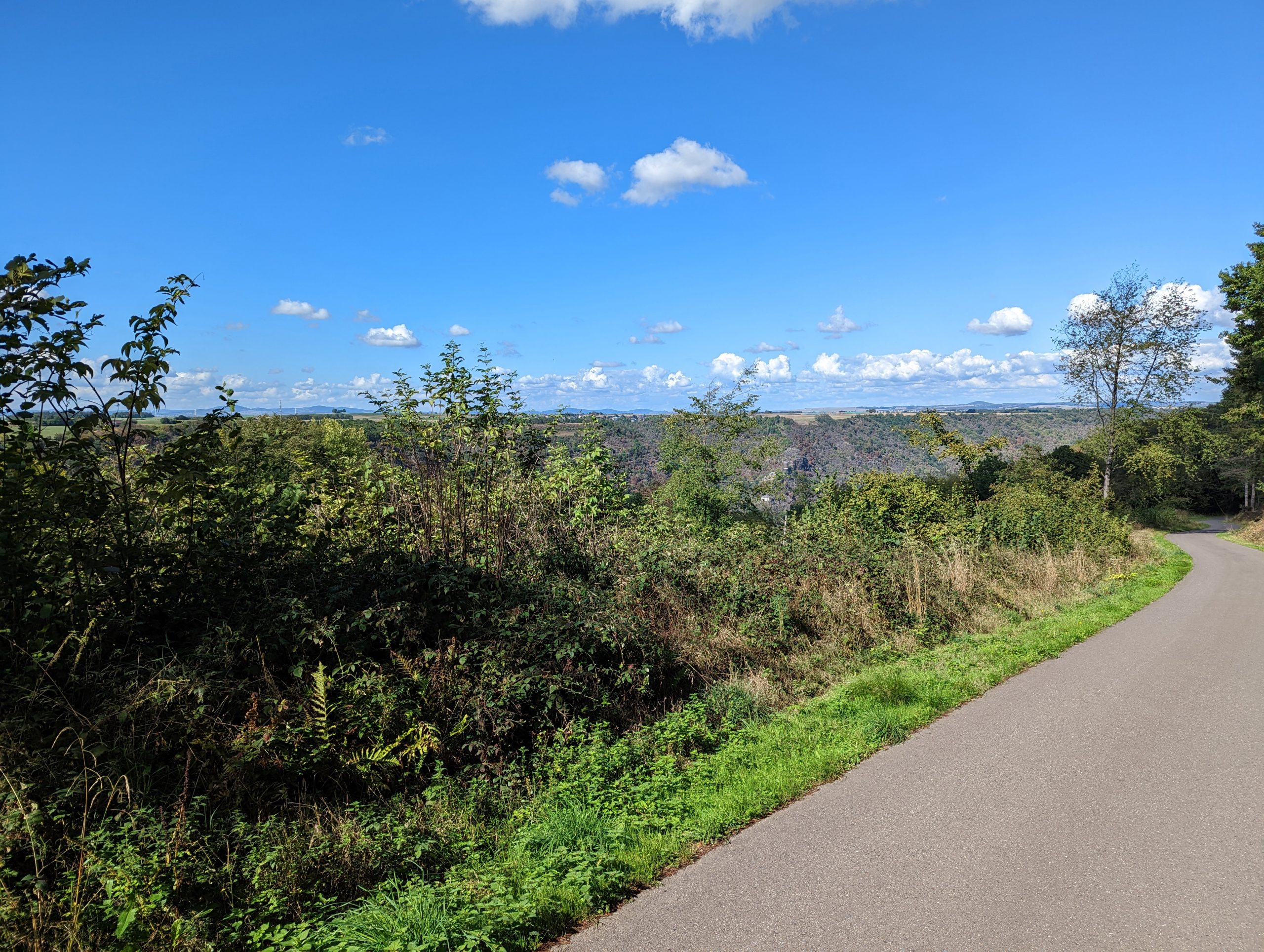 Inzwischen waren die Beine schwerer und die Treckingstöcke untertützen nur noch bergauf beim Wandern. Mit Rucksack und 1,5 Liter Wasser musste sparsam umgegangen werden, Zugang zum Trinkwasser war zeitlich gut verteilt über einen Flaschenschraubschlauch mit Mundstück gegeben. Inzwischen war es T-Shirt warm und sonnig, die Tourstrecke in Anspruch und Streckenführung herrlich. Hinter Macken ging es über eine alte Posttraßentrasse auf breitem Weg, teilweise geteert, zurück nach Burgen. Hier oben haben schon die Römer ihre Villen gebaut. Am Campingplatz war noch eine Stunde seit für eine Sonnenruhe auf der Liege. Was für ein Radtourluxus.