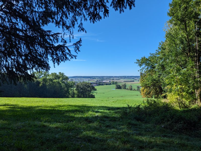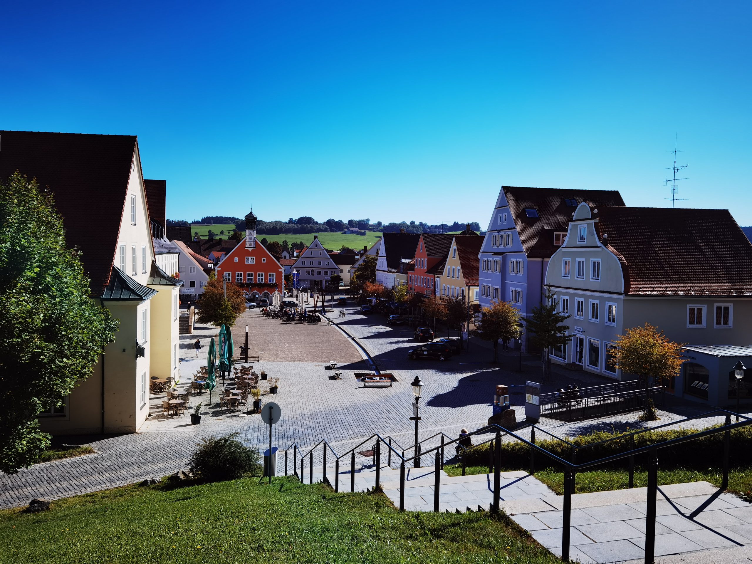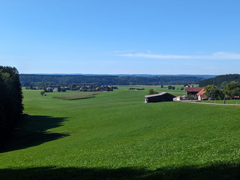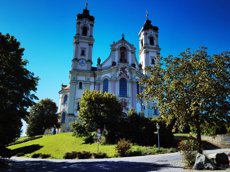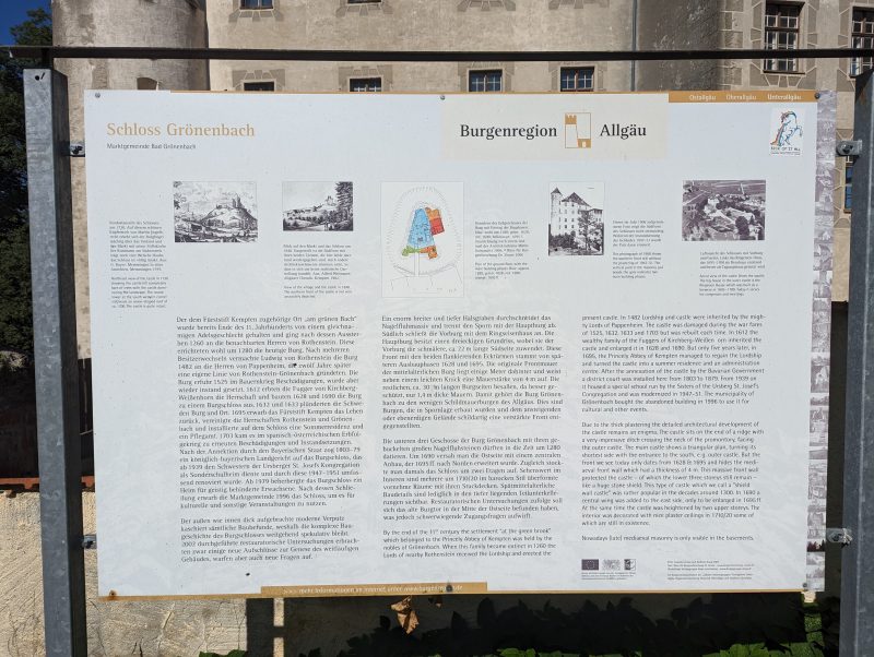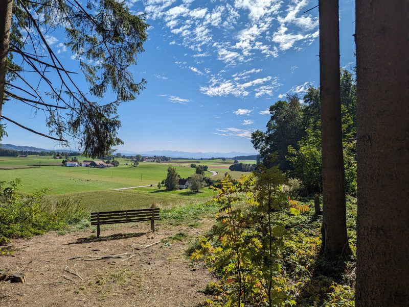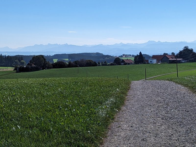 Bei dieser Tour führt sowohl der Hin- als auch Rückweg nach Bad Grönenbach über kleine Verbindungsstraßen. Außerdem fährt man auf dem Hinweg über einen langen Schotterweg entlang einer Kiesgrube. Die Aussicht “Kornhofer Bänke” südlich von Bad Grönenbach ist dafür aber umso lohnender, da man bei guter Sicht bis in die Berge schauen kann. Aufgrund der oben beschriebenen Wegführung entschließen wir uns, diese Etappe als Joggingrunde für Kunibert mit Faltradbegleitung durch Kunigunde zu gestalten. In Bad Grönenbach schieben wir dann das Rad und müssen es auch die Stufen hinauf zur Stiftskirche an manchen Stellen tragen.