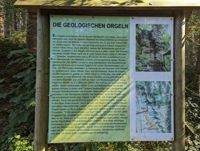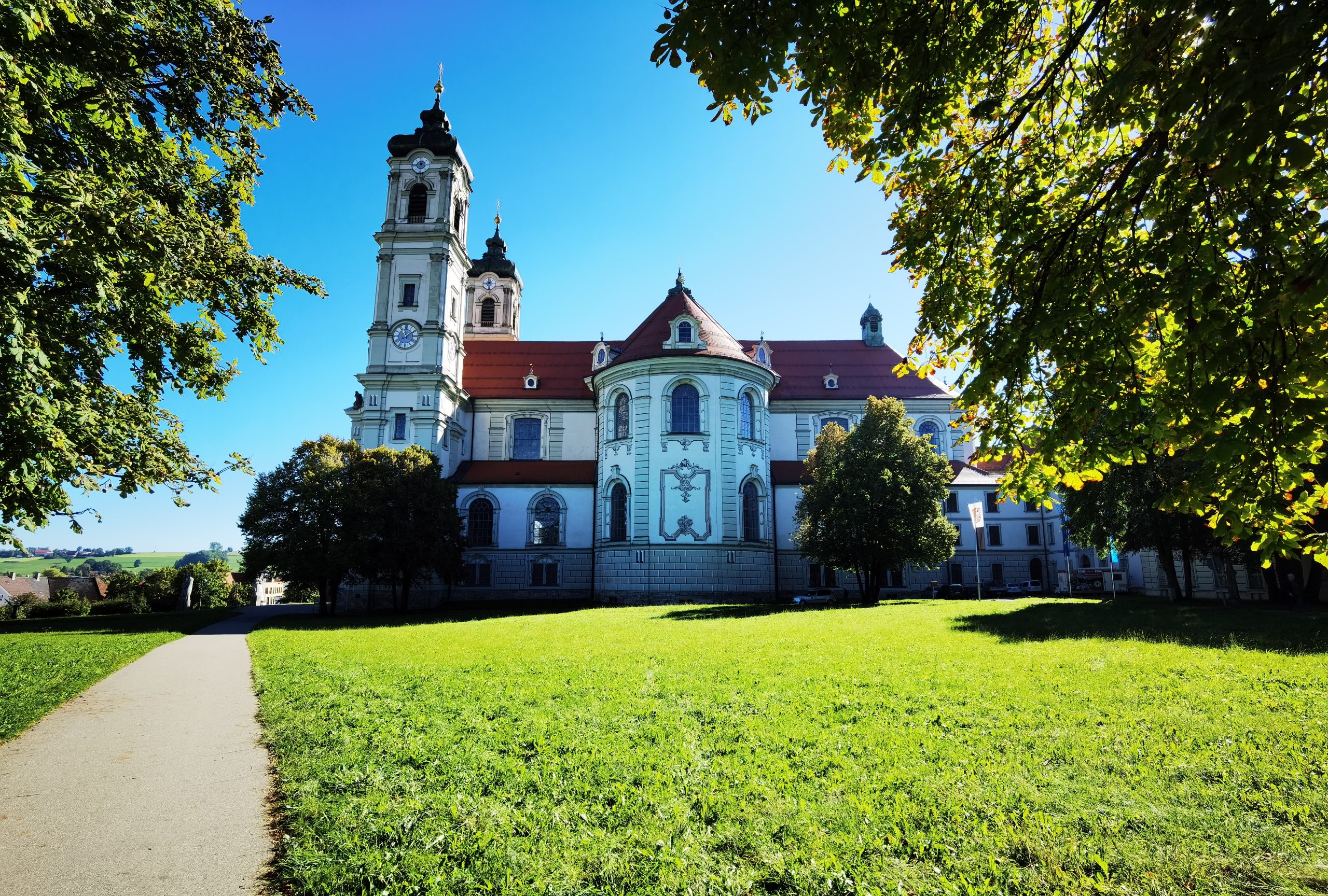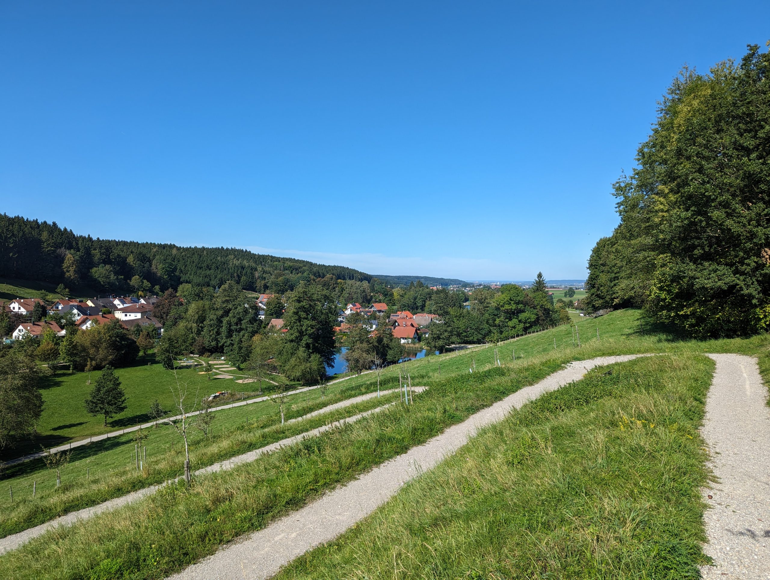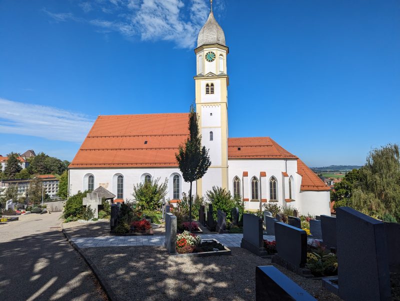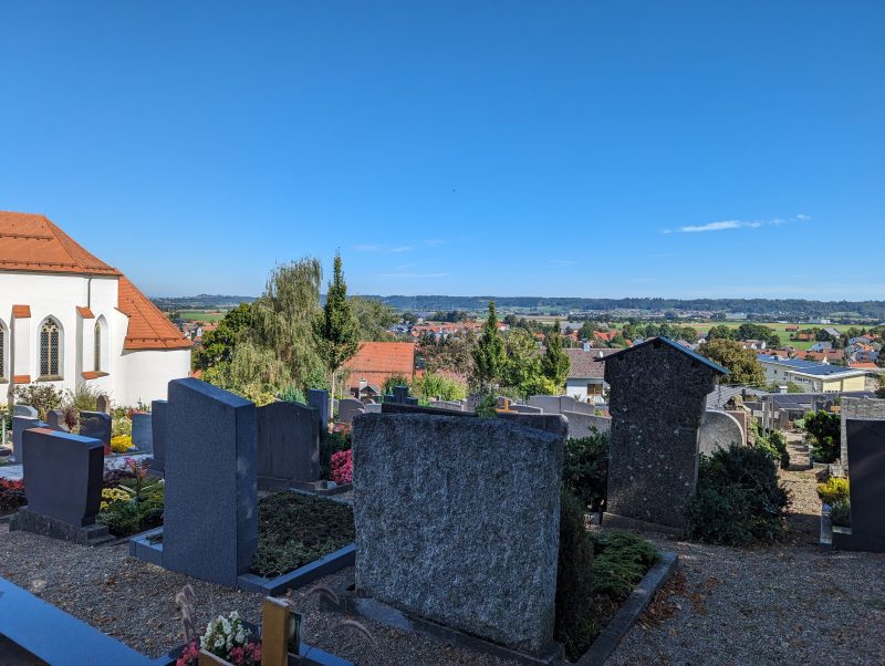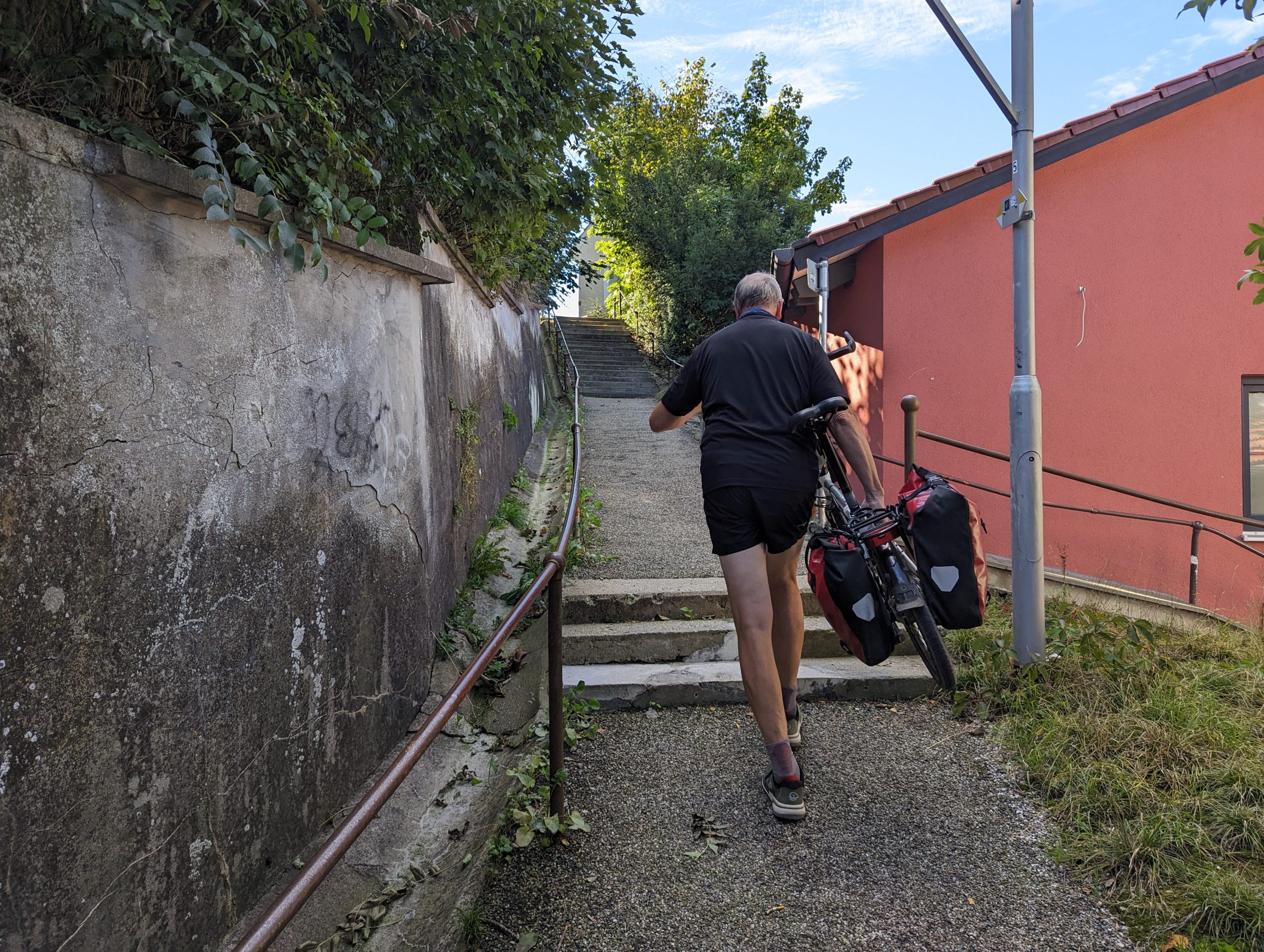 Bei dieser Tour führt sowohl der Hin- als auch Rückweg nach Bad Grönenbach über kleine Verbindungsstraßen. Außerdem fährt man auf dem Hinweg über einen langen Schotterweg entlang einer Kiesgrube. Die Aussicht “Kornhofer Bänke” südlich von Bad Grönenbach ist dafür aber umso lohnender, da man bei guter Sicht bis in die Berge schauen kann. Aufgrund der oben beschriebenen Wegführung entschließen wir uns, diese Etappe als Joggingrunde für Kunibert mit Faltradbegleitung durch Kunigunde zu gestalten. In Bad Grönenbach schieben wir dann das Rad und müssen es auch die Stufen hinauf zur Stiftskirche an manchen Stellen tragen.