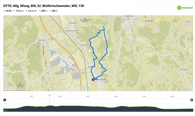 Die Tour wird gestartet an einem Parkplatz in Wolfertschwenden. Mit einem Wanderweg geht es zuerst durch den Wald hinauf nach Klessen und weiter durch den Wald bis hinauf zum Schieseenhof. Kurz vor Niebers treffen wir dann auf unserer Wiesengängerroute. Bis Mit ihr geht es durch den Wald wieder hinunter und vorbei an den “Geologischen Orgeln“. Dann durch Niederdorf und zurück nach Wolfertschwenden. Bis Niederdorf begleitet uns auch der Jakobsweg und der Kneipp-Wanderweg.