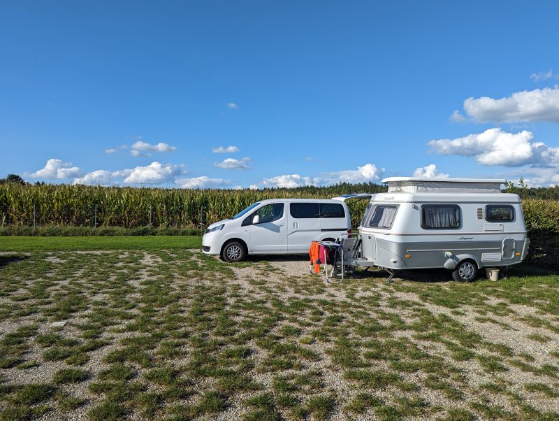 Die letzte Septemberwoche 2023 soll noch einmal richtig sonnig werden, wenn auch die Nächte schon herbstlich kühl sind. Somit beschließen wir, mit unserem kleinen Wohnwagen in den Unterallgäu zu fahren, da er doch mehr Komfort bietet, als unser Minicamper mit Busvorzelt. Von dort aus ist man den Bergen schon ganz nahe, die wir seit langer Zeit nicht mehr gesehen haben. Wir wählen den Campingplatz Ottobeuren aus und hoffen, dort noch einen freien Platz zu bekommen.