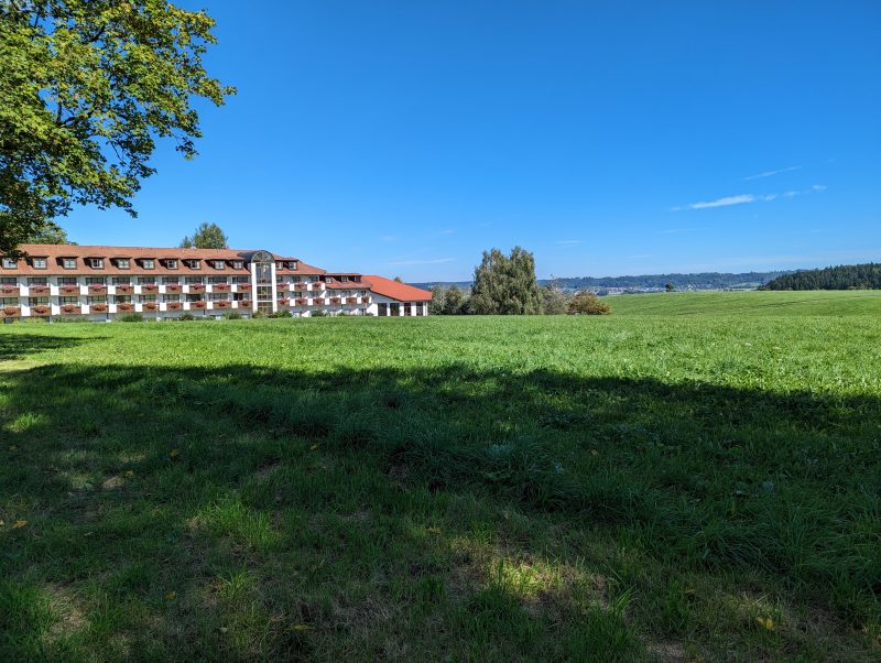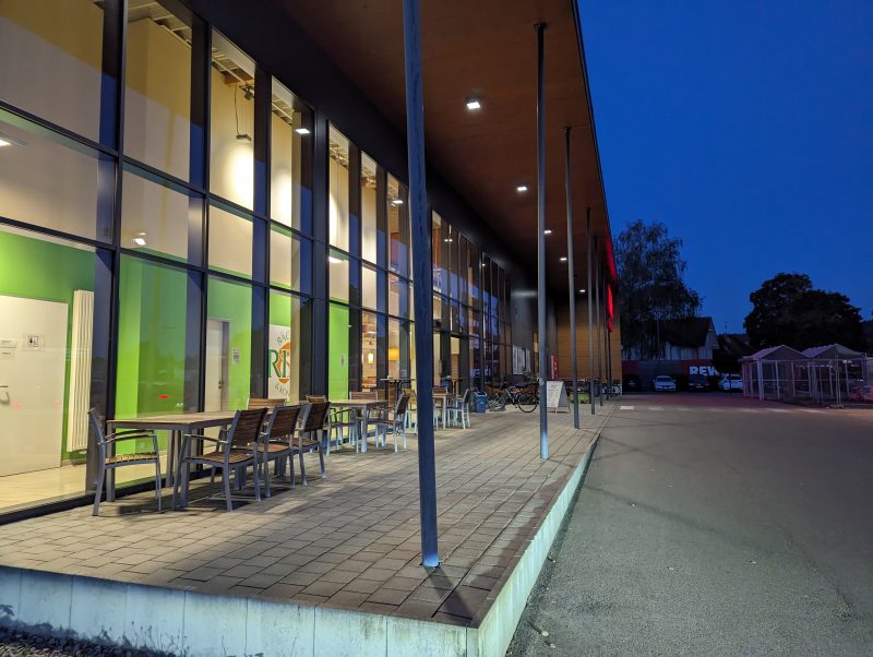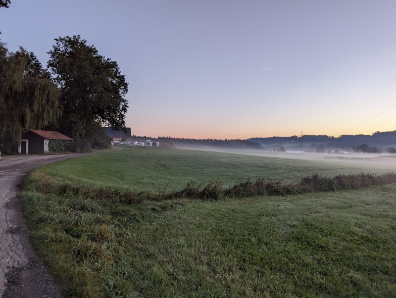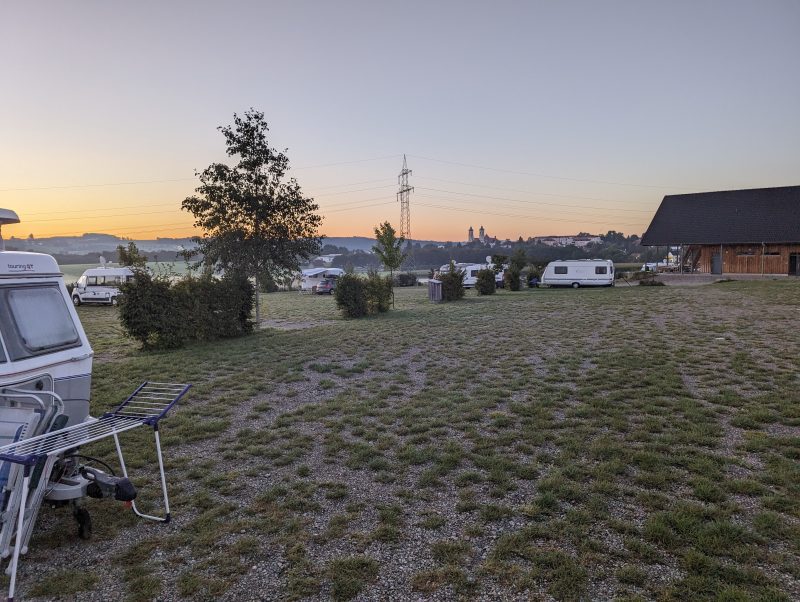 Der Platz wird als hundefreundlich beworben und die Hundebesitzer waren wohl auch in der Überzahl. Außer regelmäßigen Bellattacken bei vorbeiziehenden Gassigängern war das aber kein Problem. Die Menschen rings um meinen Online gebuchten Platz waren bis auf zwei Exemplare unauffällig. Erst Lautsprecher mit abendlichem Würfelspiel (rüttel, rüttel, rums) und dann direkt hinter mir zwei befreundete Familien, die Neuigkeiten aus den Generationen währen der zwei Tage Anwesenheit in Theaterbühnenlautstärke vortrugen. Es war einer dabei, der wohl die letzten Wochen nicht viel zu sagen hatte und daher ununterbrochen auch in 20 Metern Entfernung deutlich verständliche Aussagen in die Welt sendete, die zu hören erst die Ohrhörer mit eingeschaltetem ANC unverständlich werden lies. Allerdings war gegen 22 Uhr Ruhe, das war ja schon mal was.