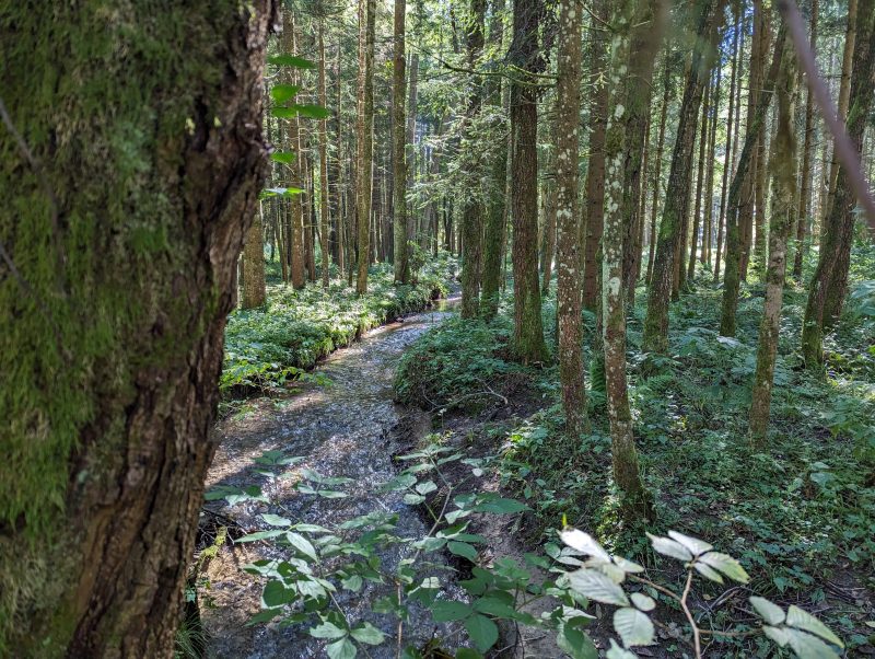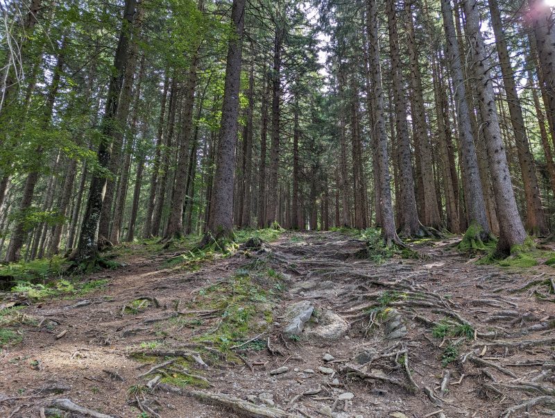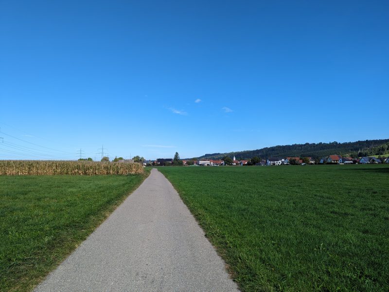 Der Anstieg auf der westlichen Seite führt über ein paar Seitentalwellen stetig bergan. Die Stimmung ist super, die Beine fressen vergleichsweise freiwillig die Steigungshöhenmeter und die Augen geniessen die Einsamkeit und Stille des wolkenverhangenen Morgen und geniessen die Ankundigung eines sonnigen Spätsommertages. Kleine Ortschaften wechseln mit Feldern, Wiesen und Wäldern. Es rollt gut auf den kleinen Sträßchen, allein mit zwei Rädern ohne Verfolger im Rückspiegel. Stille am Ohr.