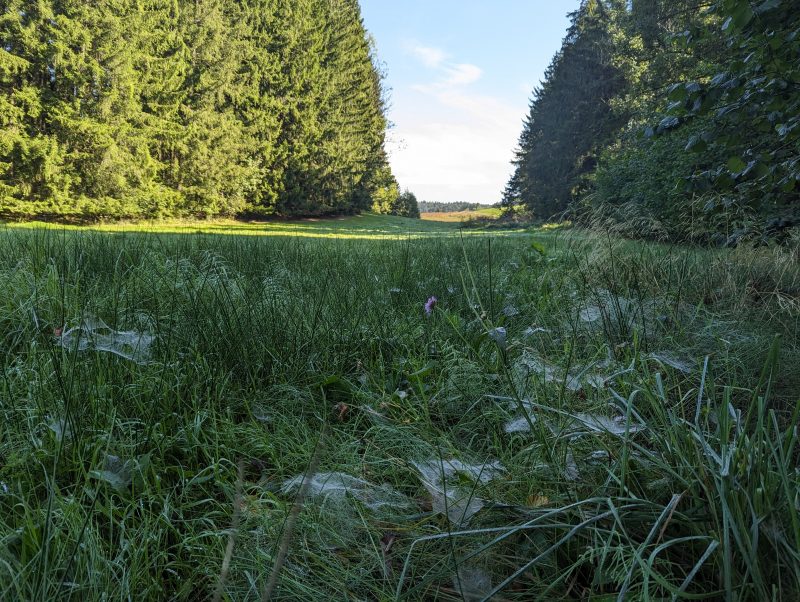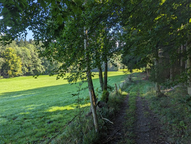 Am Sonntag geht es ohne Lauf gleich nach dem Frühstück auf zur letzten Runde. Es ist nach dem Regen in der Nacht noch feuchtnebligdampfig bei schon 17 Grad. Noch einmal nach Norden bis nach Waxweiler, wo dann auf alter Bahnstrecke der leichte Teil des Prümtalweges beginnt. Statt den für eine 100’er Runde zu nutzen biegt die Streckenplanung auf kleinen Straßen wieder nach Süden ab, um das Prümtal auf seinem östlichen Höhenzug zu begleiten.