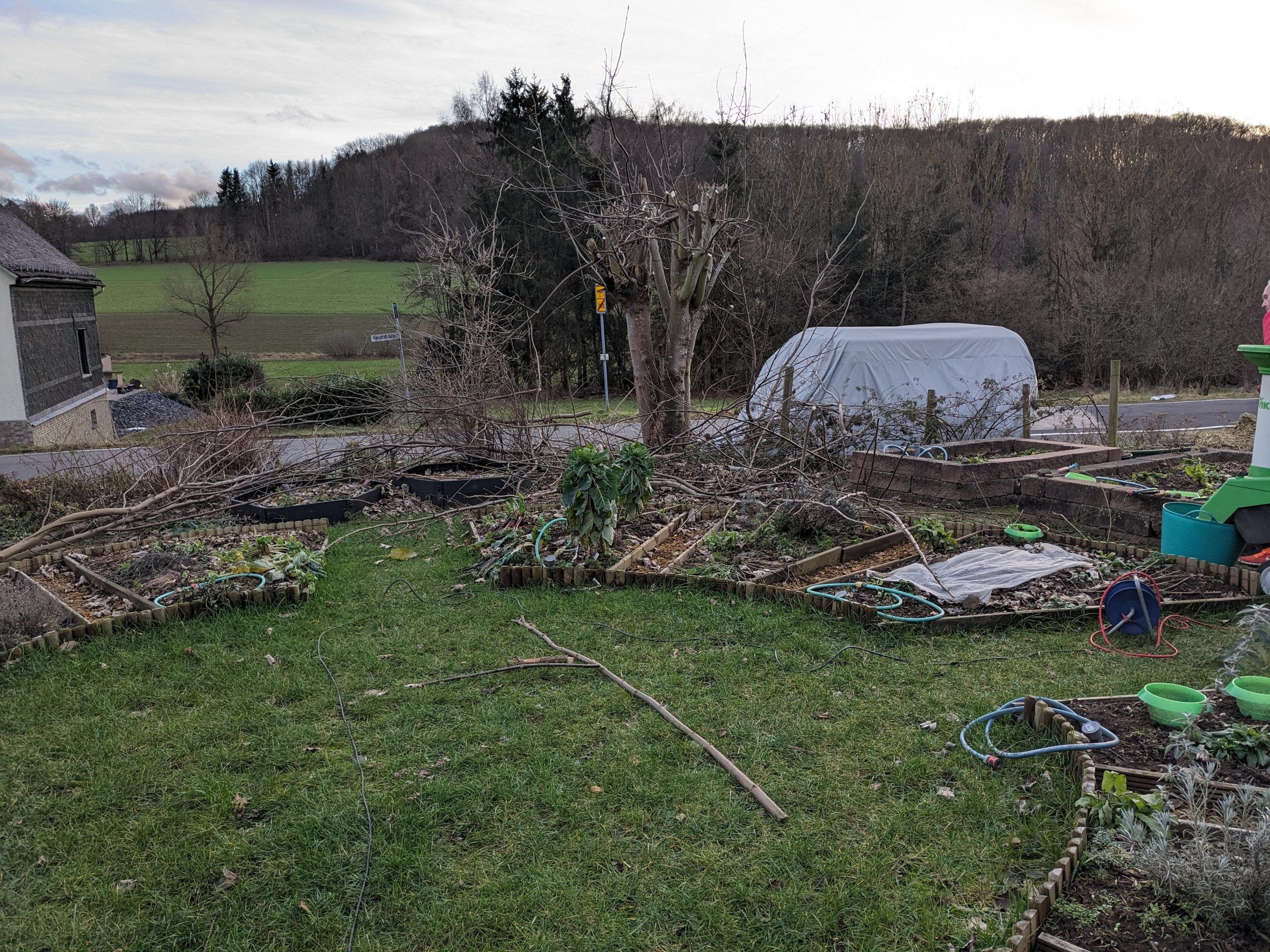 Anfang Januar wird noch die letzte Steckrübe und Sellerieknolle ausgegraben. Palmkohl und Pak Choi können ebenfalls noch geerntet werden. Sobald es dann auch kalt und frostig wird, beginnen Kunibert und Kunigunde die Heckensträucher zu schneiden. Im letzten Jahr sind alle Hecken aufgrund der Beetneugestaltung nicht geschnitten worden, somit ist der Bedarf jetzt groß. Die dickeren Zweige kleingeschnitten und in Kisten gesammelt, sie dienen als Anmachholz für den kommenden Winter. Auch der zu groß gewachsene Ahornbaum muss deutlich gekürzt werden.