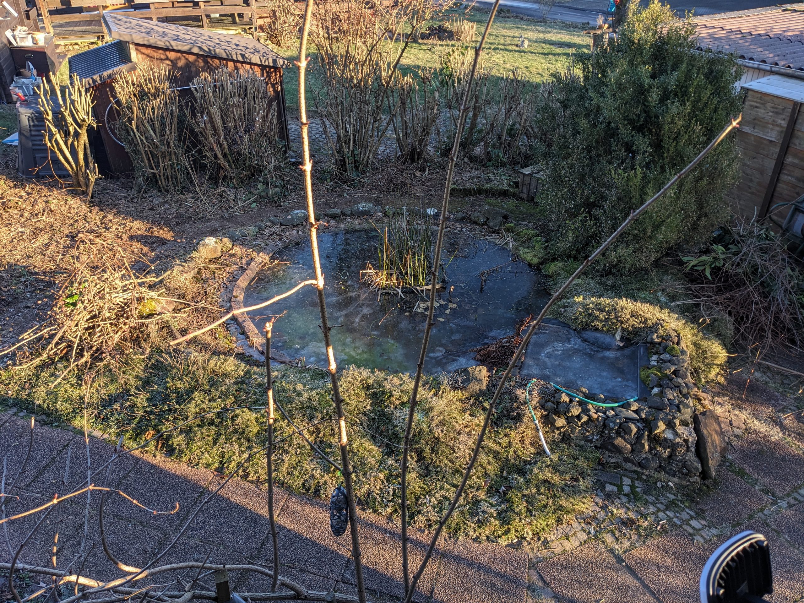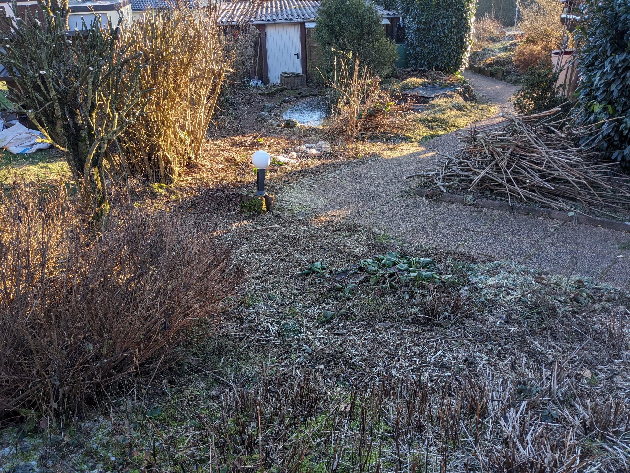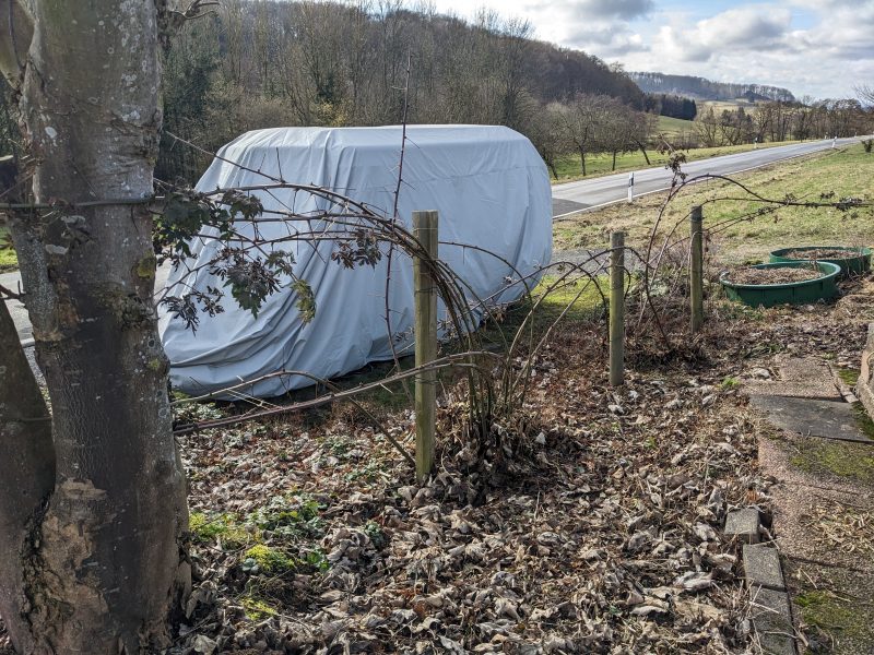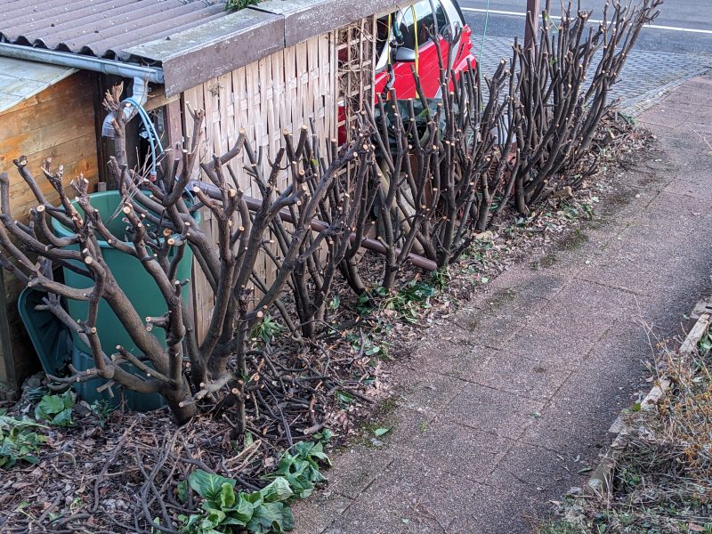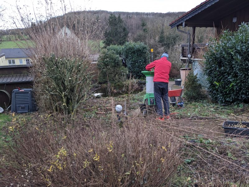 Ende Februar schaffen wir es auch noch, die Kirschlorbeerhecke am Carport bis auf 1,50 m zu kürzen. Aufgrund der Höhe und der Länge dieser Hecke braucht das Zerkleinern der Äste und das Häckseln der Blattmasse aber einige Zeit.