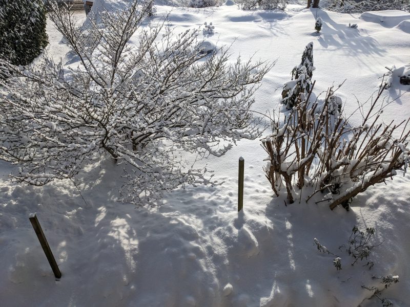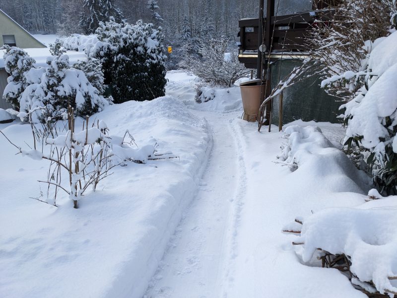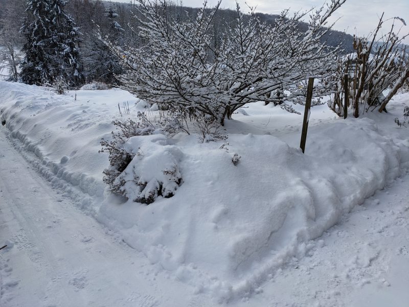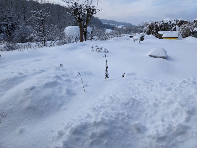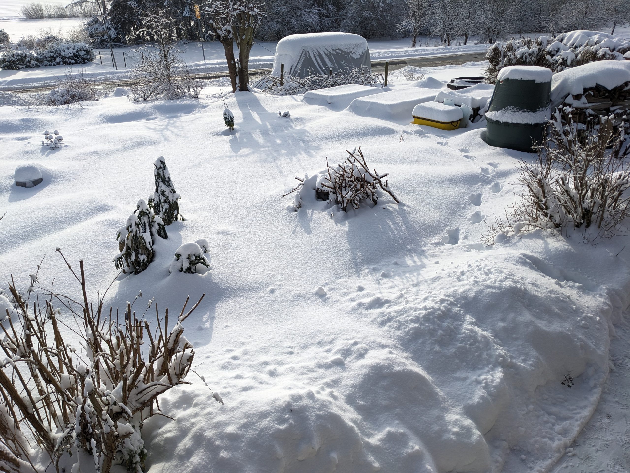 Mitte Januar kommt es dann aber wieder zu einem massiven Schneeeinbruch und die Arbeit an den Hecken muss nun erst einmal ruhen. Die Schneehöhe beträgt über 25 cm und mehrmals täglich muss Schnee geräumt werden. Kunigunde nutzt die Zeit, um ihr Saatgut zu sichten, fehlendes Saatgut zu bestellen und vor allem, um einen neuen Gartenplan für das kommende Gartenjahr zu entwerfen mit der fryd-App.