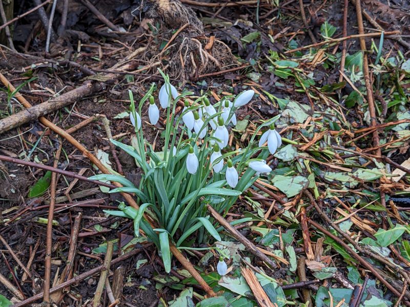 Anfang Februar kommen nun die ersten Schneeglöckchen hervor. Die Zaubernuss blüht und auch der Winterschneeball beginnt mit seiner Blüte. Nun schafft Kunigunde es, die Brombeerhecke für das neue Erntejahr vorzubereiten. Alle getragenen Ruten müssen abgeschnitten und die neuen wieder angebungen werden. Dabei müssen die neuen Ruten in diesem Jahr massiv gekürzt werden, sie sind einfach zu lang geworden.