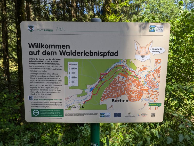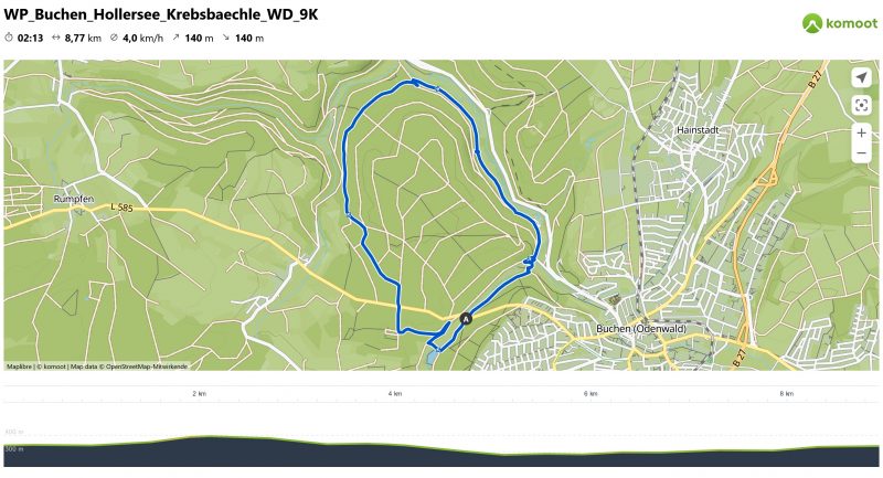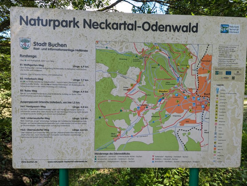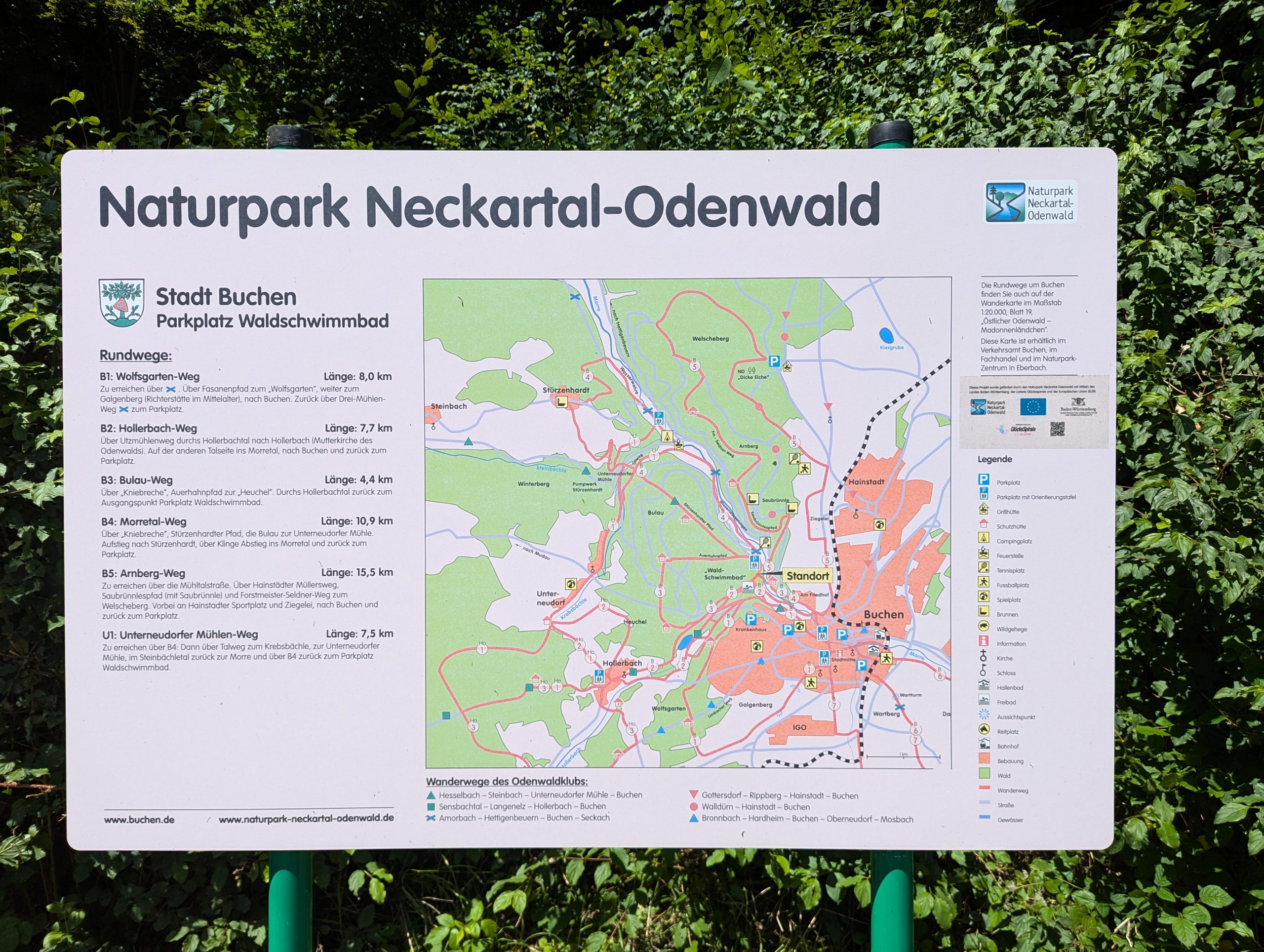 Unsere Tour beginnt am Wanderparkplatz bei der L585 kurz vor Buchen. Hier beginnt ein Walderlebnispfad, dem wir aber nur kurz zu Beginn und am Ende der Tour folgen. Kurz vor dem Hollersee biegen wir in den Wald hinein und wandern den Berg hinauf. Wir bleiben immer im Wald bis wir auf den HW35 stoßen und dem Morre-Jagst-Weg. Mit ihm geht es zum Waldschwimmbad und von dort mit der Walderlebnispfad zurück zum Ausgangspunkt.