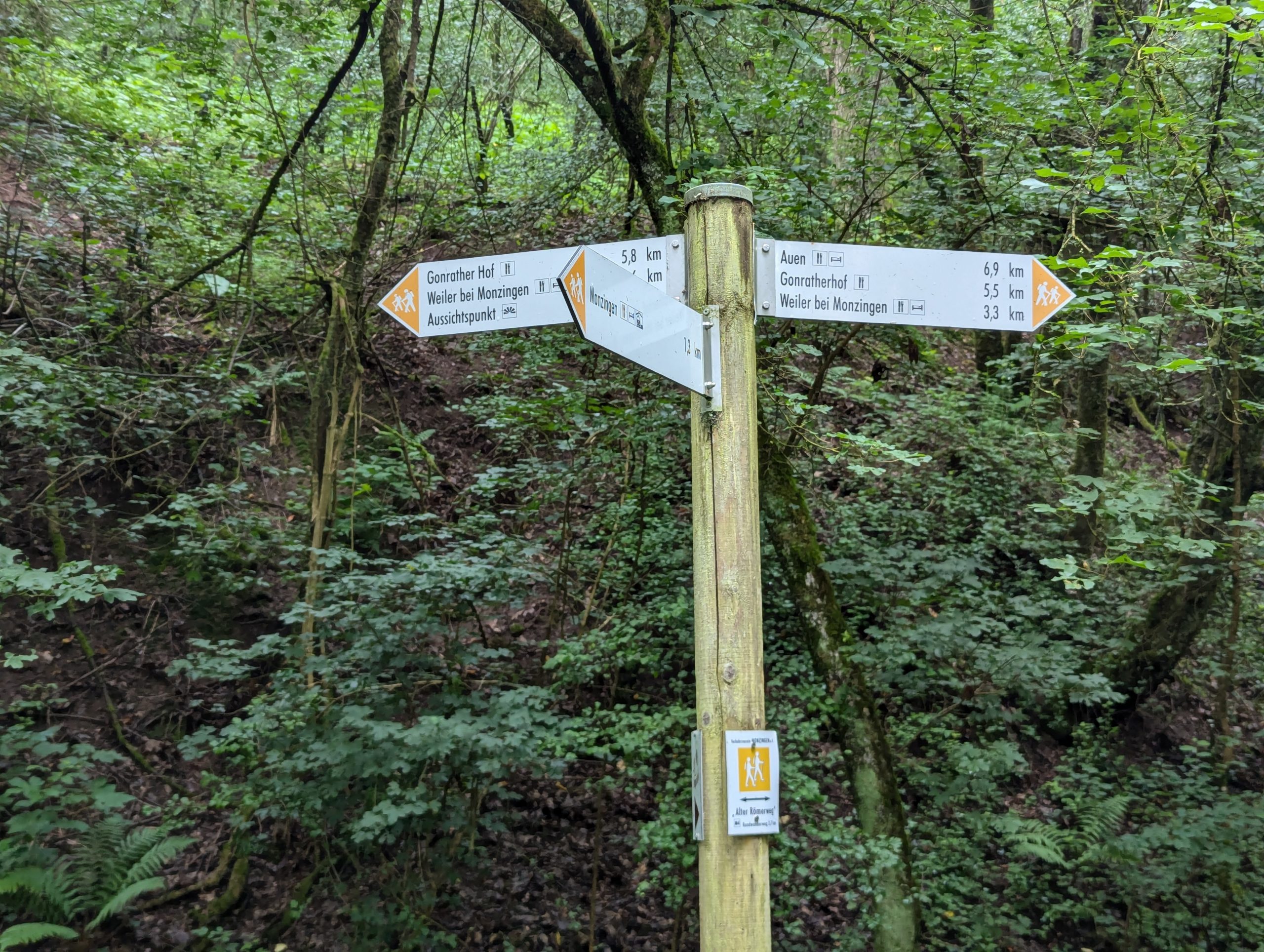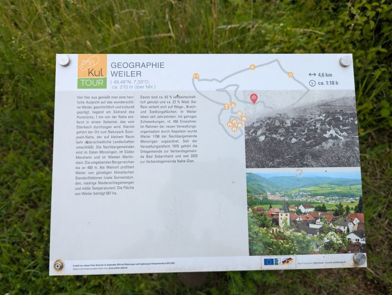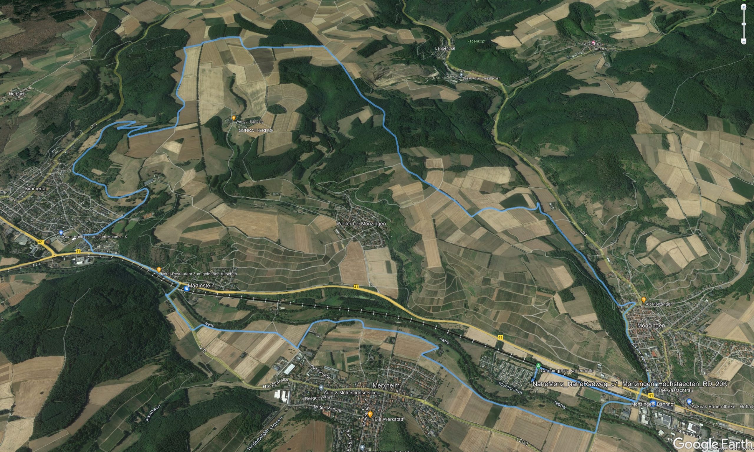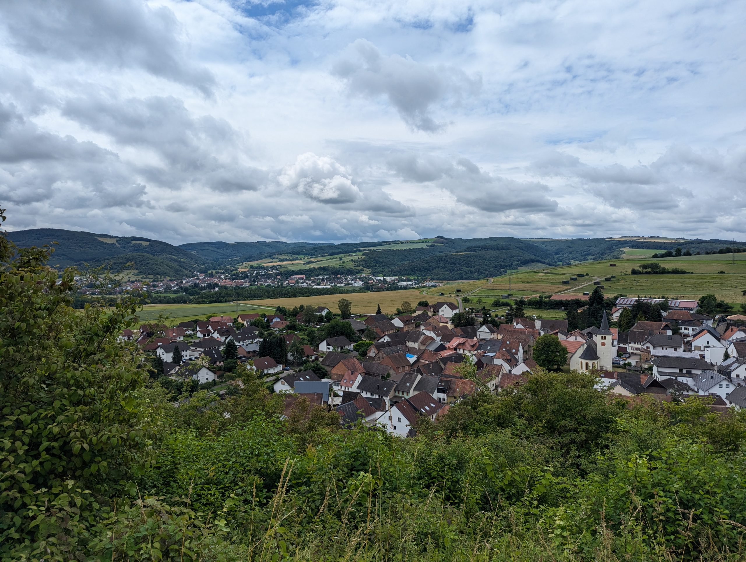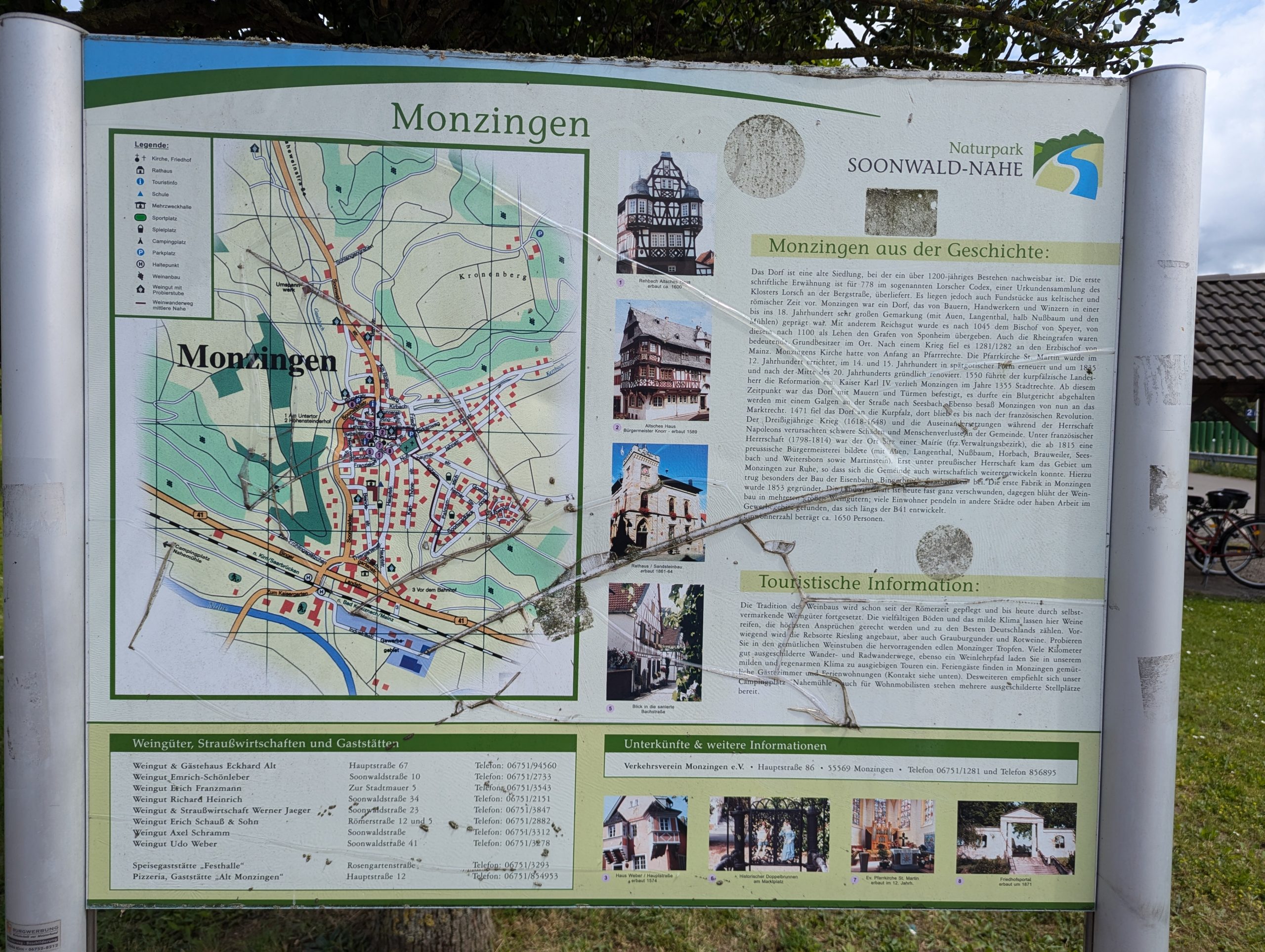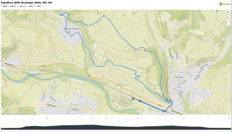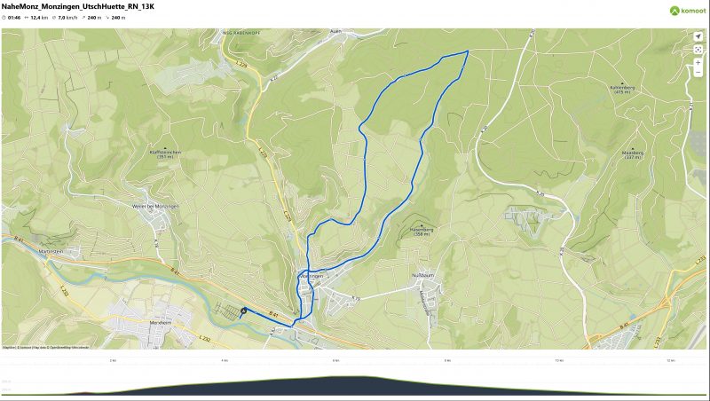 Diese Tour ist als Wanderung geplant. Wir nutzen sie aber als Laufrunde mit Radbegleitung. Vom Campingplatz geht es zuerst durch die Monzinger Altstadt, am Friedhofsportal und der St. Martinskirche vorbei. Dann die Bergstraße vorbei an Feldern und zum Schluss in den Wald hinein bis zur UtschHütte. Hier haben wir den höchsten Punkt der Tour erreicht. Dann geht es zuerst über einen groben Schotterweg im Wald und anschließend über einen Teerweg hinunter bis nach Monzingen und zurück zum Campingplatz.