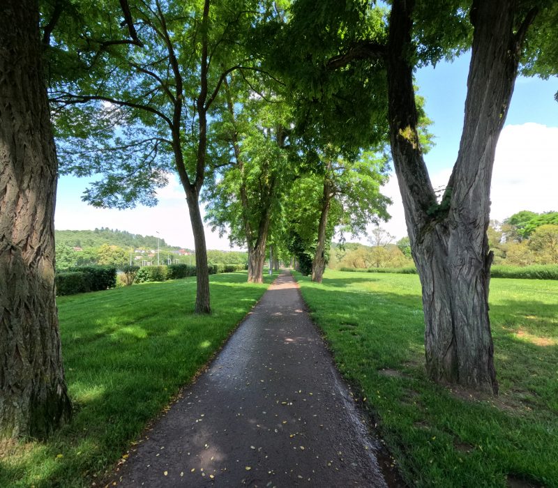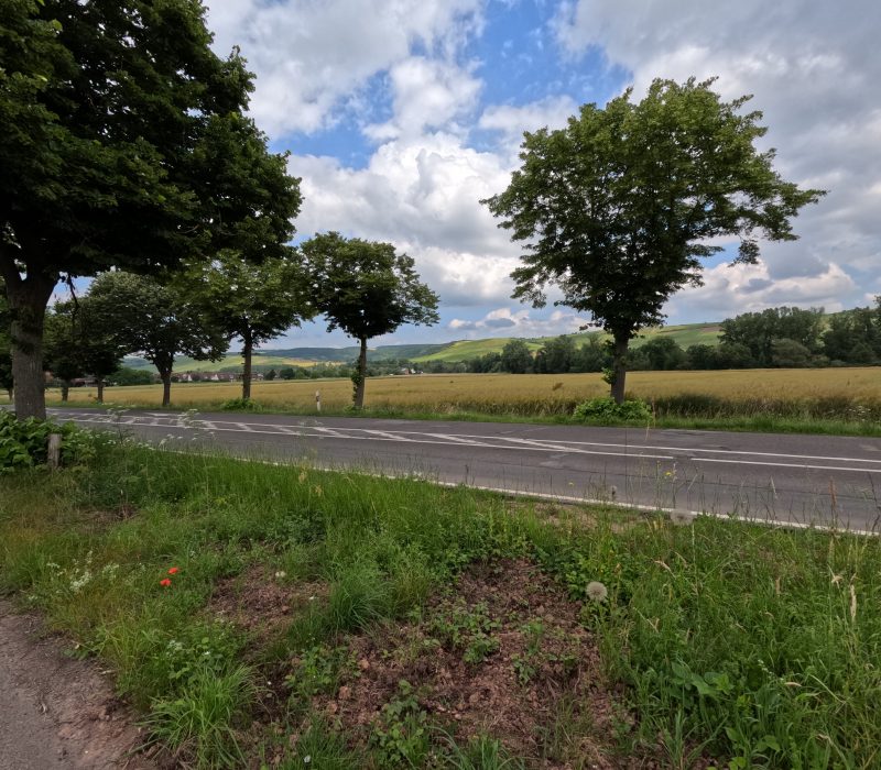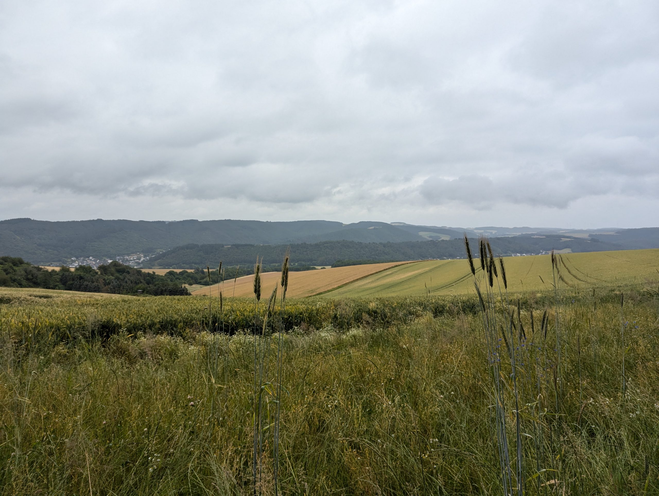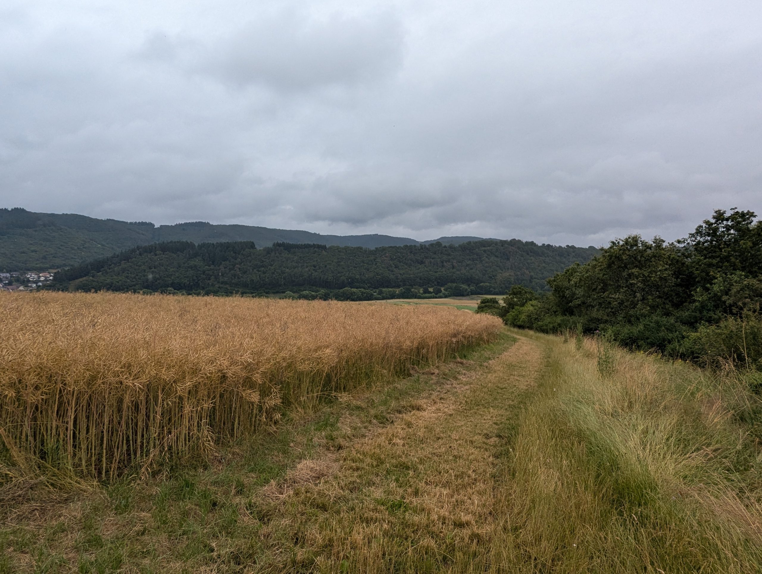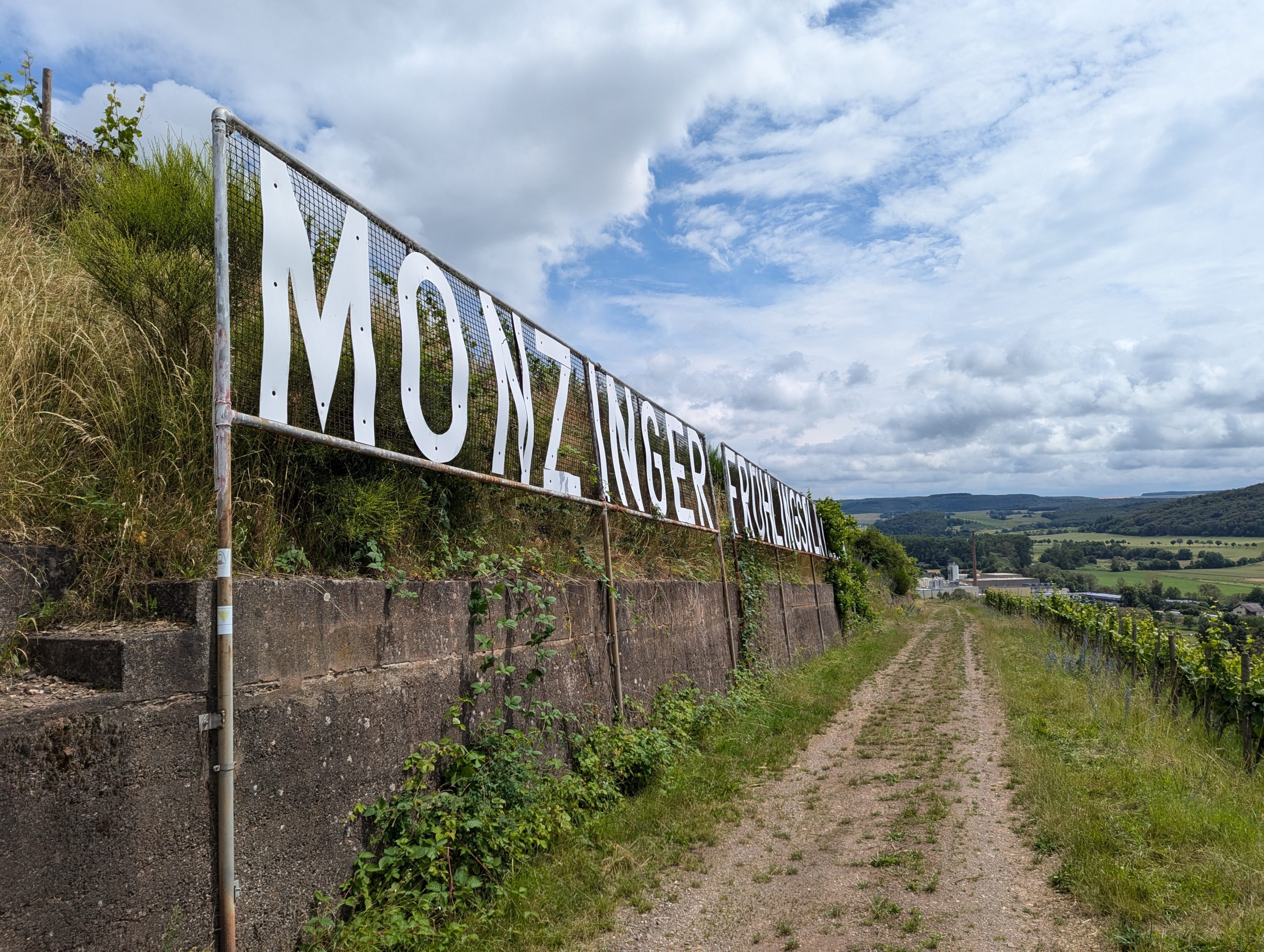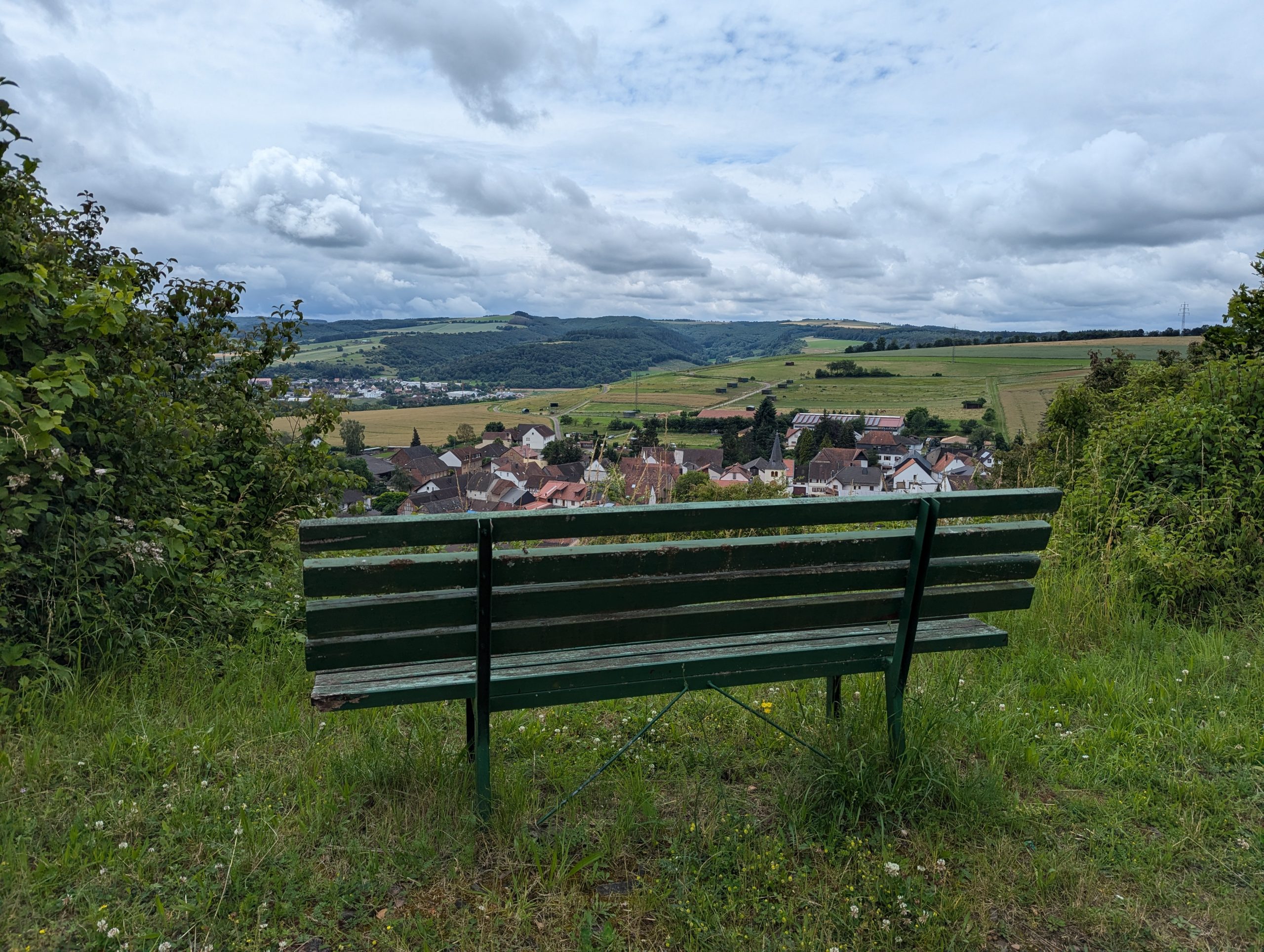 Diese Tour ist als Wanderung geplant. Wir nutzen sie aber als Laufrunde mit Radbegleitung. Vom Campingplatz geht es zuerst durch die Monzinger Altstadt, am Friedhofsportal und der St. Martinskirche vorbei. Dann die Bergstraße vorbei an Feldern und zum Schluss in den Wald hinein bis zur UtschHütte. Hier haben wir den höchsten Punkt der Tour erreicht. Dann geht es zuerst über einen groben Schotterweg im Wald und anschließend über einen Teerweg hinunter bis nach Monzingen und zurück zum Campingplatz.