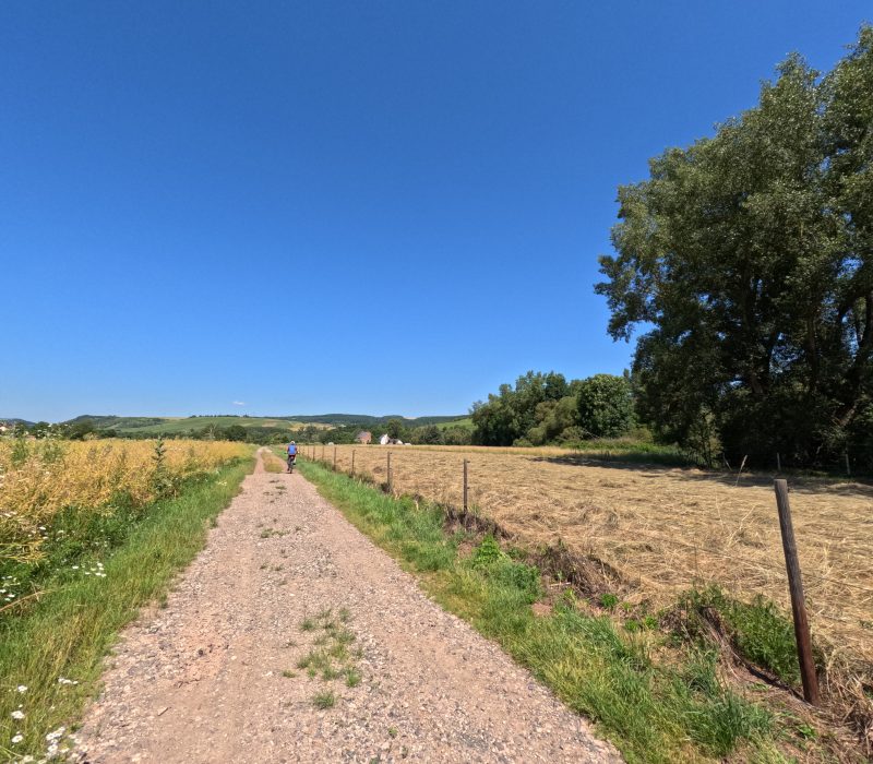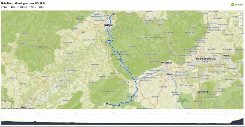 Am Mittwoch geht es wegen eines Termins mit dem Auto zurück nach Kunidorf. Die folgenden zwei Tage werden zu einer Trainingsfahrt zum Campingplatz mit Rückfahrt am Folgetag (bis Hoer) genutzt. Es ist schwül-warm und schon der Hinweg zieht sich. Die fast 150 km mit dem Rad durch das Rheintal werden vor allem durch den zu entsorgenden Stufensattel zur Qual. Besonders schnell geht es auch nicht voran. In der Nacht ist es im Wohnwagen warm und so wird die Rückfahrt auch wegen des sich verstärkenden sehr warmen Westwindes kein Vergnügen. Nach dem ersten Anstieg in Vallendar vo Rhein in den Westerwald ist diese Trainingsrunde dann am späten Nachmittag nach 275 km und zwei Tagen beendet. Aber vielleicht hat es doch ein wenig die Kondition verbessert. Der Wasserverbrauch unterwegs war jedenfalls ganz ordentlich.