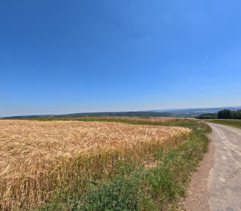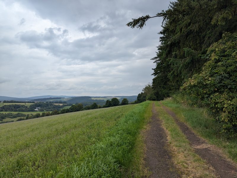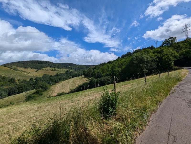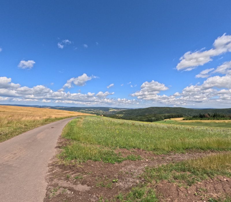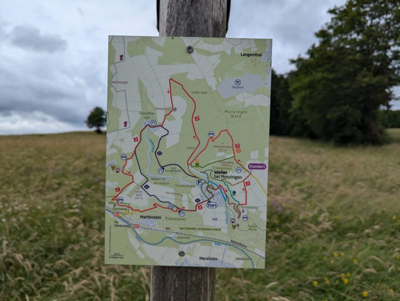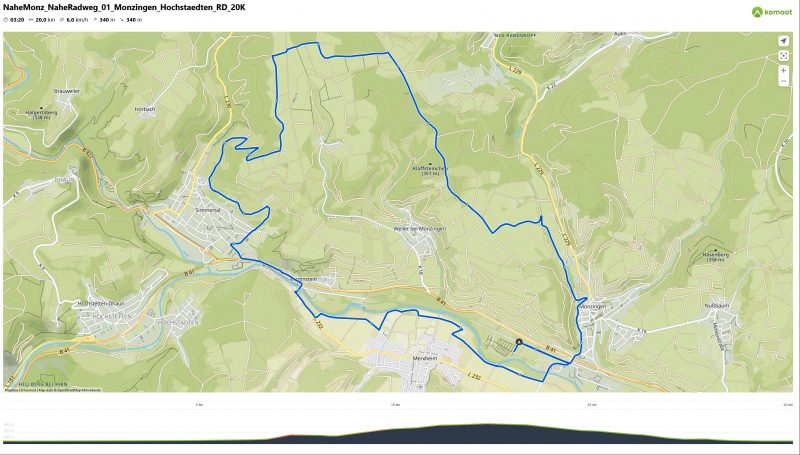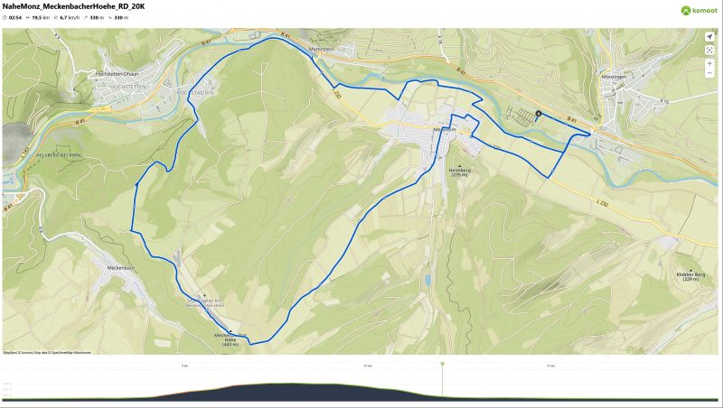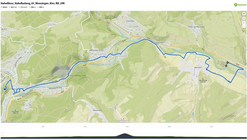 Auch diese Tour geht vom Campingplatz aus. Wir fahren zum Nahe Radweg, biegen aber direkt hinter dem Fluss in den Feldweg ein, der uns bis zur Weinelsmühle führt. Dort treffen wir auf die Fahrradweg-Umleitung, die aufgrund von Straßenbauarbeiten in Merxheim eingerichtet worden ist. In Martinstein geht es auf dem Bürgersteig entlang der Bundesstraße bis Franzhof. Von dort aus fahren wir den Berg hinauf um Simmertal herum und weiter in Kehren hinauf bis zu den Höhen den Habichtskopfes. Hier gibt es entlang des Waldes weite Aussichten in das Land hinein. Danach folgt eine lange Abfahrt, zuerst am Weiler bei Monzingen vorbei und weiter bis Monzingen.