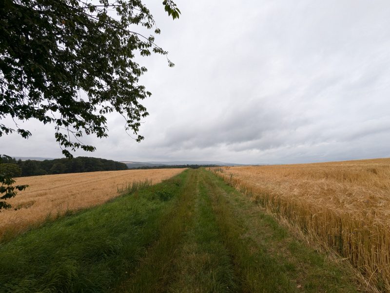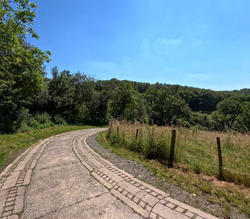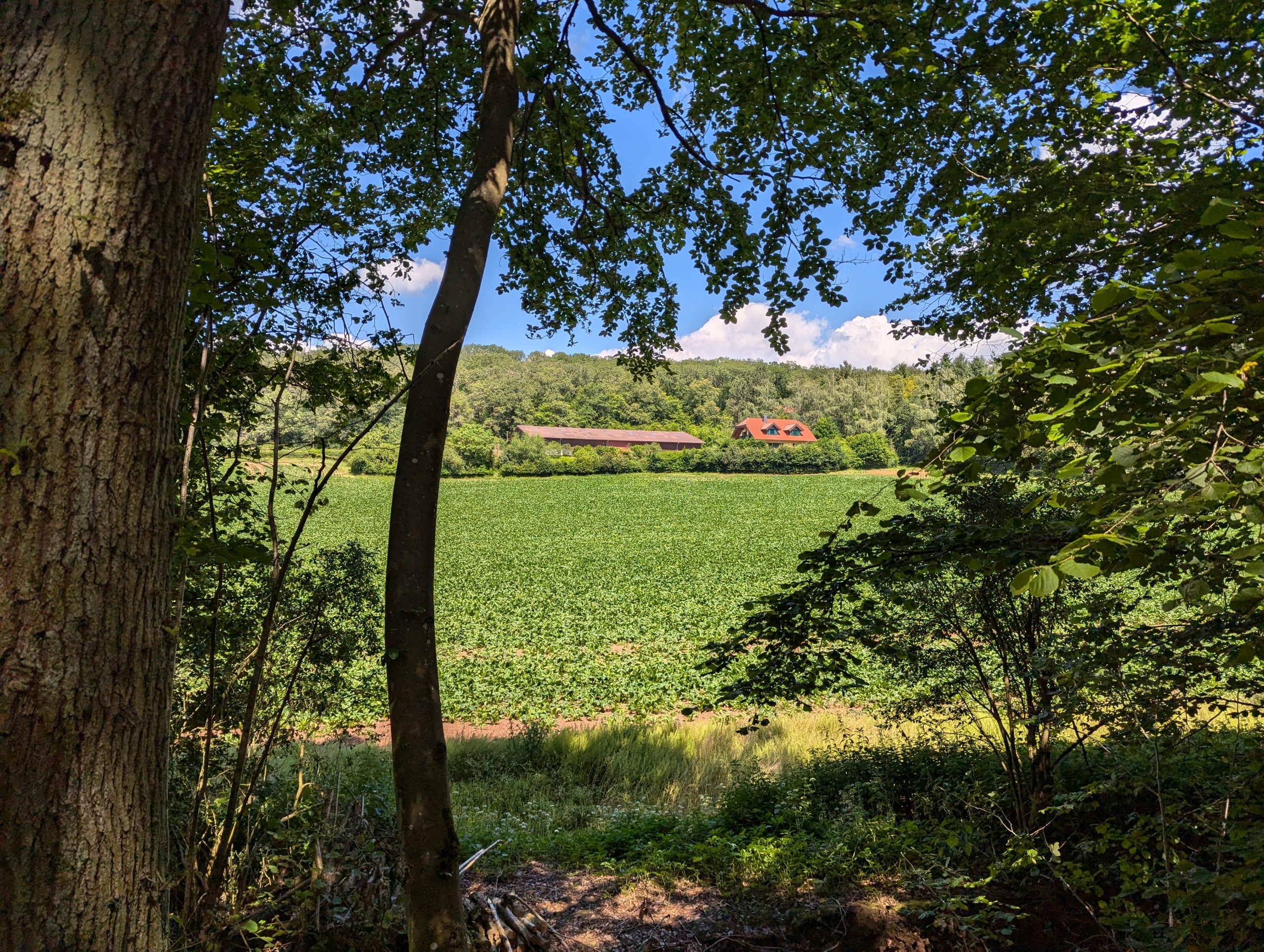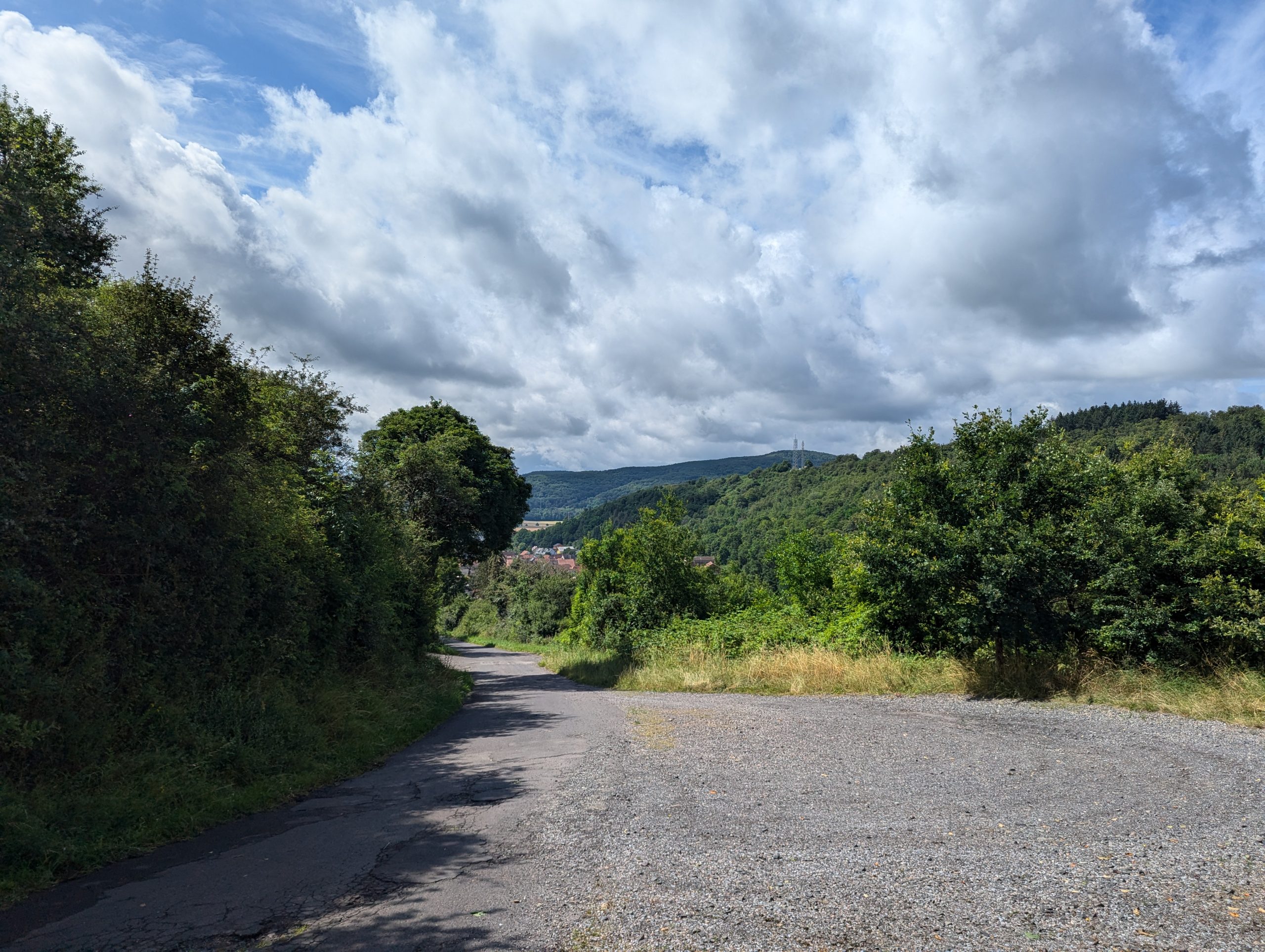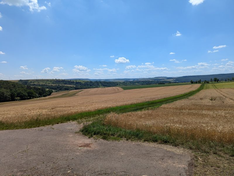 Auch diese Tour geht vom Campingplatz aus. Wir fahren zum Nahe Radweg, biegen aber direkt hinter dem Fluss in den Feldweg ein, der uns bis zur Weinelsmühle führt. Dort treffen wir auf die Fahrradweg-Umleitung, die aufgrund von Straßenbauarbeiten in Merxheim eingerichtet worden ist. In Martinstein geht es auf dem Bürgersteig entlang der Bundesstraße bis Franzhof. Von dort aus fahren wir den Berg hinauf um Simmertal herum und weiter in Kehren hinauf bis zu den Höhen den Habichtskopfes. Hier gibt es entlang des Waldes weite Aussichten in das Land hinein. Danach folgt eine lange Abfahrt, zuerst am Weiler bei Monzingen vorbei und weiter bis Monzingen.