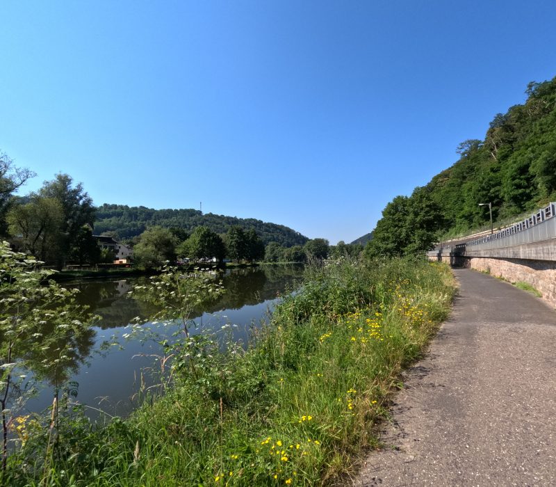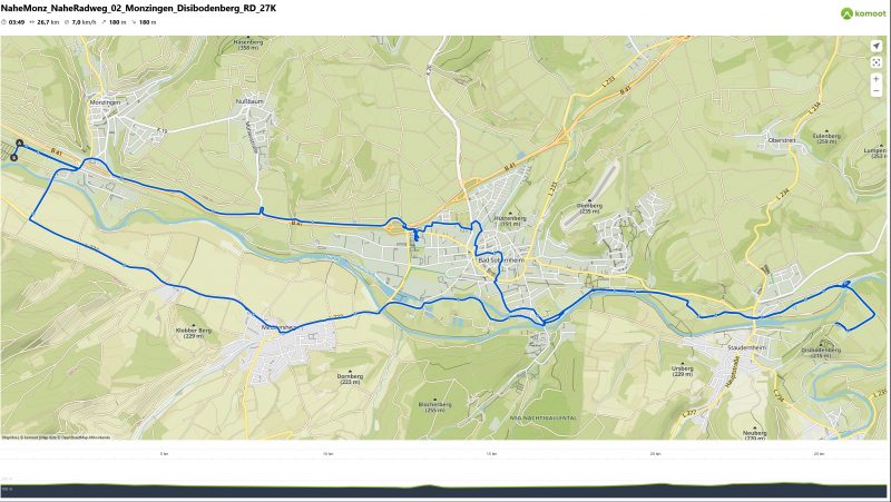 Unsere erste Radtour geht direkt vom Campingplatz aus. Wir fahren zum Naheradweg, der auf diesem Streckenabschnitt südlich des Flusses verläuft. Es geht weiter an Bad Sobernheim vorbei bis zum Disibodenberg. Auf dem Rückweg fahren wir durch Bad Sobernheim und mit dem Radweg entlang der B41 zum Campingplatz zurück.
