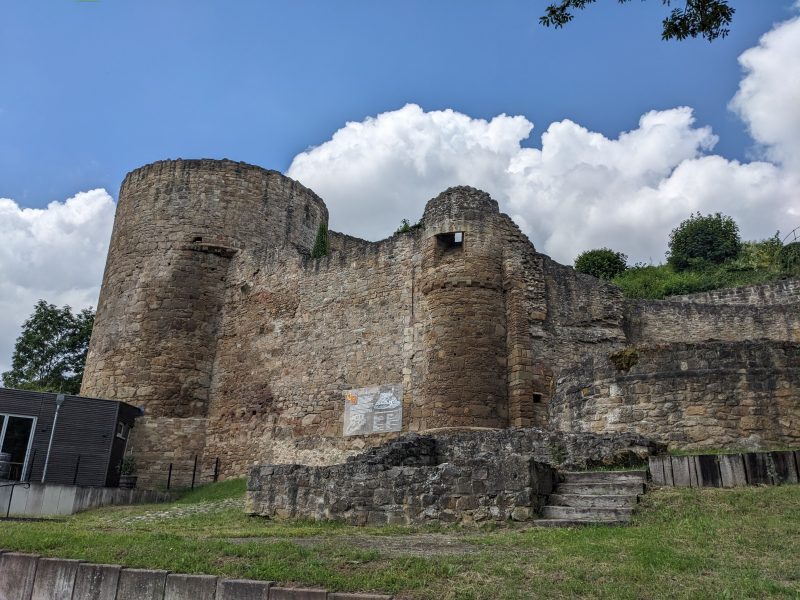 Wir starten wieder vom Campingplatz aus, fahren zum Nahe Radweg und weiter in westlicher Richtung bis Hochstädten. Dort wechseln wir auf die andere Flussseite und es geht weiter bis Kirn. Ziel dieser Tour soll aber die Kyrburg sein, daher müssen wir durch Kirn hindurch fahren. Den steilen Anstieg zur Burg (stellenweise 13% und 18%) müssen wir zum Teil schieben.