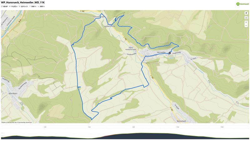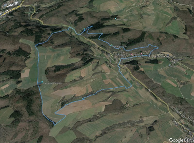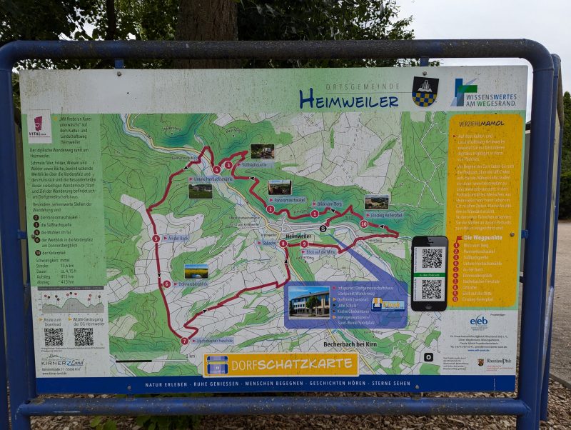 Startpunkt dieser Tour ist der Parkplatz bei Heimweiler am Dorfgemeinschaftshaus. Es ist die Vitaltour “Mit Krebs un Karer unerwäschs”. Der Beginn der Tour führt am Hang entlang über einen gut gemähten Grasweg und schöner Aussicht. Dann geht es hinunter zur Süßbachquelle, vorbei an alten Mühen und hinauf an vielen Feldern entlang bis zum “Donnersbergblick”. Ab hier geht es durch hohe ungemähte Wiesenweg wieder hinunter bis nach Heimweiler. Eine landschaftliche schöne Tour mit weiten Ausblicken.