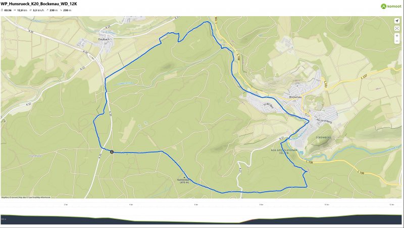 Der Wanderparkplatz liegt an der K20 (Parkplatz Oberer Zollstock) am Felke Heil- und Aktivwald von Bad Sobernheim. Von hier aus wandern wir zuerst Richtung Daubach. Dann kreuzen wir noch einmal die K 20 und stoßen auf die Vitaltour “Um die Wüstund”. Mit ihr geht es weiter entlang der Felder in Richtung Bockenauer Schweiz und hinunter ins Ellerbachtal. Dort führt der Weg auf eine alte Bahntrasse, über die jetzt der Ellerbachtalradweg verläuft. So gelangen wir nach Bockenau und kommen am Kleinbahnmuseum vorbei. Kurz danach geht es über einen kleinen Wegpfad hinauf in den Wald bis zum Jagdhaus Leosruh. Von hier aus hat man einen weiten Ausblick in den Soonwald. Zurück zum Parkplatz führt uns anschließend ein breiter Forstweg.