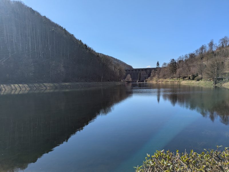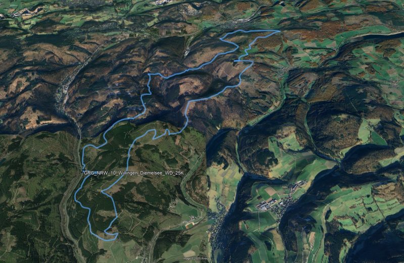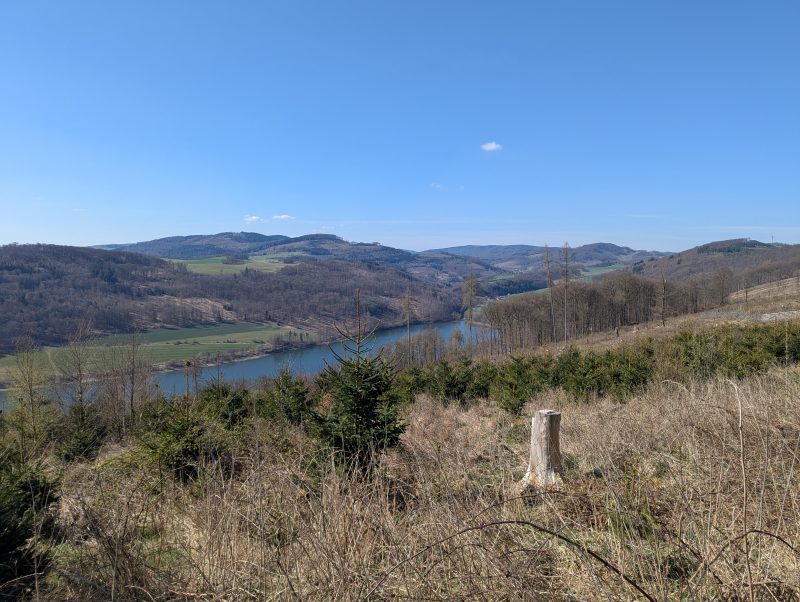 Die NRW Grenze verläuft nördlich des Diemelsee auf dem Höhenzug, an dem die elfte Etappe der NRW Umrundung startet. Ein kleiner Wanderparkplatz für 3 Fahrzeuge ist der Ausgangspunkt der Radrunde. Erst wellig auf dem Höhenrücken mit einen Trailabschnitt geht es dann bergab nach Helmighausen an der Staumauer der Diemel.