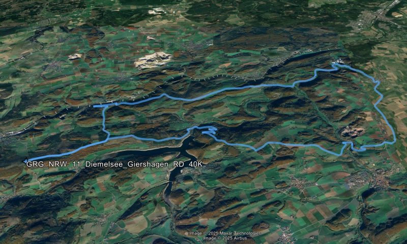 Ein Wirtschaftsweg führt hinab in das Diemeltal und damit geht es wieder eindeutig in Richtung Startpunkt. Dem Diemeltalradweg folgt die Strecke bis Padberg. Weiter geht es parallel zu einem Höhenzug nach Messinghausen im Tal der Hoppecke. Ein letztes Mal ist Richtung Süden ein Höhenzug zu erradeln. Oben geht es dann über den Höhentrail zurück zum Parkplatz. Mit 900 Höhenmeter war es eine schwere Etappe, wobei Anstiege bis 16 Prozent von der Rohloff im ersten Gang fahrbar waren, wenn der Untergrund griffig genug war.