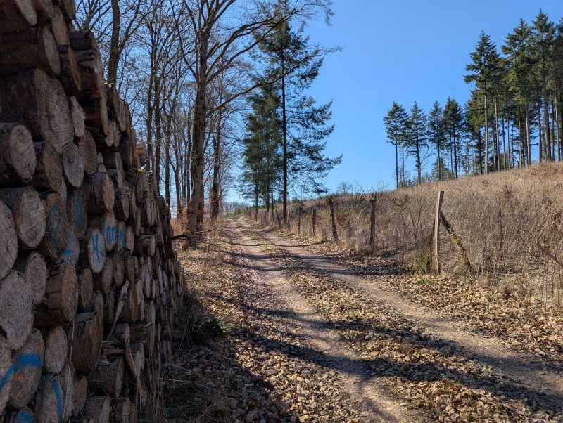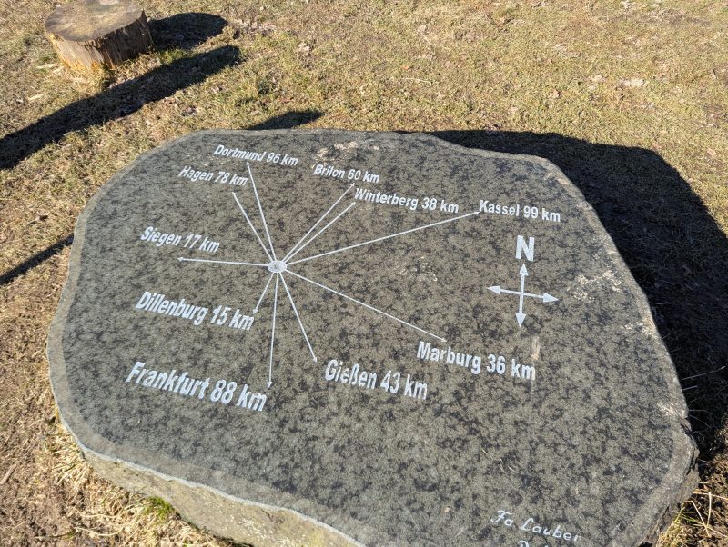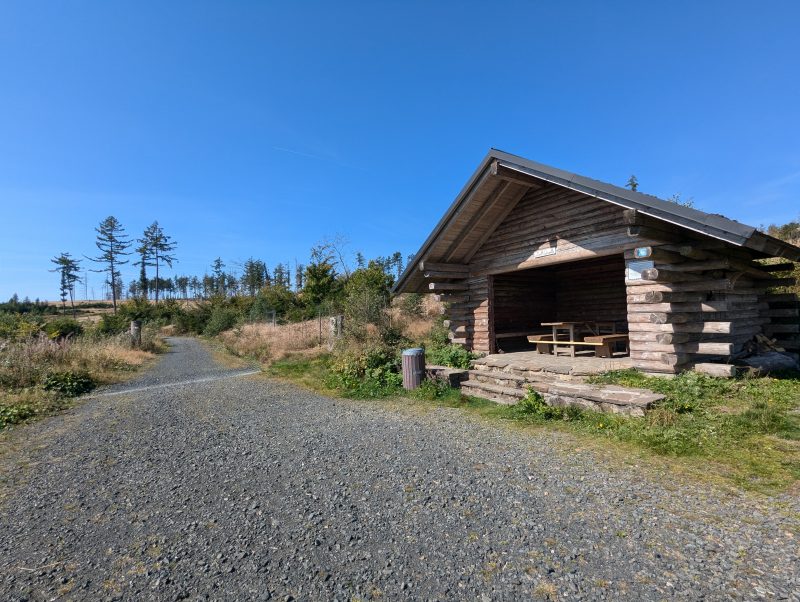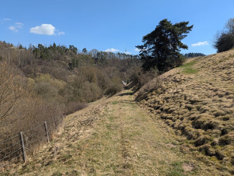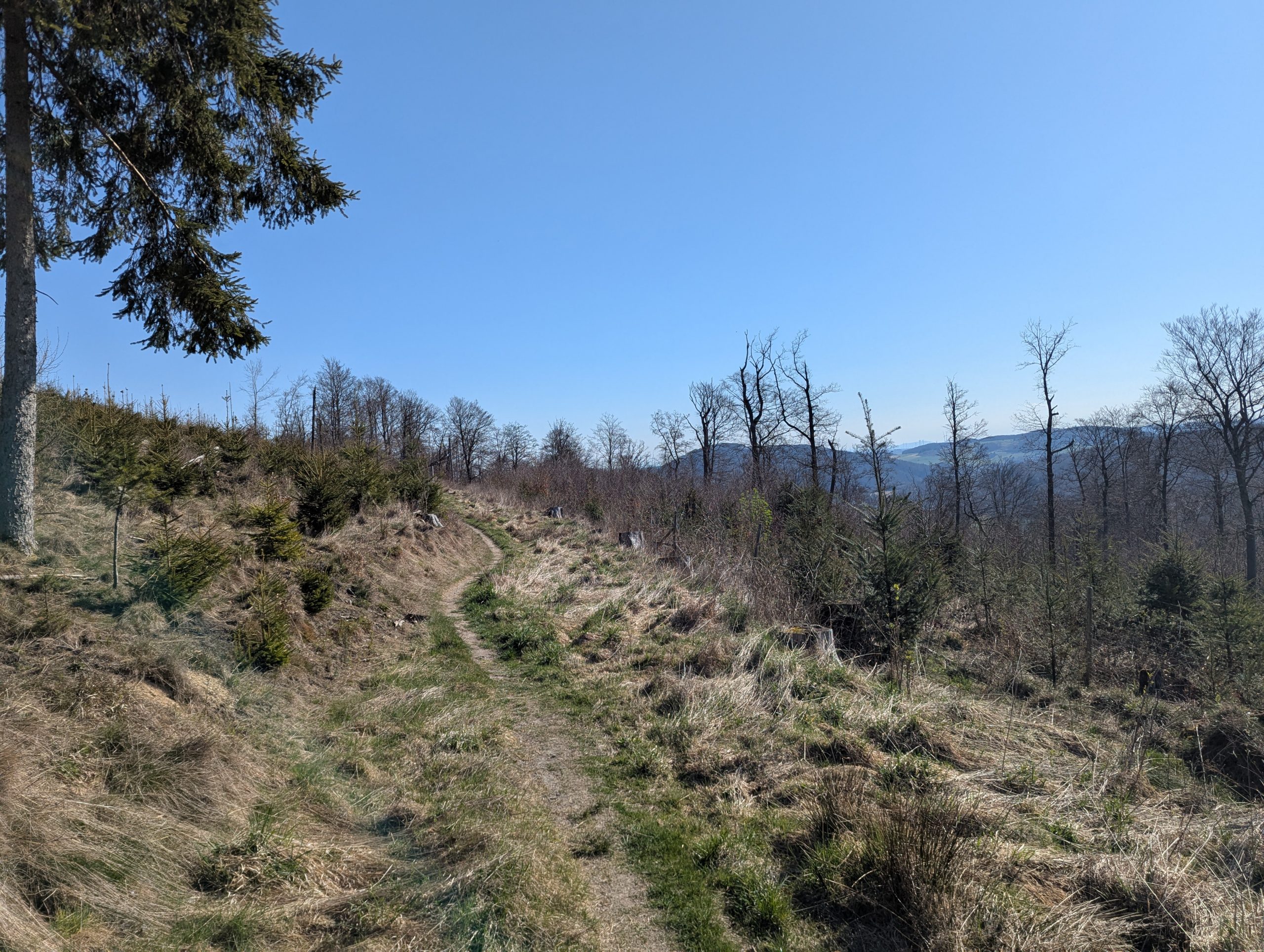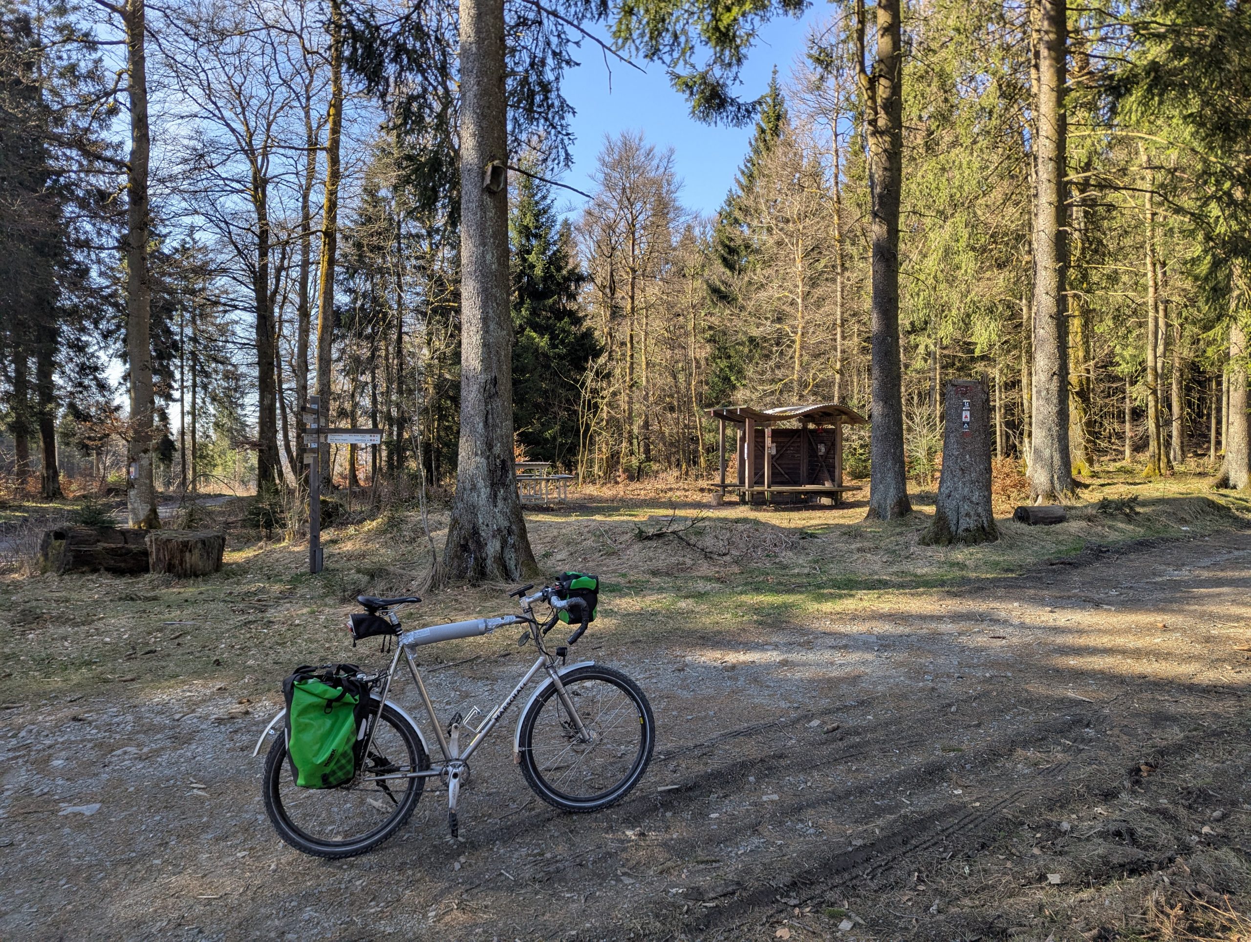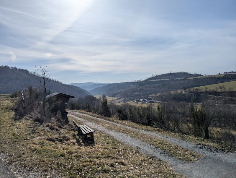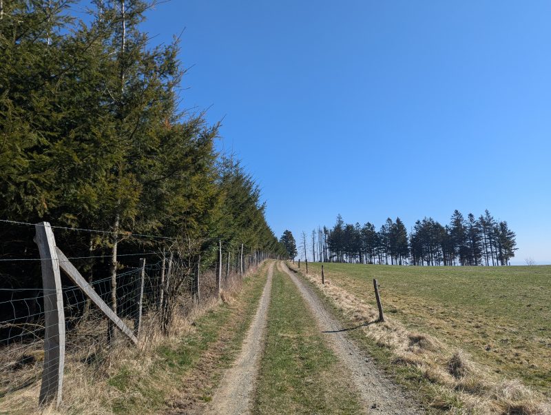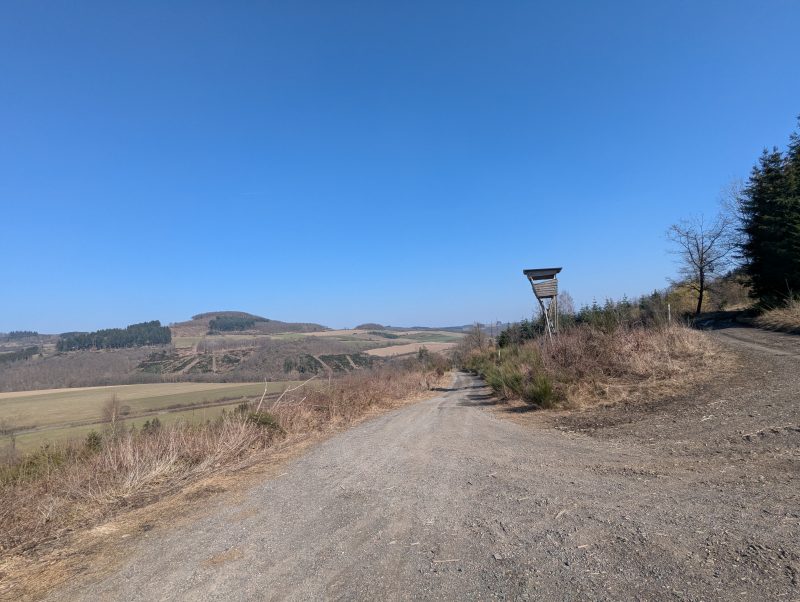 Auf dem Höhenrücken geht es nach Nordosten auf alten Bergmannspfaden und über den Rothaarsteig mit viel vom Aussichtskäfer freigelegter Aussicht bis zu einer Schutzhütte an der Dillquelle. Dort wird das für die Wege nicht so gut geeignete Klapprad an den Zaun gebunden und es geht die restlichen fünf Kilometer bis zu Wendepunkt am Jagdberg. Auf diesem Grenzweg zwischen Hessen und NRW war zu Zeiten des Eisenerz Bergbaues schon seit tausenden von Jahren ein wichtiger Transportweg.