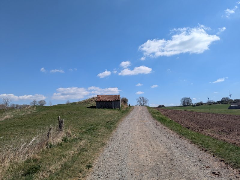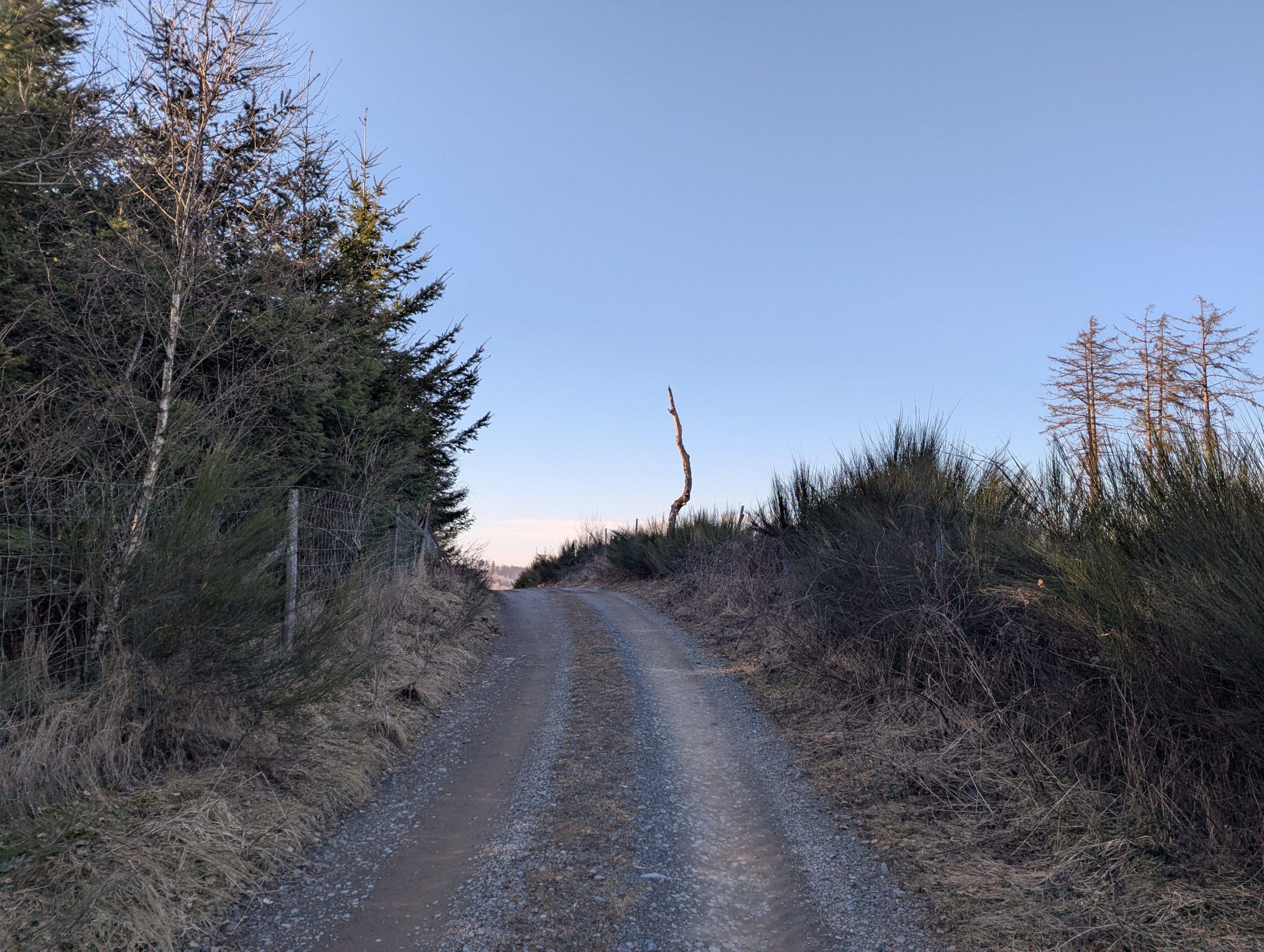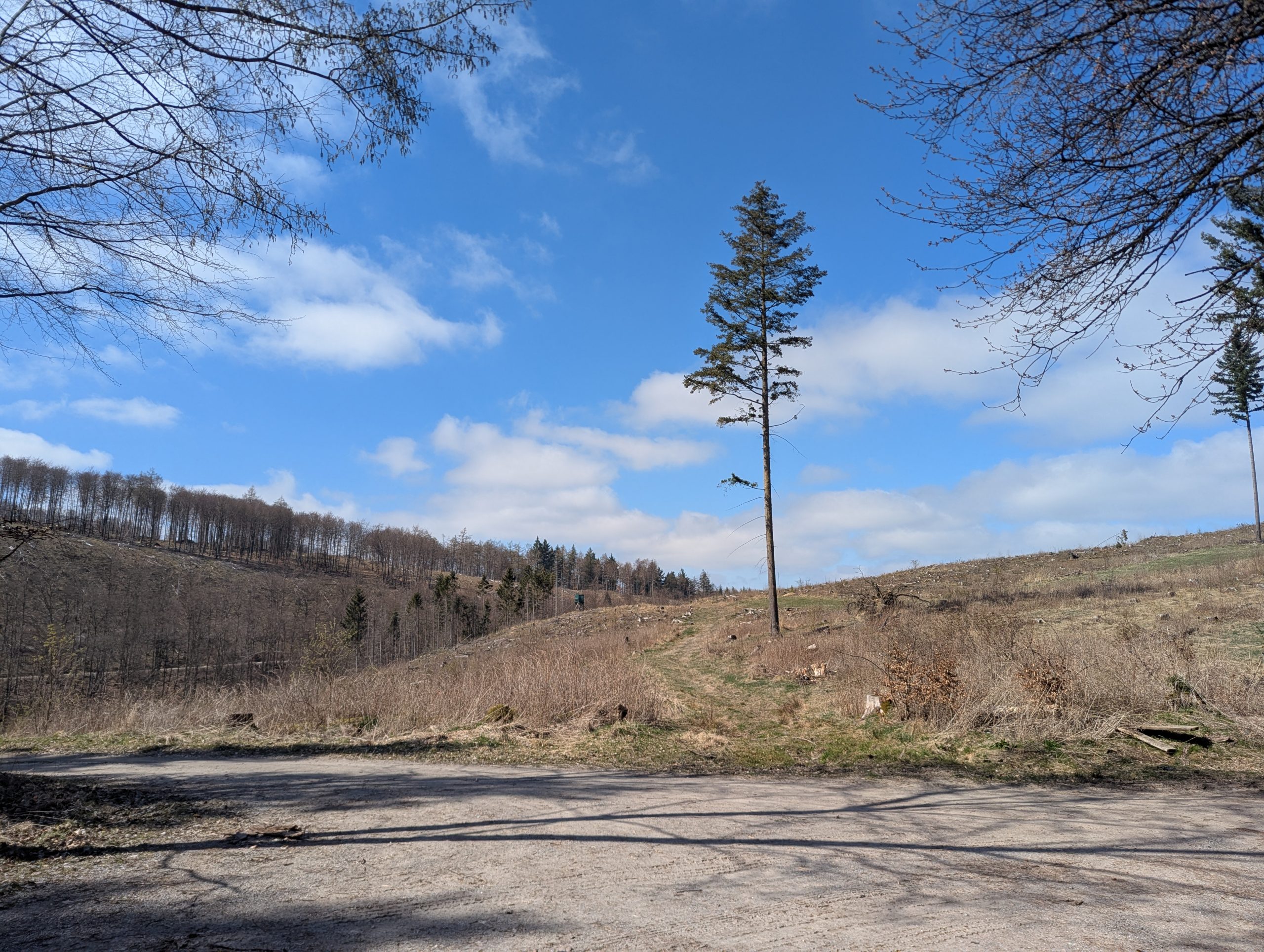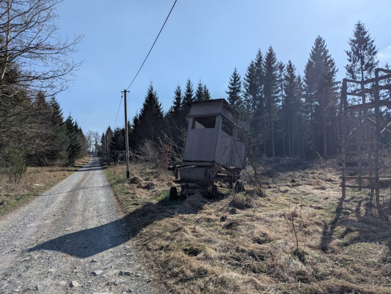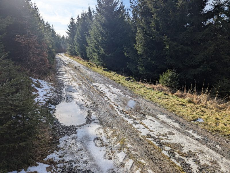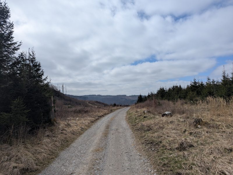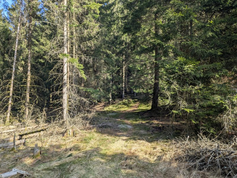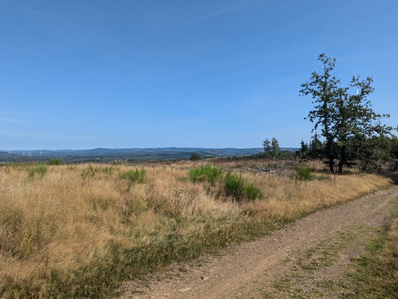 Auf dem Höhenrücken geht es nach Nordosten auf alten Bergmannspfaden und über den Rothaarsteig mit viel vom Aussichtskäfer freigelegter Aussicht bis zu einer Schutzhütte an der Dillquelle. Dort wird das für die Wege nicht so gut geeignete Klapprad an den Zaun gebunden und es geht die restlichen fünf Kilometer bis zu Wendepunkt am Jagdberg. Auf diesem Grenzweg zwischen Hessen und NRW war zu Zeiten des Eisenerz Bergbaues schon seit tausenden von Jahren ein wichtiger Transportweg.