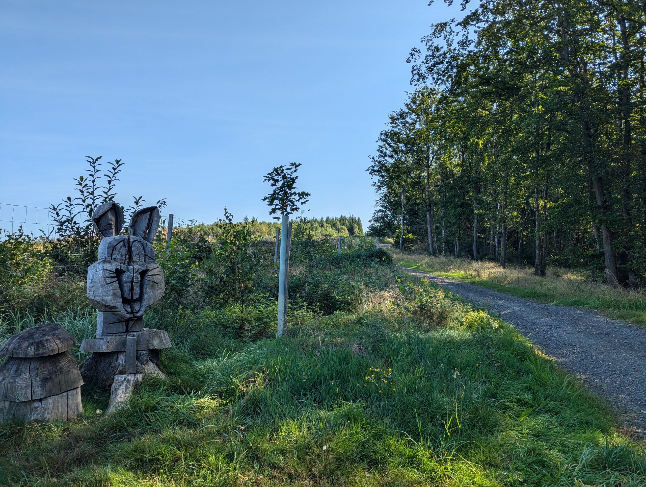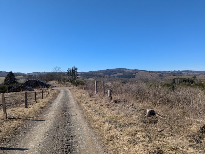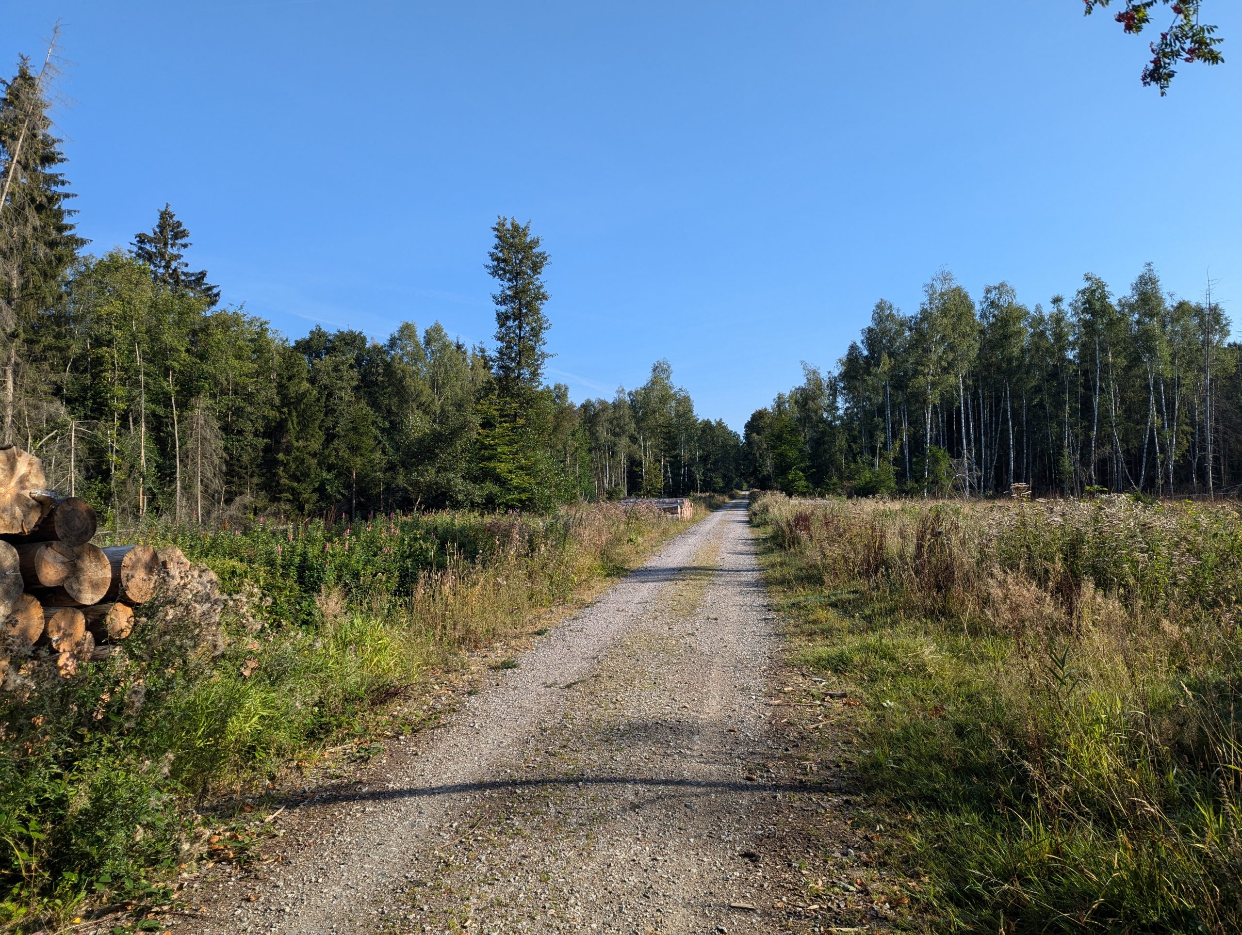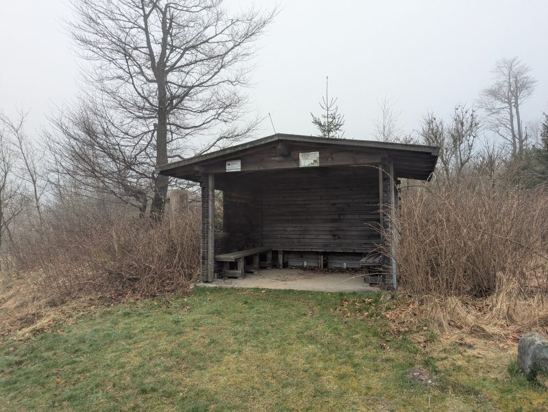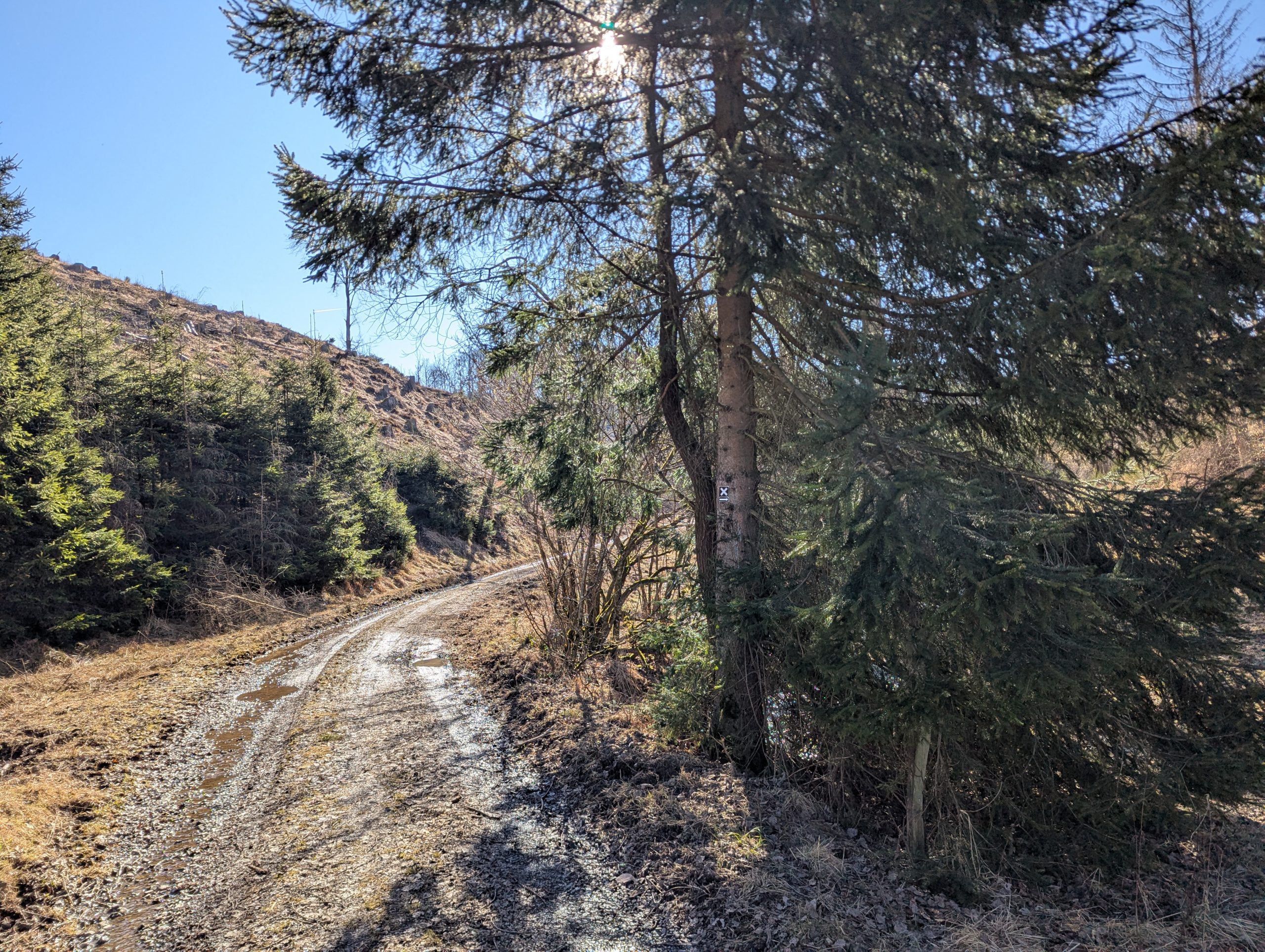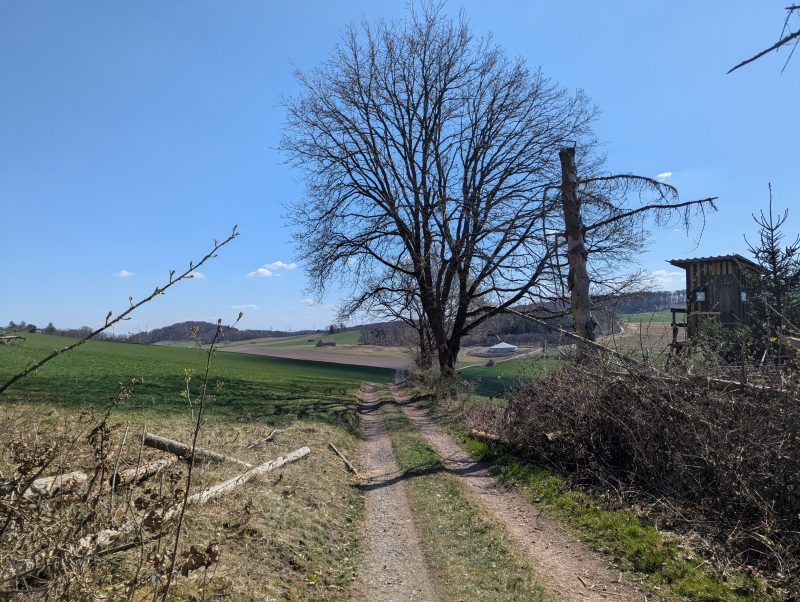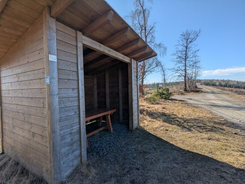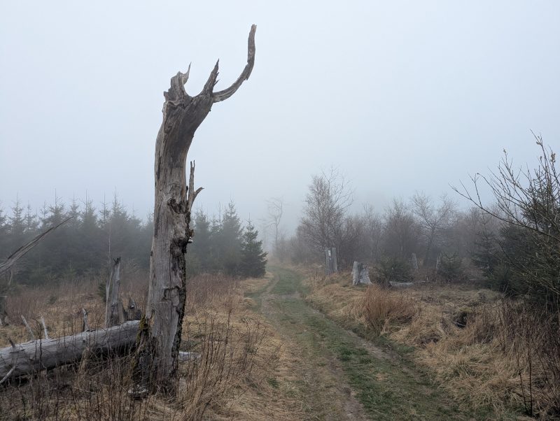 Auf dem Höhenrücken geht es nach Nordosten auf alten Bergmannspfaden und über den Rothaarsteig mit viel vom Aussichtskäfer freigelegter Aussicht bis zu einer Schutzhütte an der Dillquelle. Dort wird das für die Wege nicht so gut geeignete Klapprad an den Zaun gebunden und es geht die restlichen fünf Kilometer bis zu Wendepunkt am Jagdberg. Auf diesem Grenzweg zwischen Hessen und NRW war zu Zeiten des Eisenerz Bergbaues schon seit tausenden von Jahren ein wichtiger Transportweg.