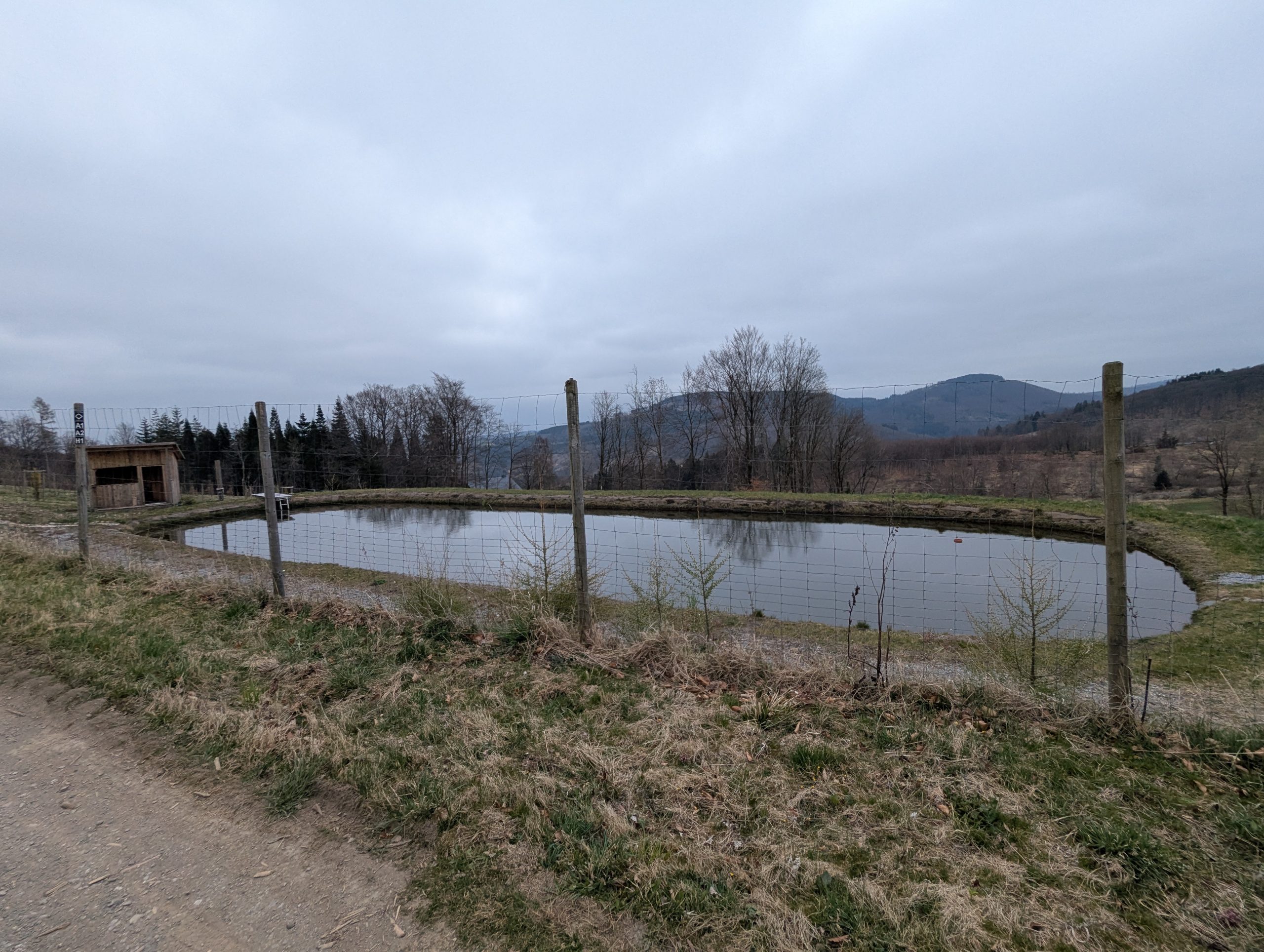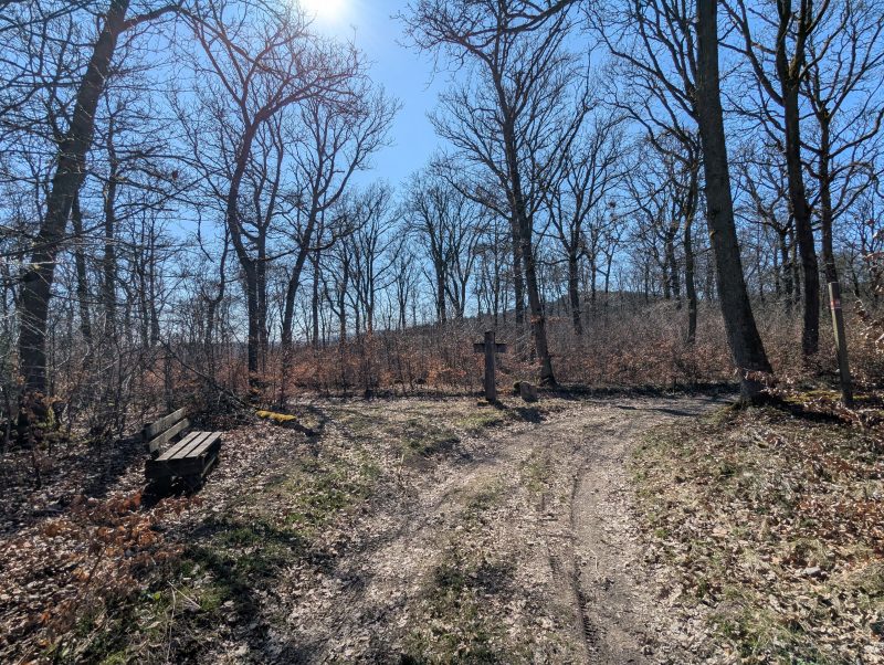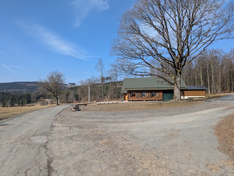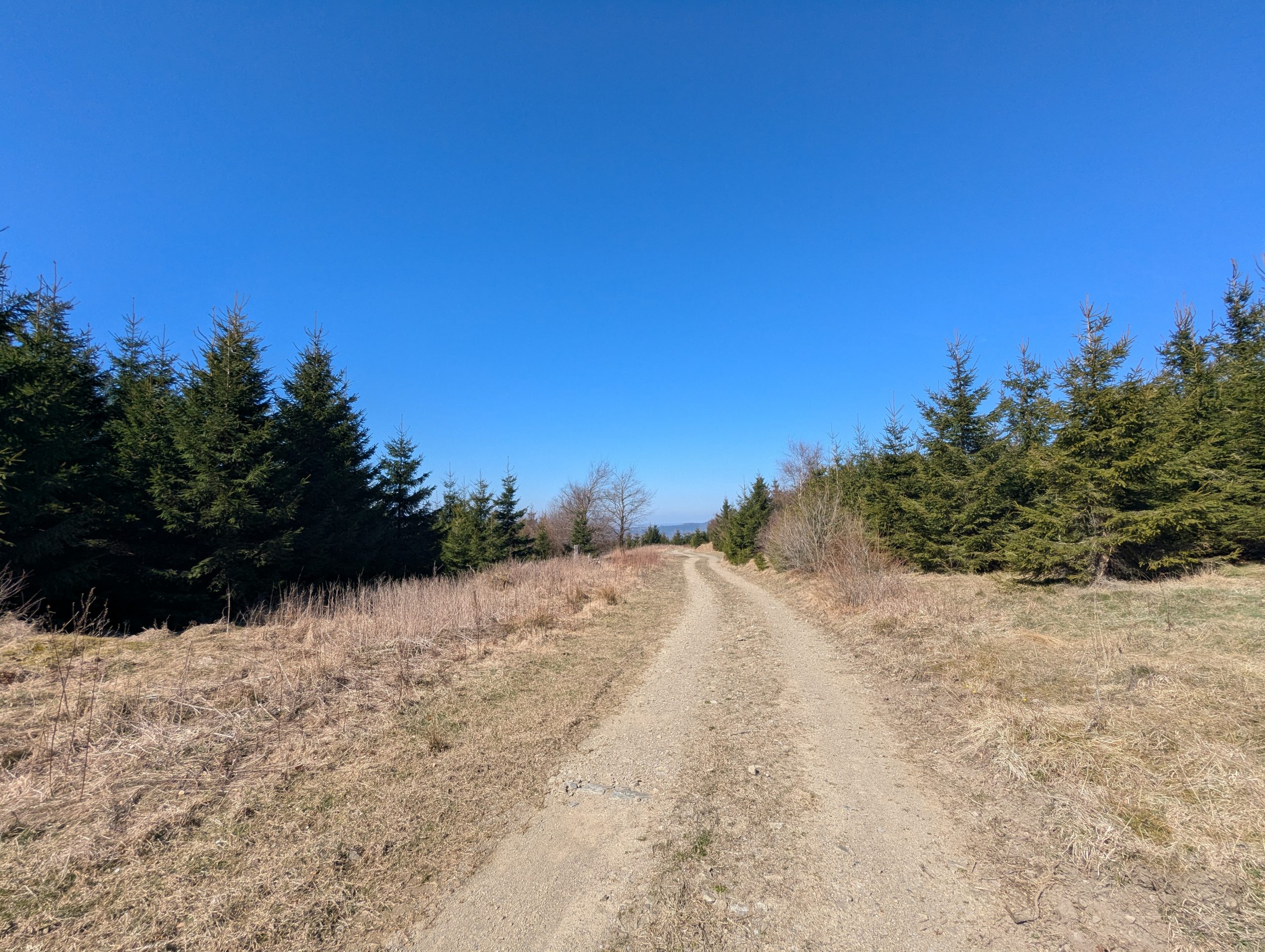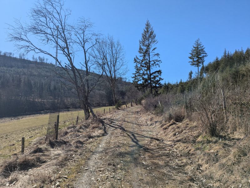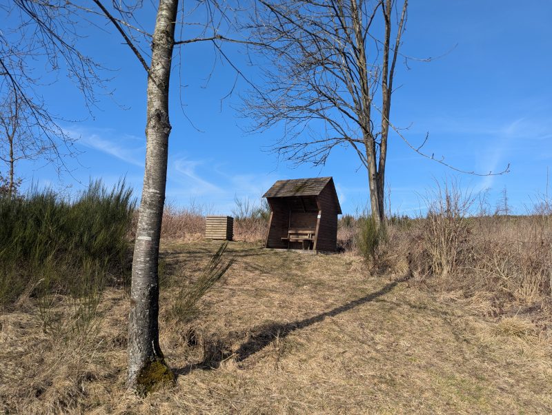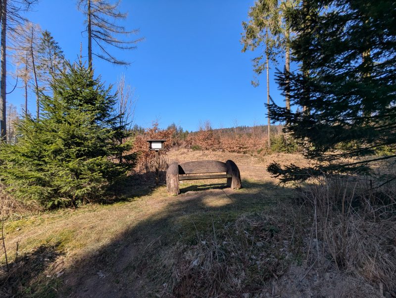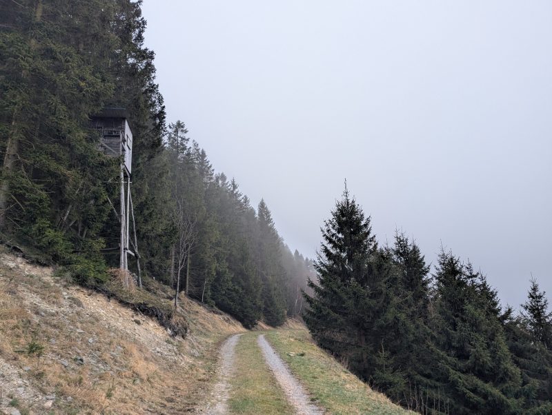 Auf dem Höhenrücken geht es nach Nordosten auf alten Bergmannspfaden und über den Rothaarsteig mit viel vom Aussichtskäfer freigelegter Aussicht bis zu einer Schutzhütte an der Dillquelle. Dort wird das für die Wege nicht so gut geeignete Klapprad an den Zaun gebunden und es geht die restlichen fünf Kilometer bis zu Wendepunkt am Jagdberg. Auf diesem Grenzweg zwischen Hessen und NRW war zu Zeiten des Eisenerz Bergbaues schon seit tausenden von Jahren ein wichtiger Transportweg.