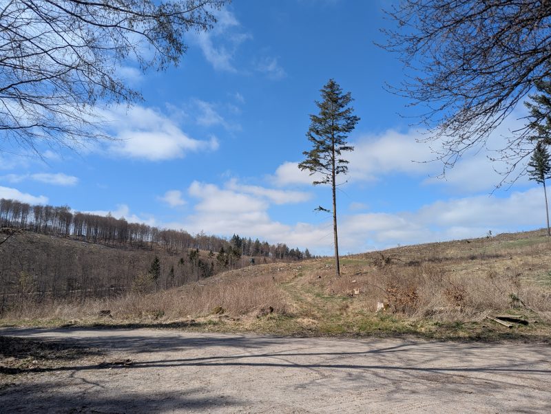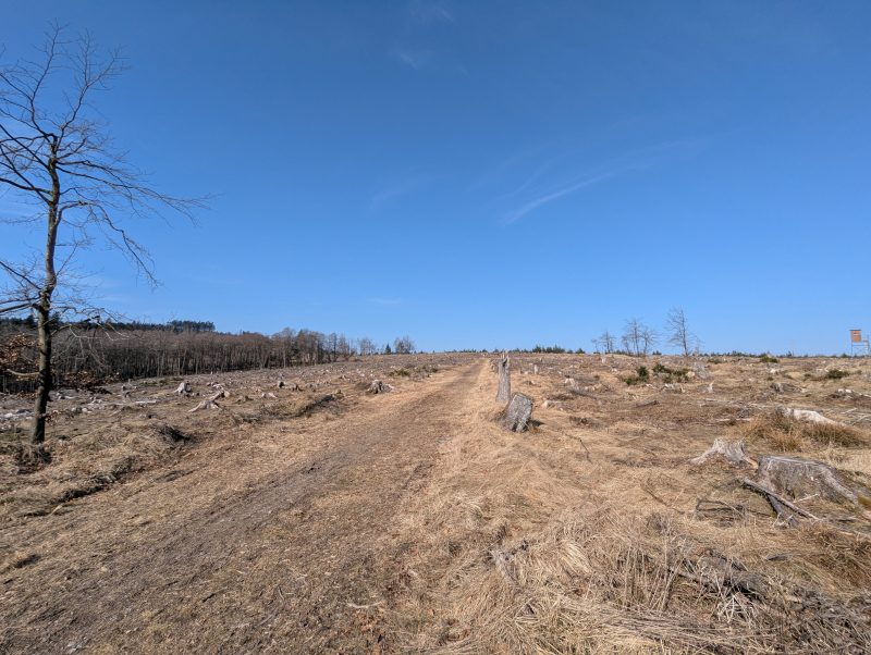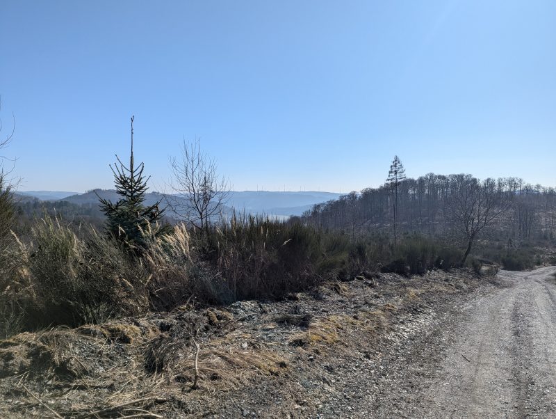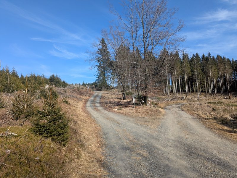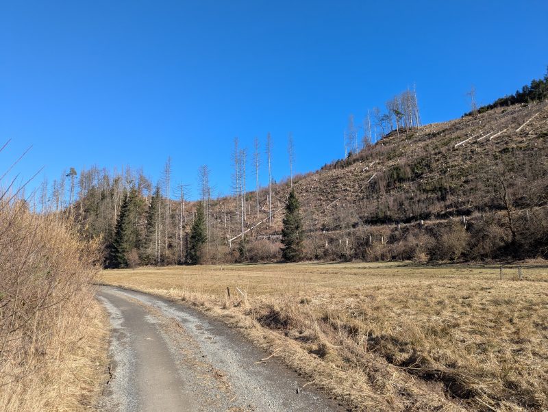 Von einem ziemlich verdreckten Wende- und Parkplatz an der B251 nördlich von Willingen startet die Wanderung der zehnten Etappe. Es geht gleich steil auf den nördlichen Hausberg von Willingen (hoher Einberg 806m) mit Aussicht auf die im Tal liegende Stadt. Es geht durch noch nicht gefressene Fichtenwälder, Aufforstungsflächen unterschiedlichen Alters und Kahlflächen mit Aussicht auf das tief unten liegende Tal der Itter, die dann hinter Brontkirchen in den Diemelsee fließt.