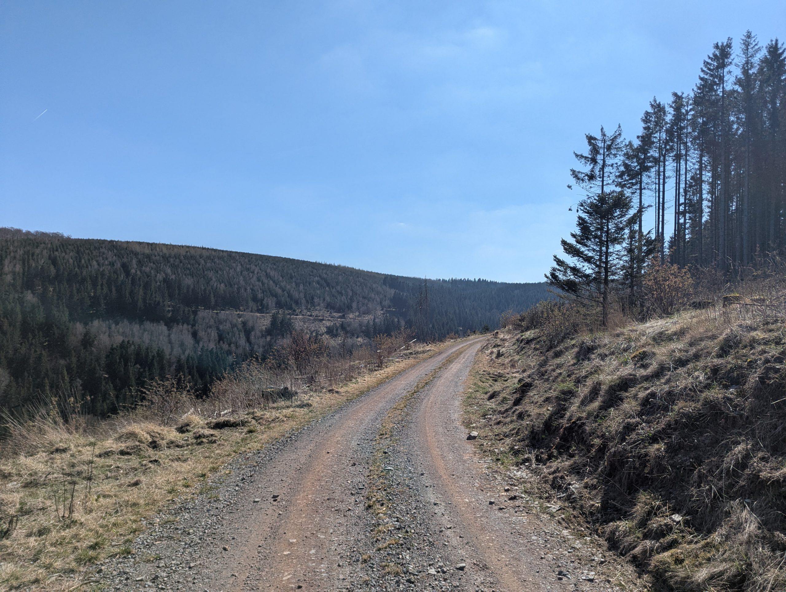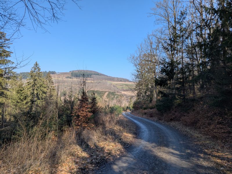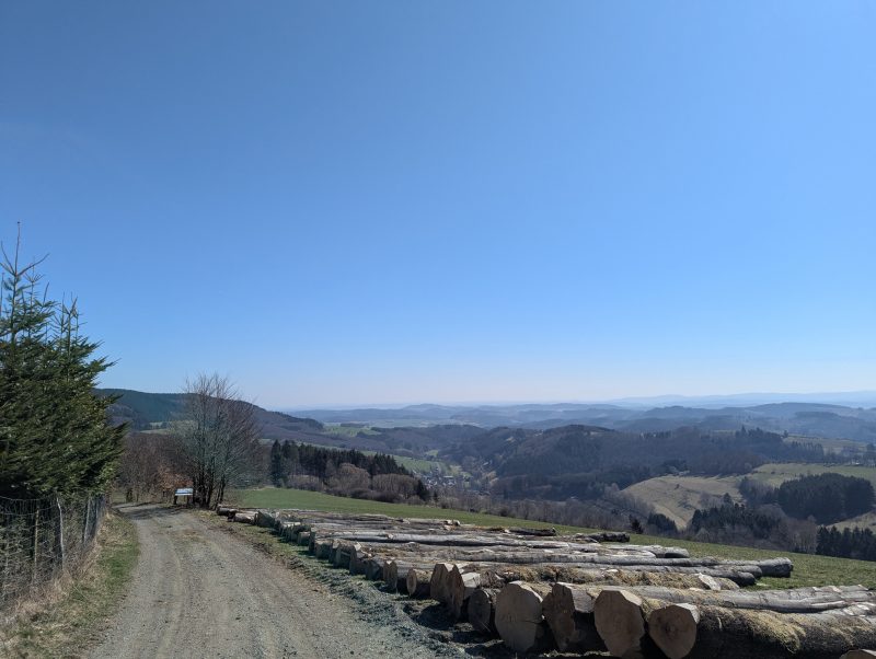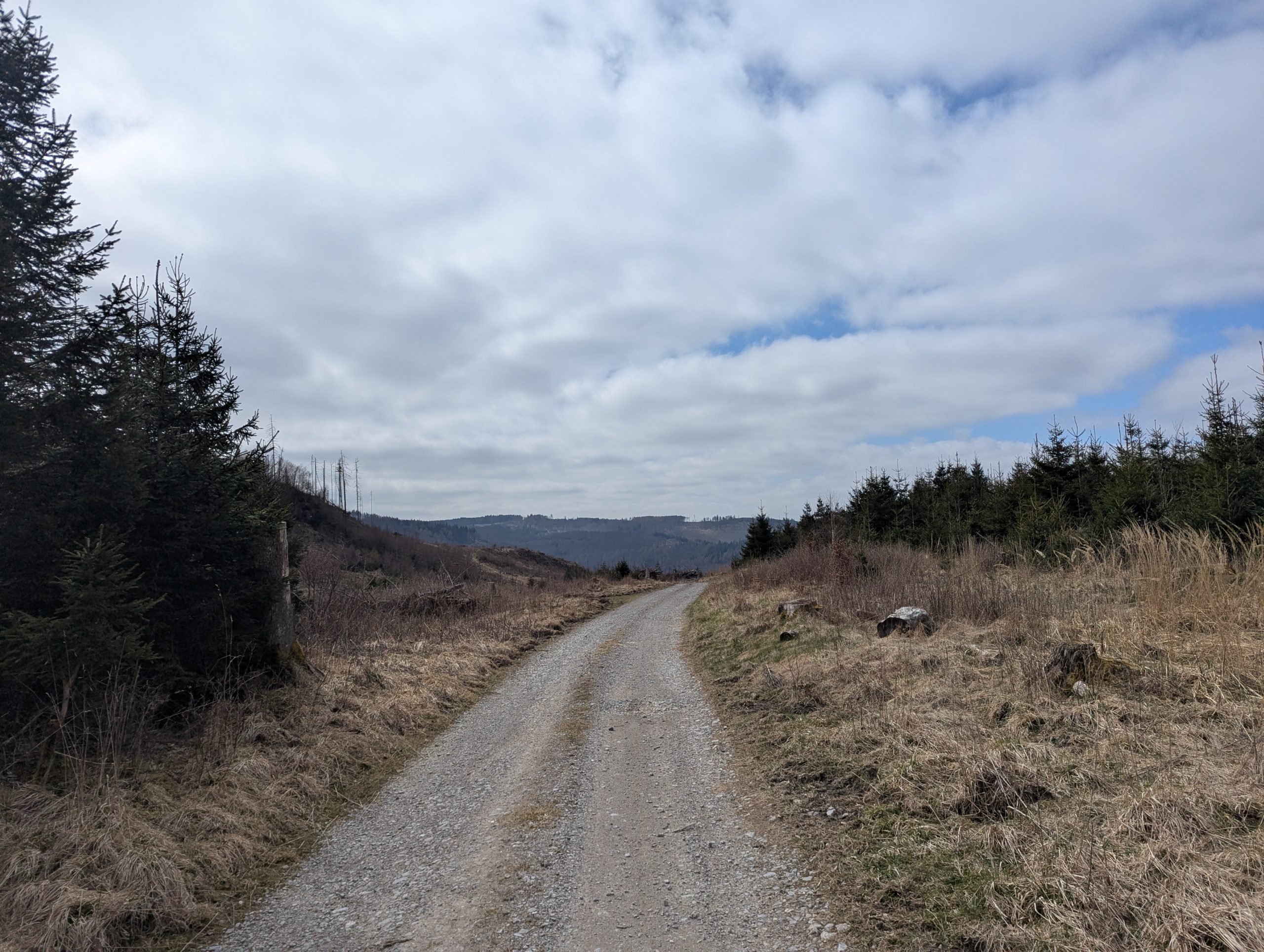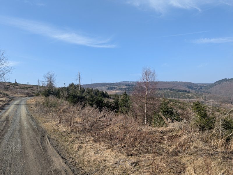 Tag zwei und Etappe 3 startet wieder in Bad Laasphe bei identischem Wetter. Nördlich von Laasphe geht es gleich bergauf zum Weibersberg (516m). Dann folgt eine aussichtsreiche endlose Forststraße mit Fern- und Talblick. Bei Didoll am Didold ist die NRW Grenze nicht weit. Eigentlich verläuft diese auf dem Bergrücken östlich der Tour, aber da gab es keine durchgehend gut befahrbaren Waldwege.