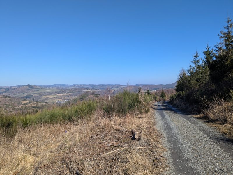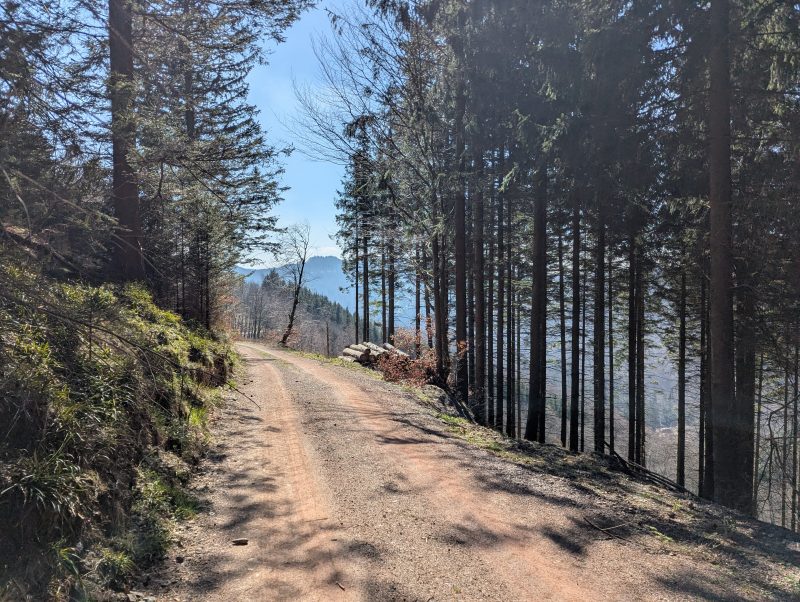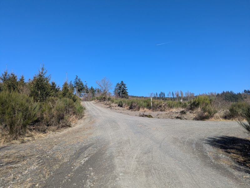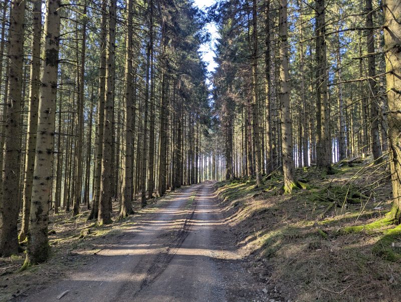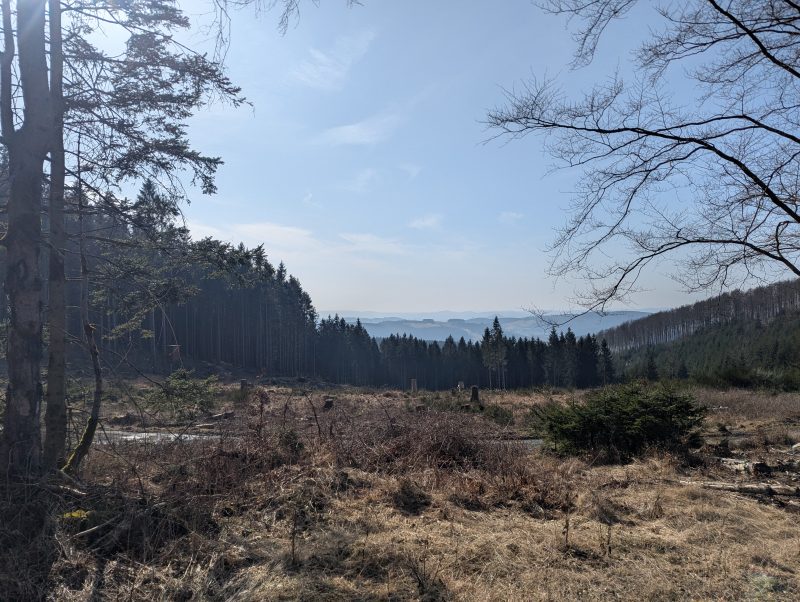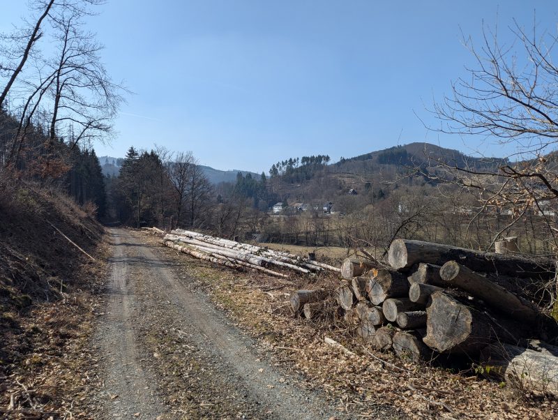 Tag zwei und Etappe 3 startet wieder in Bad Laasphe bei identischem Wetter. Nördlich von Laasphe geht es gleich bergauf zum Weibersberg (516m). Dann folgt eine aussichtsreiche endlose Forststraße mit Fern- und Talblick. Bei Didoll am Didold ist die NRW Grenze nicht weit. Eigentlich verläuft diese auf dem Bergrücken östlich der Tour, aber da gab es keine durchgehend gut befahrbaren Waldwege.