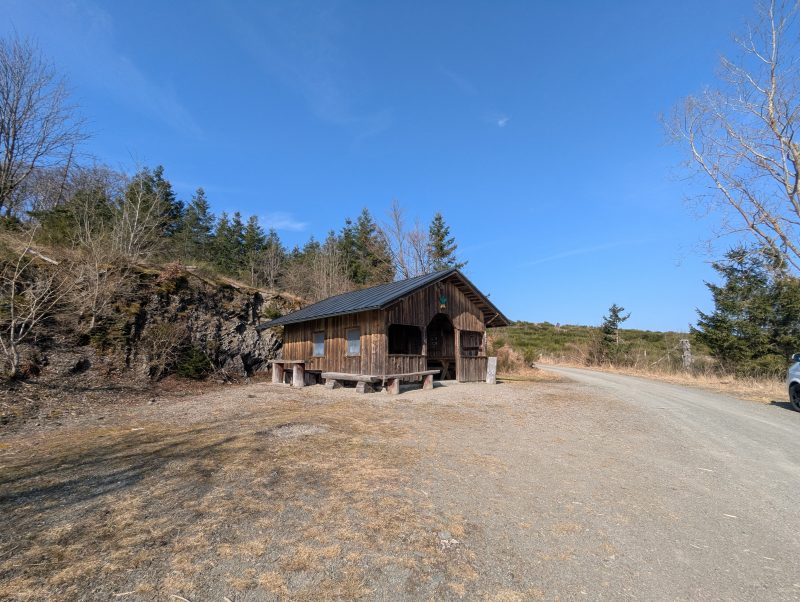 Der Kammweg endet hinter den fünf Häusern Huckenhohls und dem kleinen Wanderparkplatz an der K61, dem Ausgangspunkt der Etappe 11.