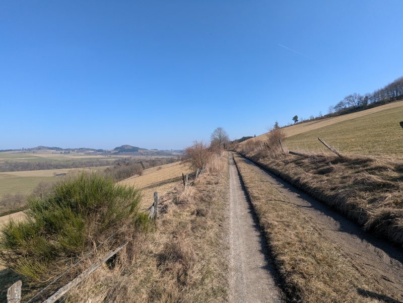 Bei Eppe wird das Aartal nach Westen verlassen und oben auf dem Steinberg gibt es mal wieder einen Grenzübertritt. Wellig mit schöner Aussicht auf die umgebenden Berge folgt die Stadtdurchfahrt Medebach und die Wirtschaftswegfahrt nach Medelon. Mit einem letzten An- und Abstieg wird Dreislar wieder erreicht.