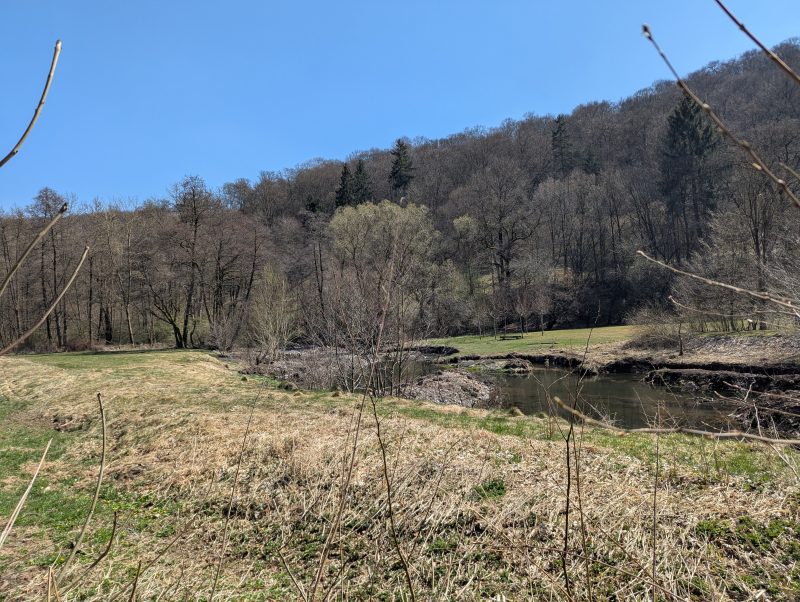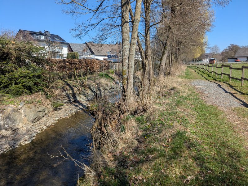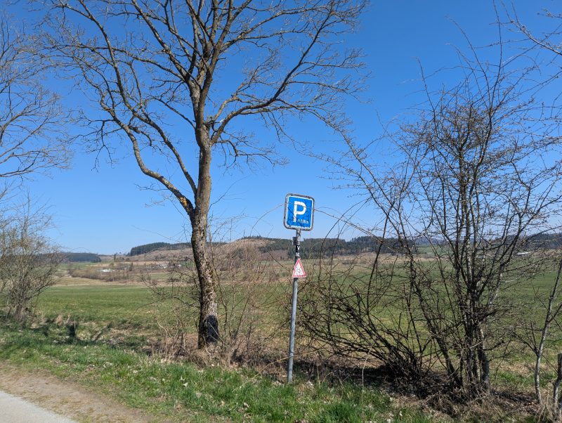 Bei Dreislar am Spielplatz gibt es einen einfachen Wanderparkplatz, der für zwei PKW ausreicht. Mit dem Rad geht es dann bergauf und bergab nach Berge und dann wieder hinunter ins Aartal. Die NRW Grenze verläuft hier auf dem Höhenrücken westlichen des Bachtales.