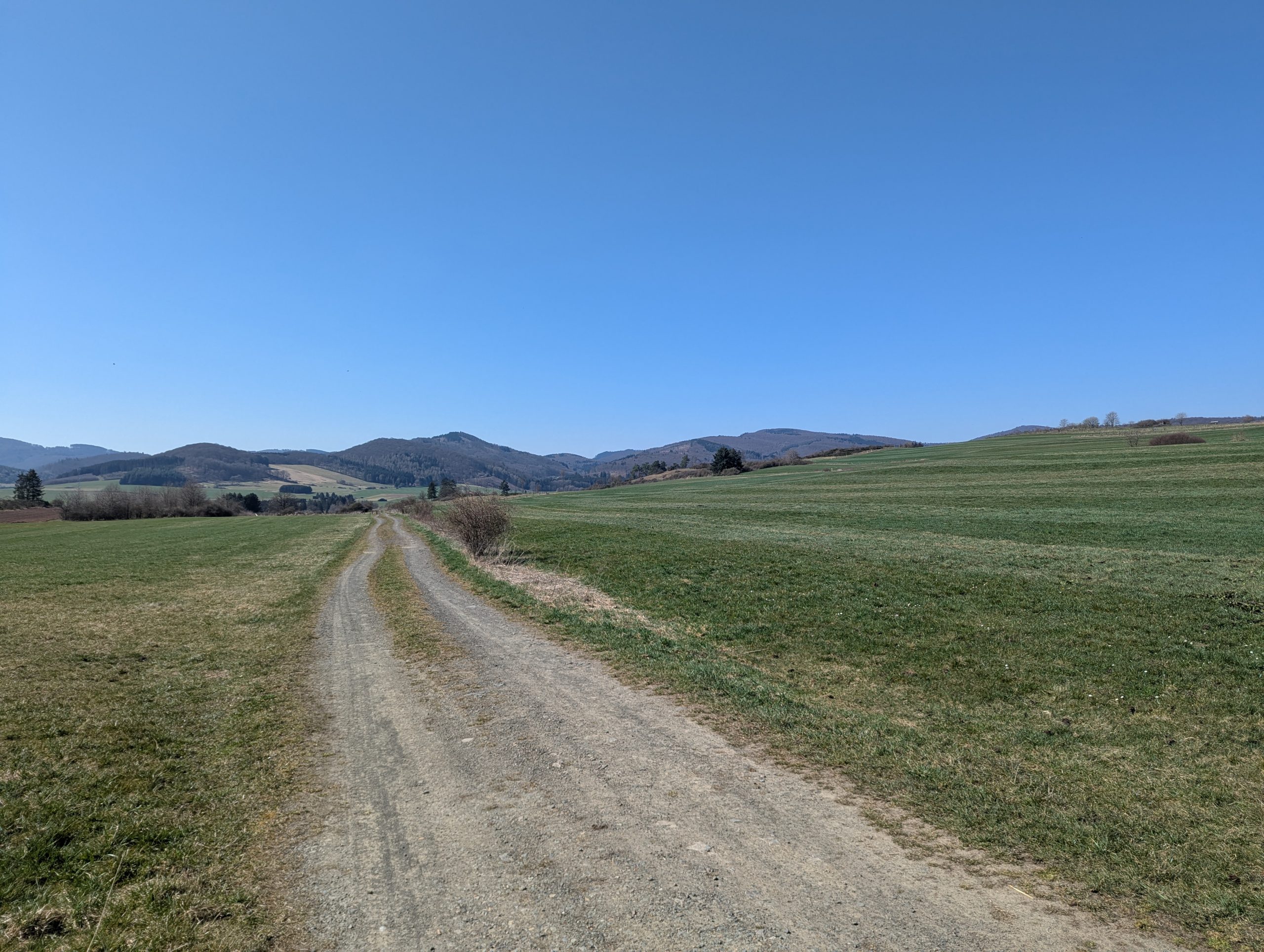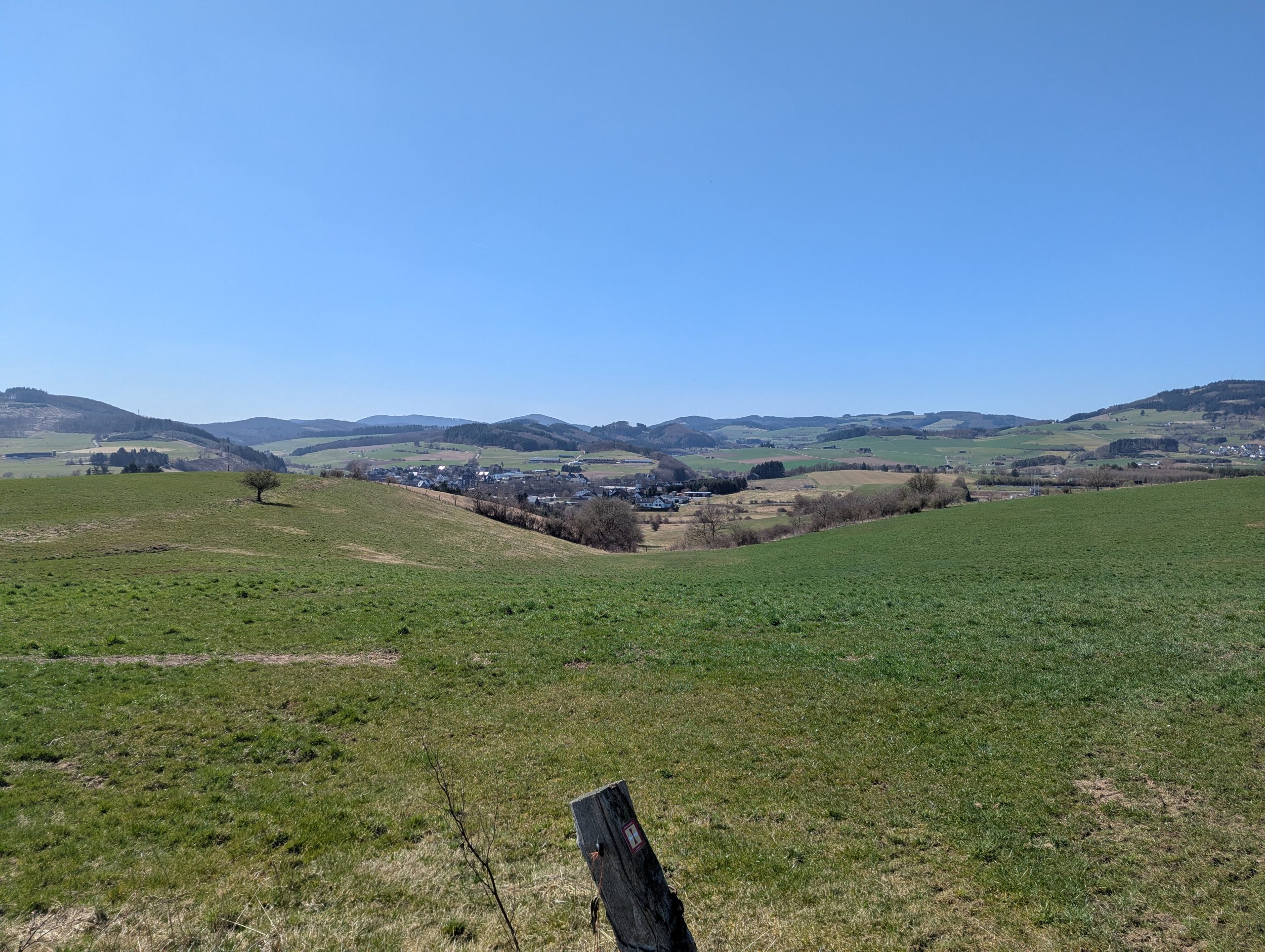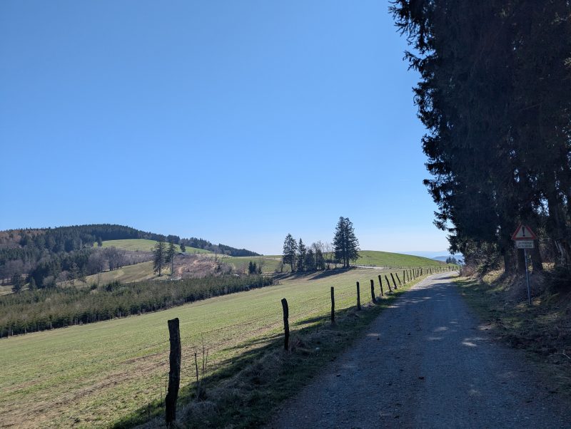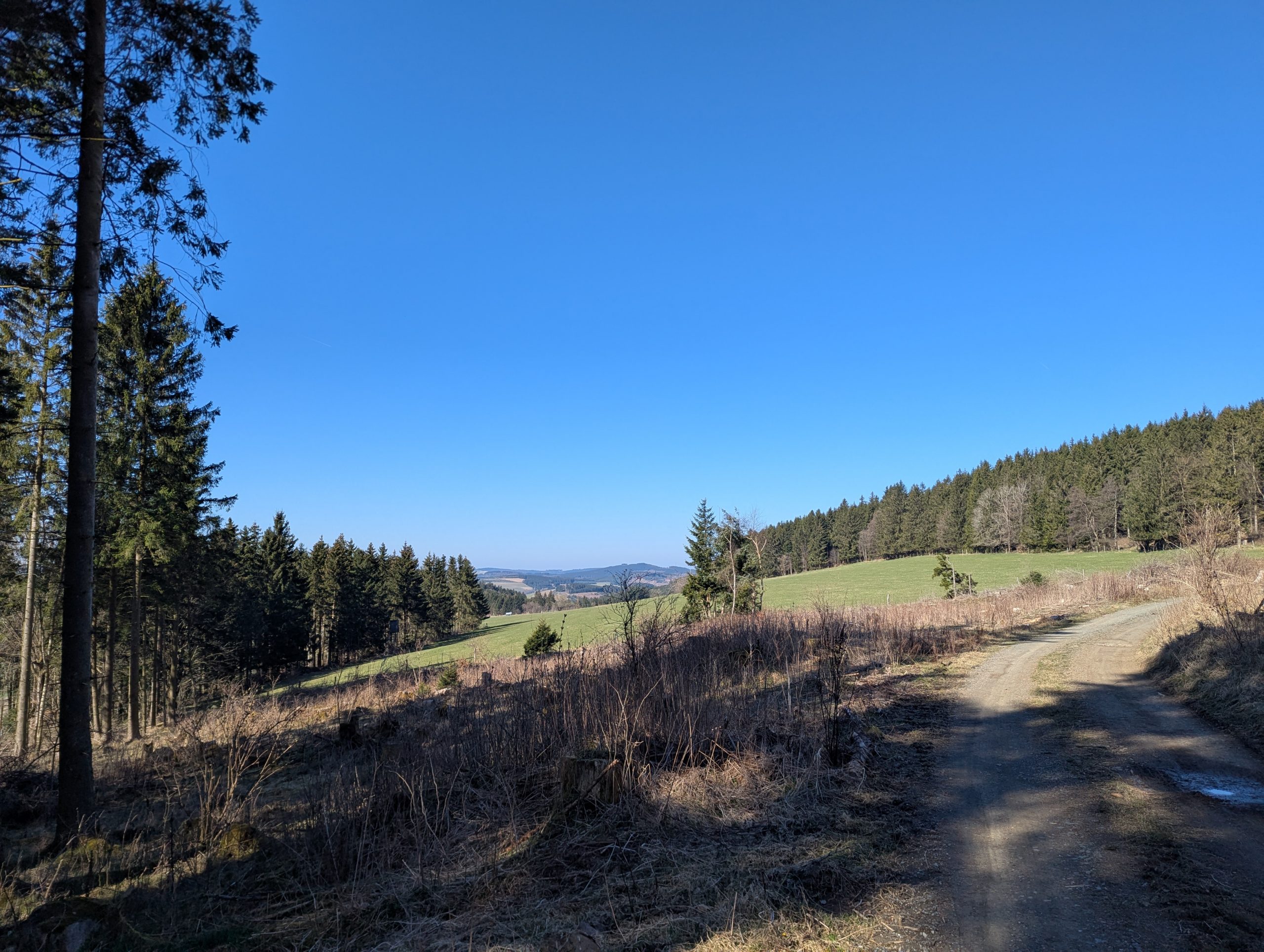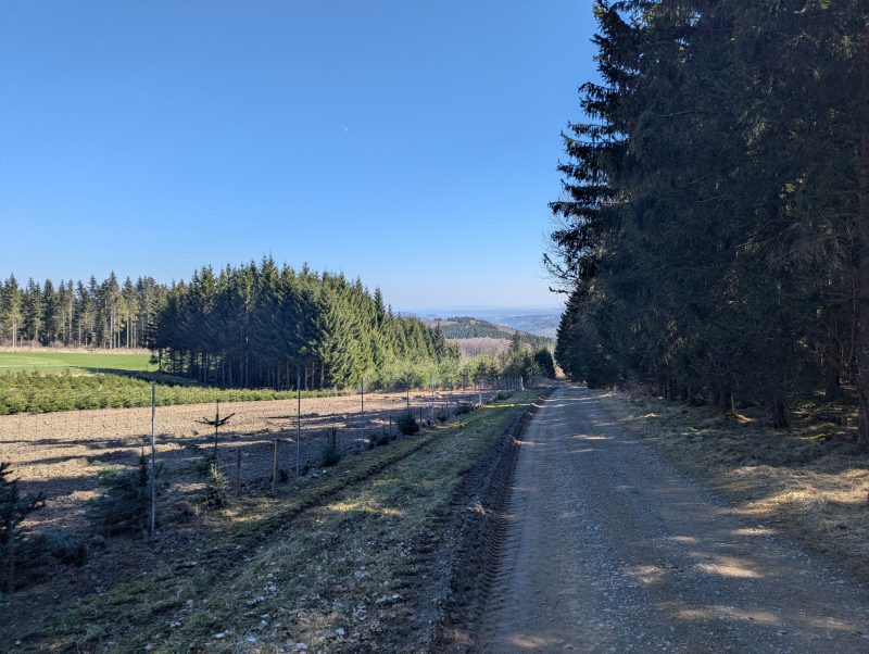 Eine Landschaftsstufe tiefer dominiert dann der gemeine Weihnachtsbaum umrahmt von Mähwiesen. Nach dem Abstieg nach Oberschledorn geht es auf dem südlichen Bergrücken nach Westen bis Deifeld.