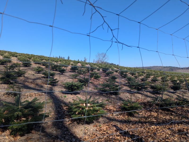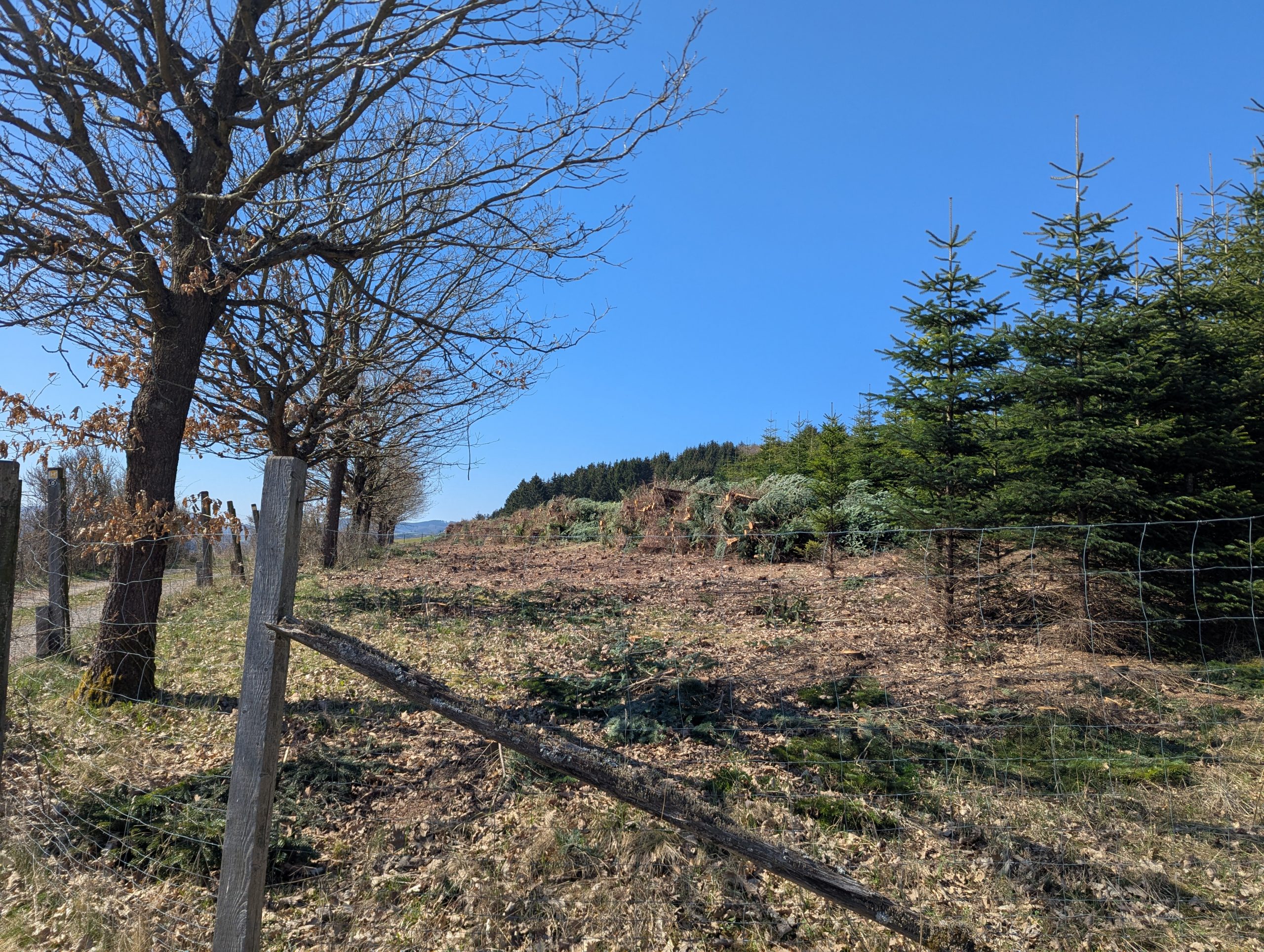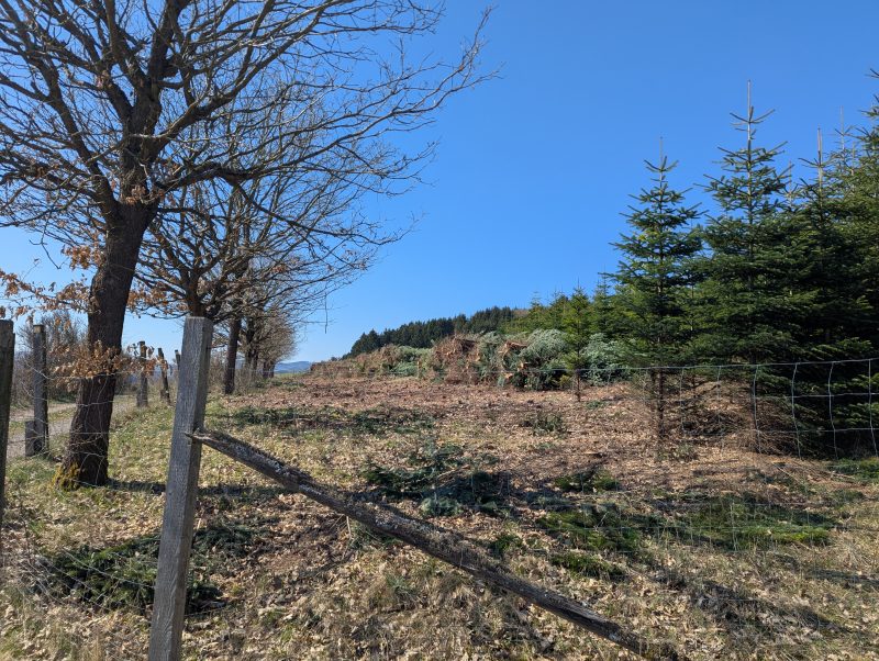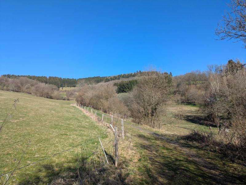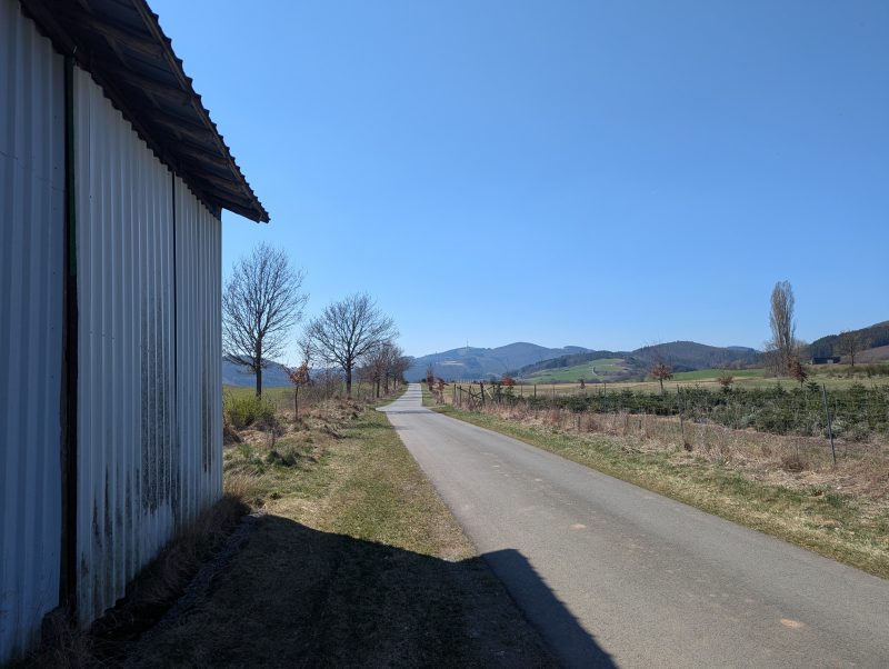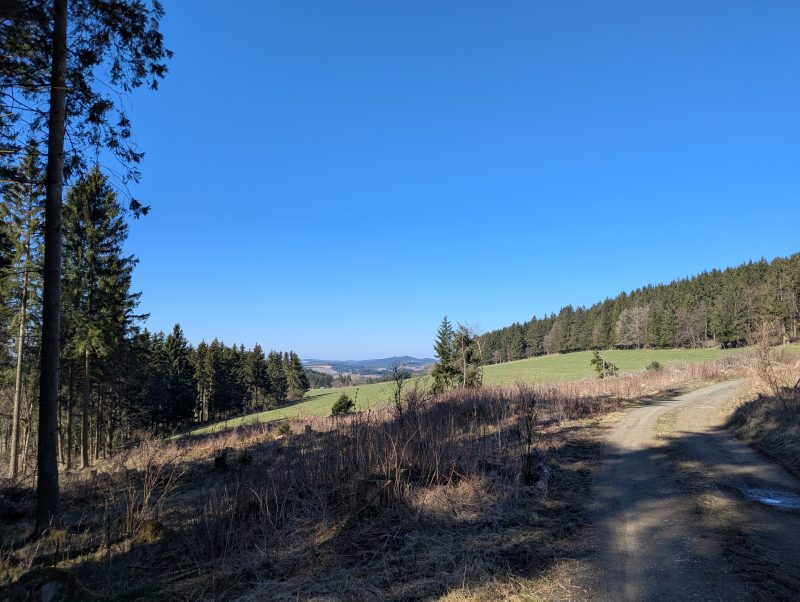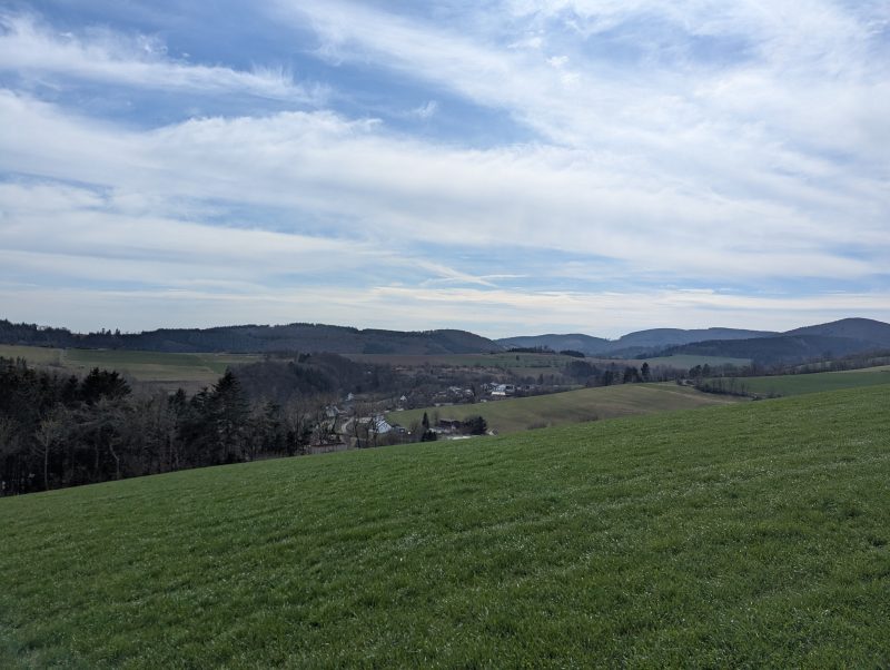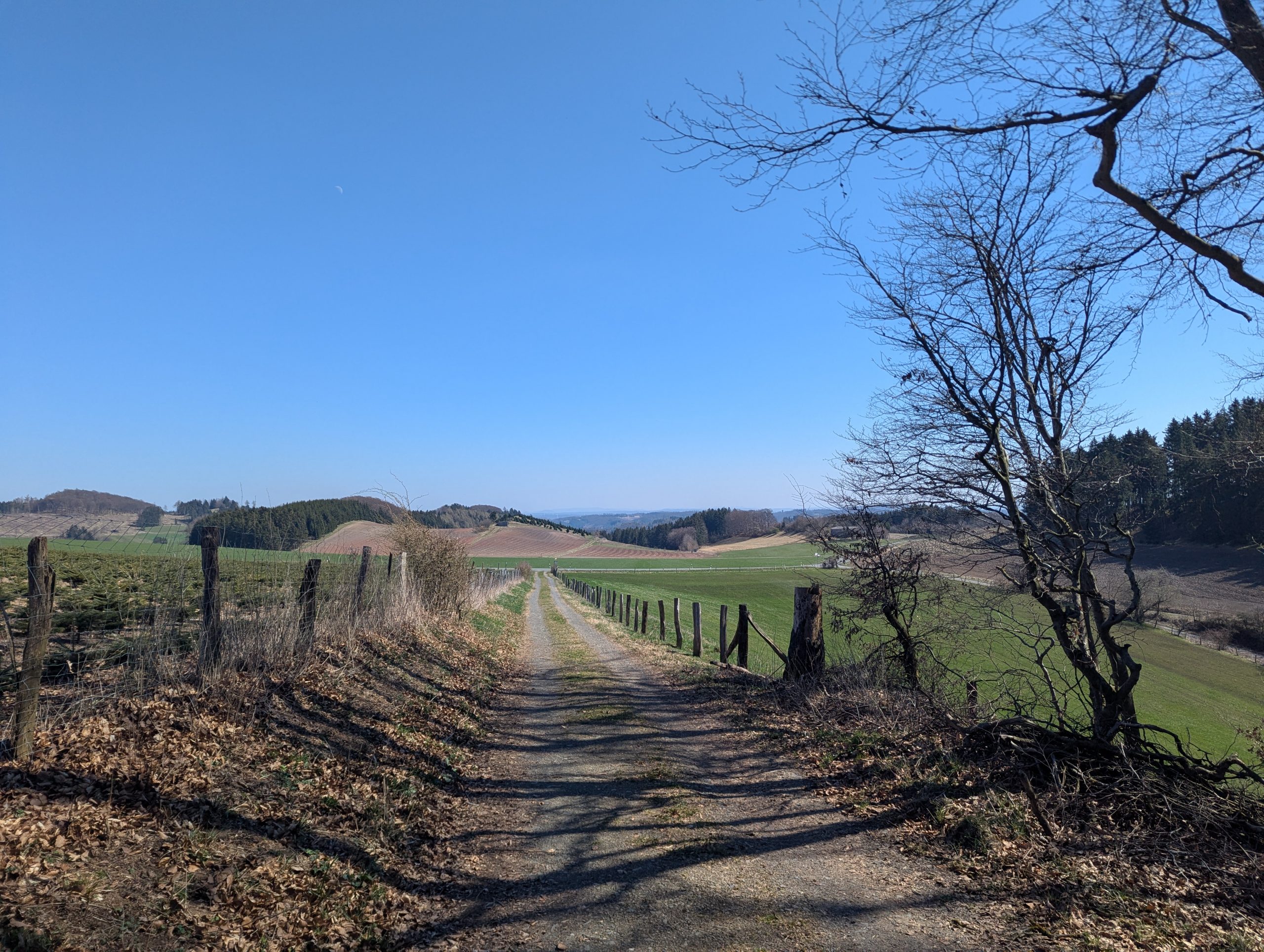 Eine Landschaftsstufe tiefer dominiert dann der gemeine Weihnachtsbaum umrahmt von Mähwiesen. Nach dem Abstieg nach Oberschledorn geht es auf dem südlichen Bergrücken nach Westen bis Deifeld.