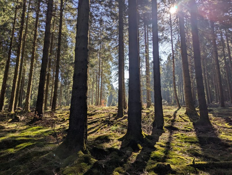 Nach wieder kalter Nacht und den ersten wärmenden Sonnenstrahlen geht es gegen 10 Uhr nach dem üblichen Geräume zu Fuß hoch zur Grenze am Kutenberg. Deifeld, der Startpunkt, liegt südlich unterhalb der über den Höhenzug verlaufenden NRW Grenze zu Hessen. An der Grenze treffen der hessische Naturpark Diemelsee und das NRW Naturschutzgebiet Wamecke – Wilder Aar zusammen. Die Runde entlang der Grenze wird als Wanderlauf angegangen. Mit Laufschuhen, 4 Liter Wasser und 6 Müsliriegeln reichlich versorgt und nicht auf Verpflegungsstationen angewiesen geht es an die 28 Kilometer lange Strecke.