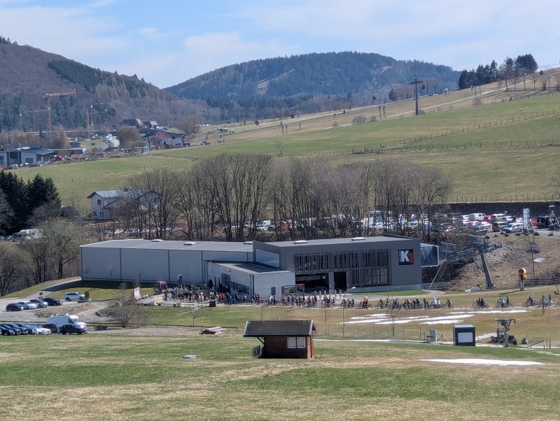 Die Pisten sind zwar nicht mehr in Betrieb, mit ihren weißen Flecken aber nicht zu übersehen. Dafür sind Horden mit der Seilbahn und Rad bergauf unterwegs, fahren windige Rinnen bergab und stehen dann in hunderte Meter langen Schlangen für die nächste Auffahrt an.