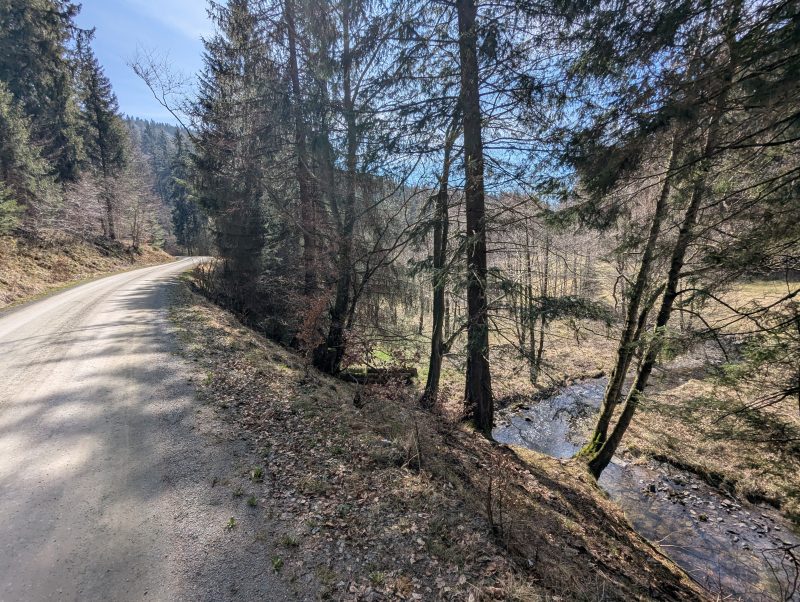 Der Rückweg schlängelt sich an der Nordseite des Grenzgebirges eine Etage tiefer an Hoppecke und dem gleichnamigen Bachtal und dessen Seitentälern entlang. Durch die Täler der Bäche Bremecke und Laupke geht es hoch auf den Fohrenkopf und dann steil auf der Forststraße runter zum Startpunkt.