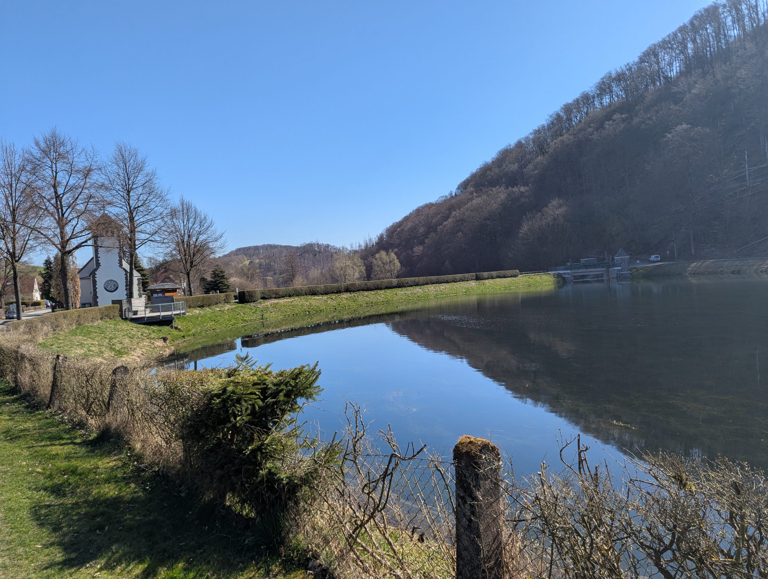 Nach den Bergetappen geht es ab Hallenberg durch das Nuhnetal. Die Nuhne ist hier nach Osten fliessend Grenzfluss und die Gelegenheit für eine Talfahrt ist willkommen. Der Etappentag ist auch Heimreisetag, da ist die Radrunde nicht besonders lang. Die ersten 11 Kilometer ist der Blick aufs Wasser die Aussicht. Trotz Sonnenschein und Sonntag ist nicht viel rollendes untz erwegs. Ab der Nuhnebrücke bei Neukirchen geht es nach Norden durch die Felder. Bei Dreislar eine kleine Extrarunde am Wellnessplatz Schwinkel vorbei und dann am Talhang der Dormecke zurück zur Nuhne.