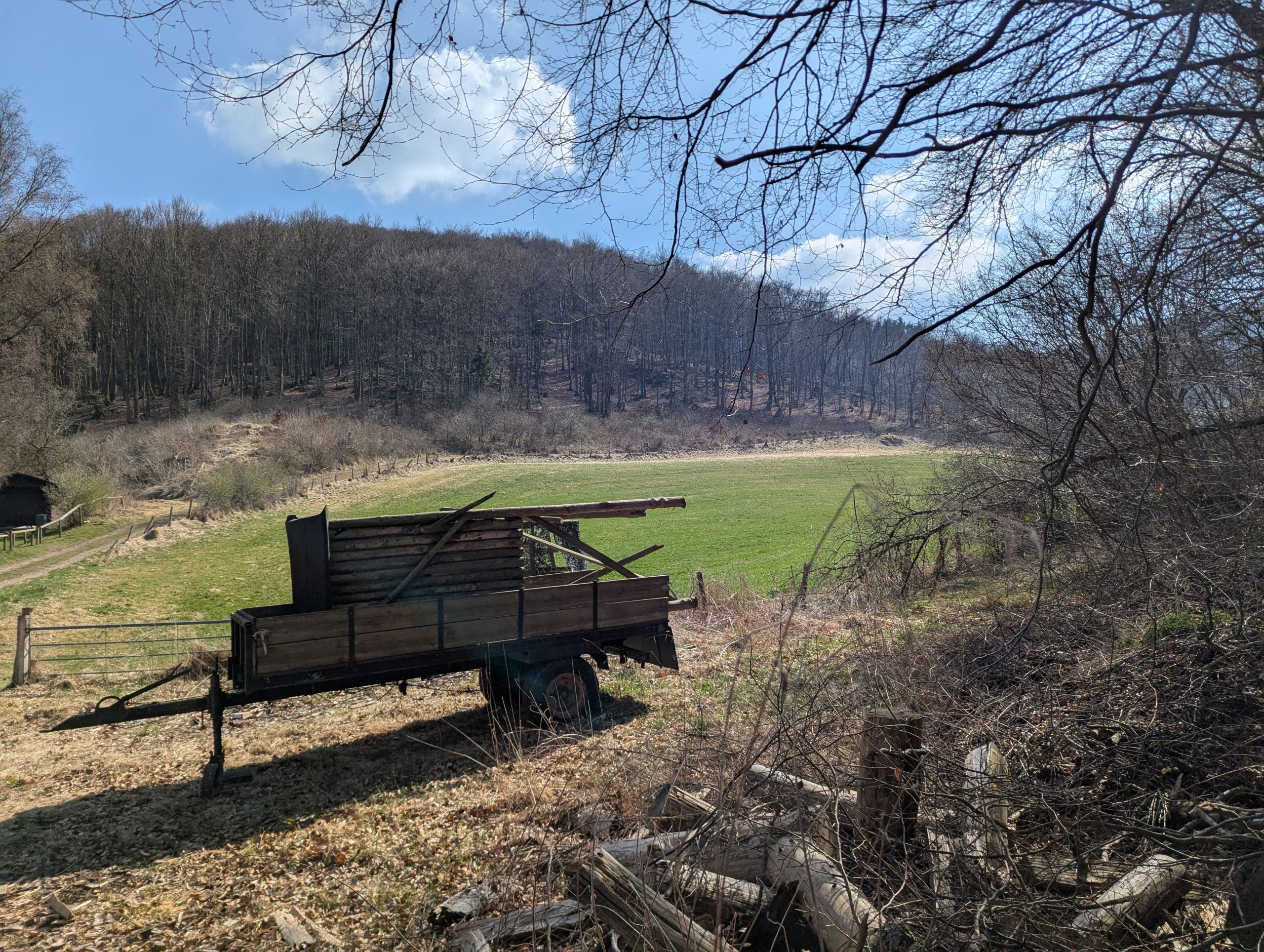 Der Platz wird an der Autobahn Dortmund Kassel gut von durchreisenden Campern genutzt, erfordert für die großen Gespanne aber einiges an Rangierarbeit. Die Wiese ist zur Bundesstraße hin abfallend und der Bus steht nicht gerade gerade. Das grüne Steilwandzelt steht dahinter, die Wiese ist ziemlich eng besetzt. Der Abend ist dann doch im Faltstuhl deutlich entspannter als bei den freistehenden Übernachtungen auf den Eselswegetappen. Die Straße erscheint im ersten Momoent laut, aber Abends ist davon nichts mehr störend zu vernehmen. Von ein paar unvermeidlichen Sägesessel mal abgesehen. Das mag bei Ostwind anders sein.