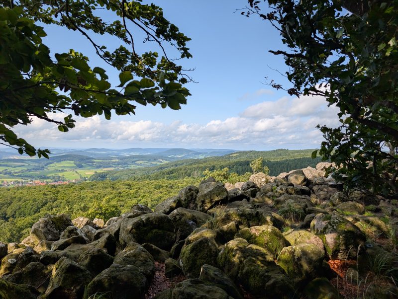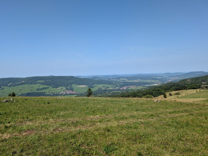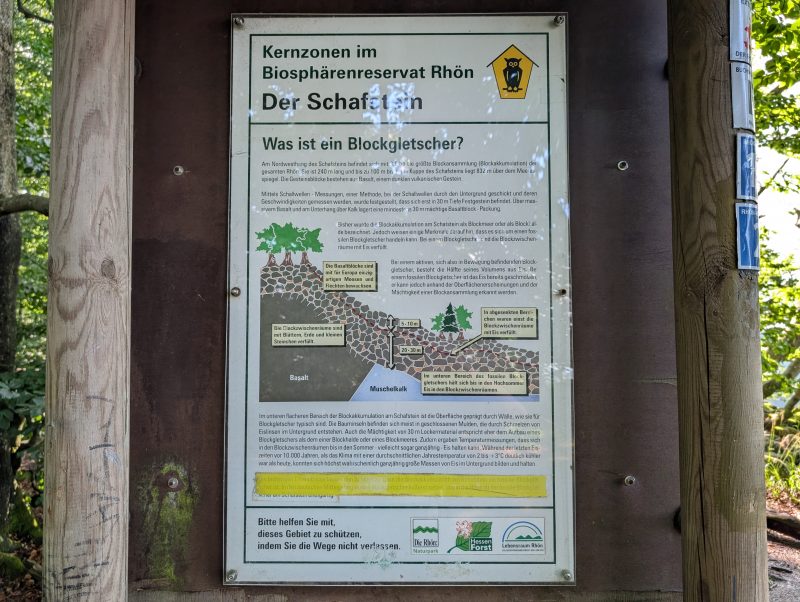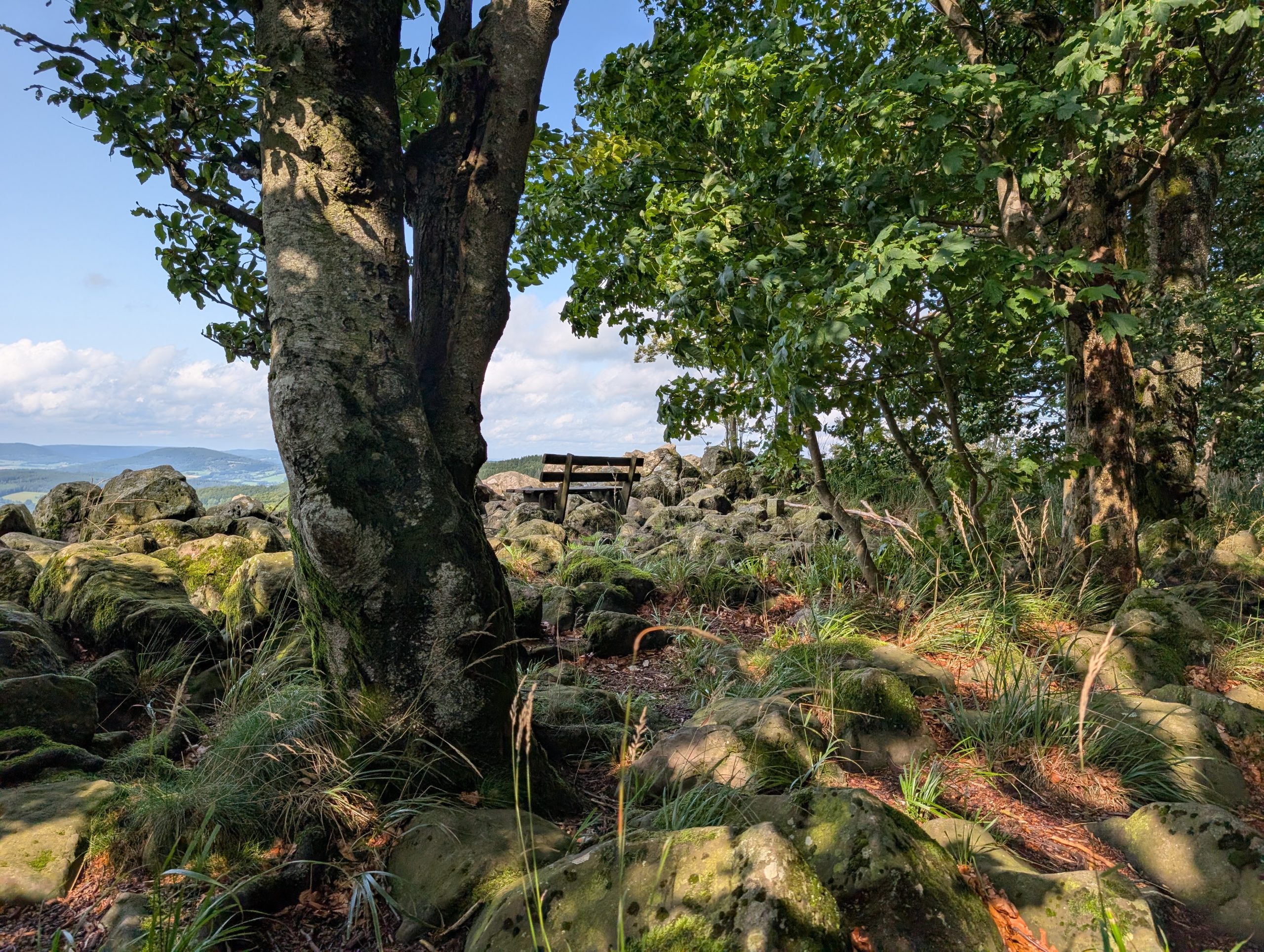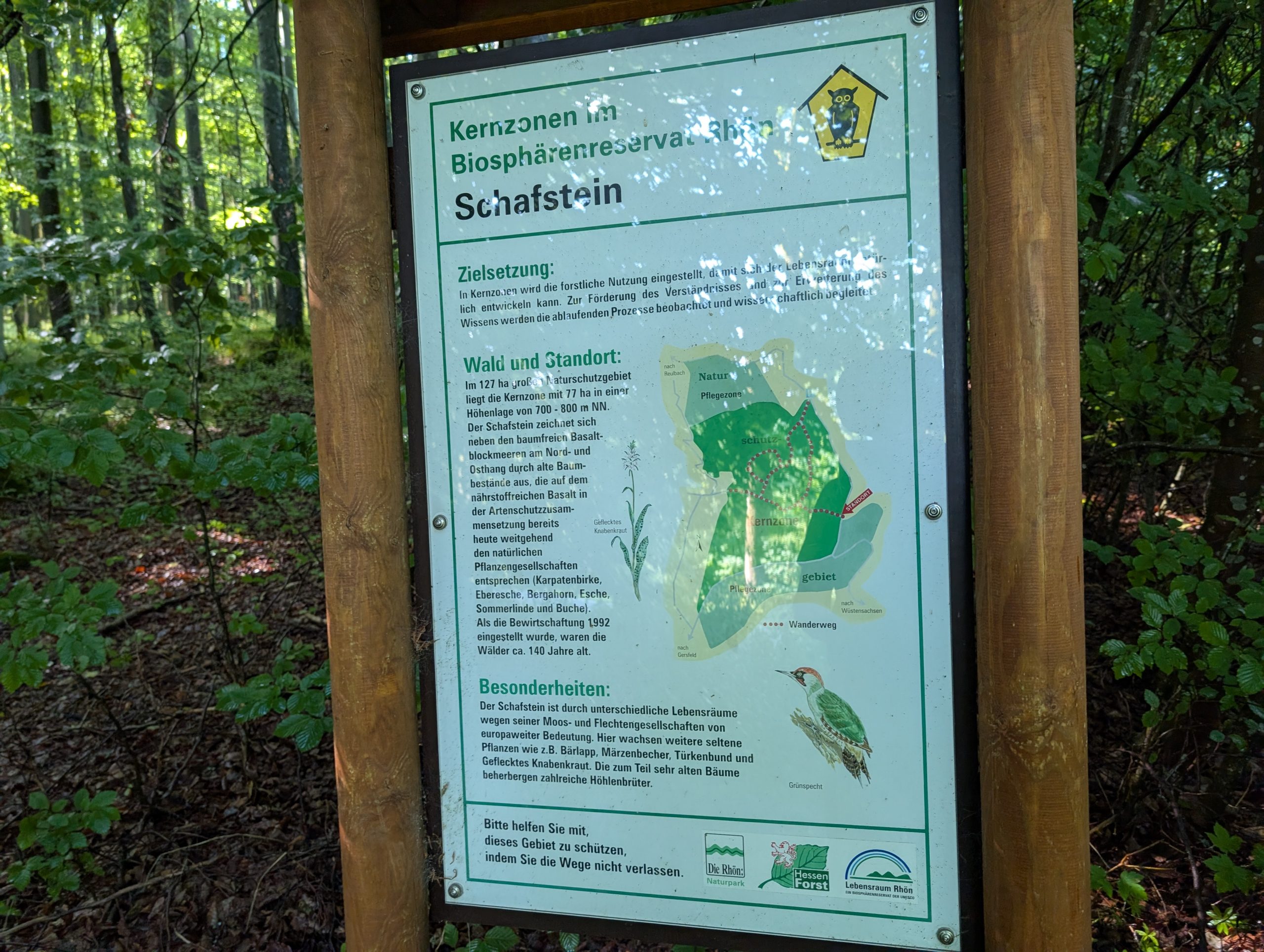 Bei dieser Tour konnten wir direkt vom Campingplatz aus starten. Dabei führte der Weg zuerst durch das Dorf, dann am Friedhof und Freibad vorbei. Hier treffen wir auf der Beschilderung der “Extratour Der Ehrenberger” (E9), der wir überwiegend folgen. Es geht zuerst über Hutewiesen den Berg hinauf, bis wir in die Kernzone des NSG Schafstein kommen. Ab hier wandern wir durch den Wald hinauf bis in das Gebiet der Blockhalden mit weiten Aussichten ins Land hinein. Mit dem Buchoniarundweg (B) geht es anschließend langsam wieder durch den Wald hinunter, wobei dieses Teilstück schon fast alpin anmutet. Dann stoßen wir erneut auf die “Extratour Der Ehrenberger” und wandern bergab durch weite Hutewiesen hinunter nach Wüstensachsen. Landschaftlich eine wirklich beeindruckende Tour.