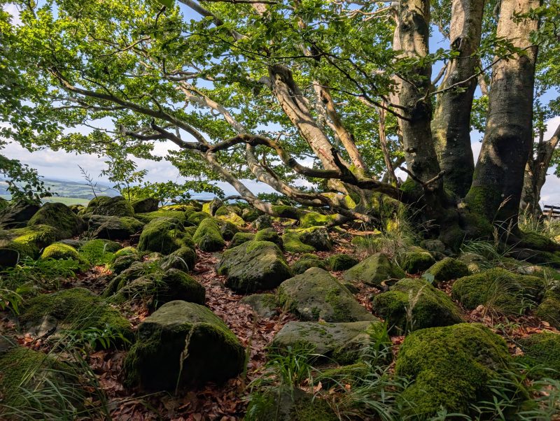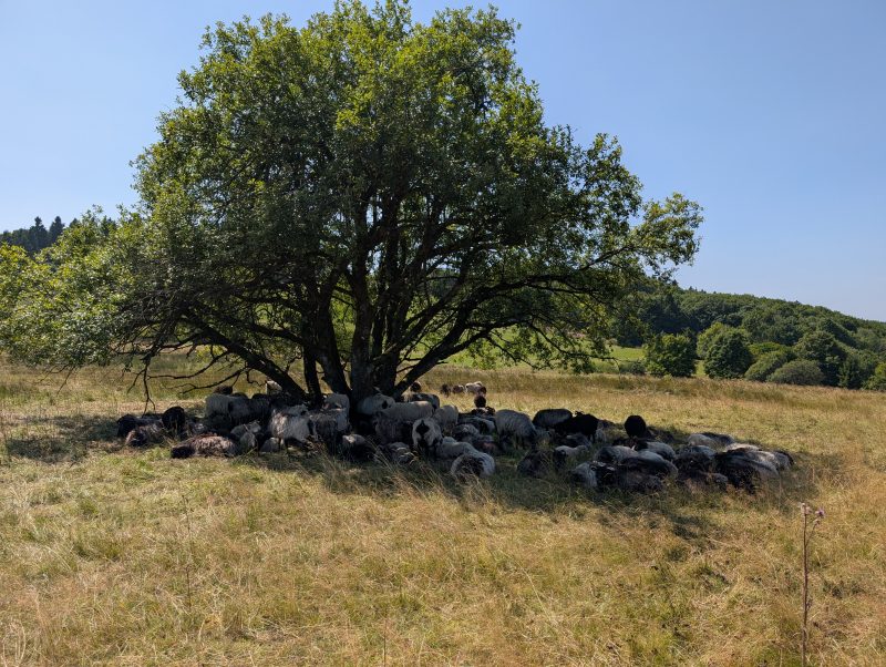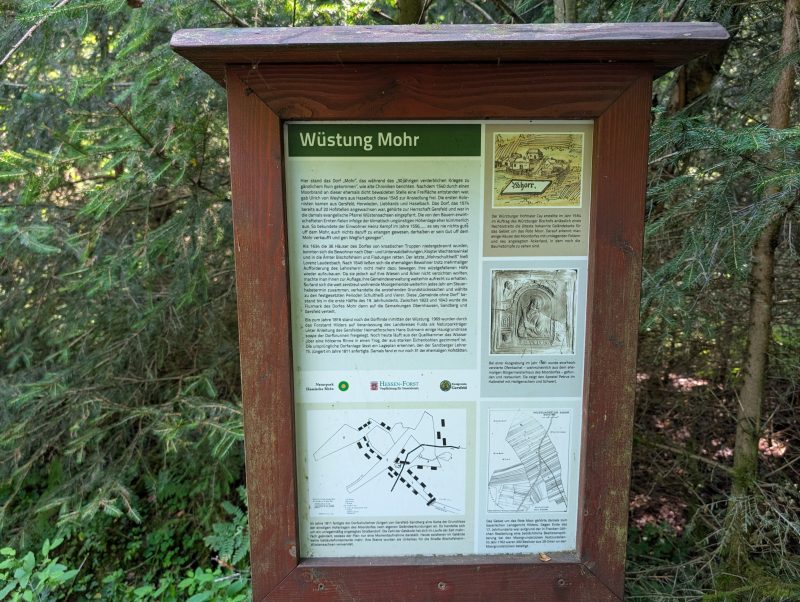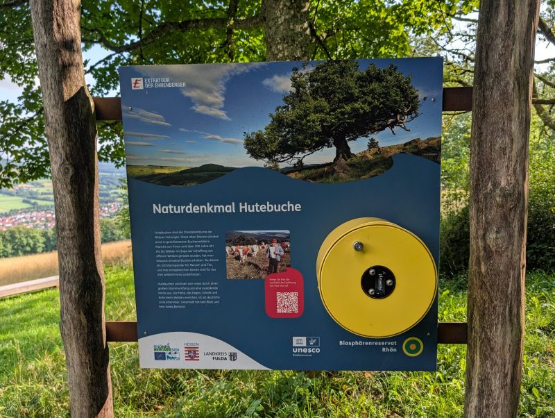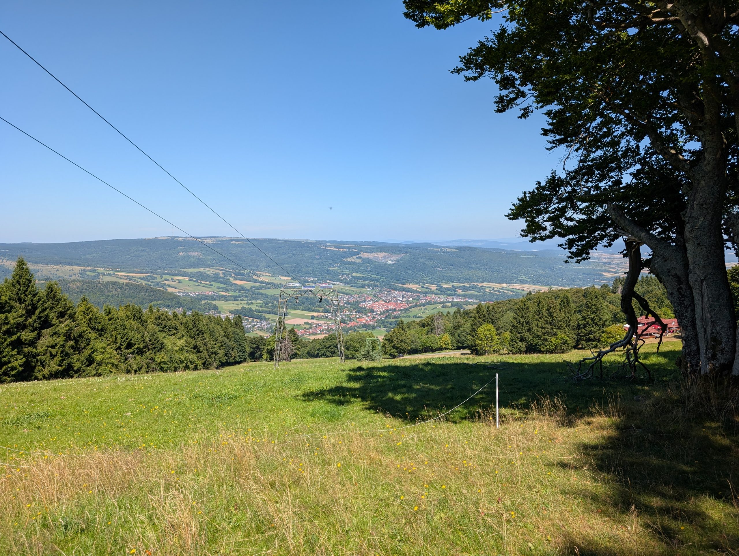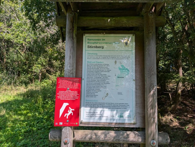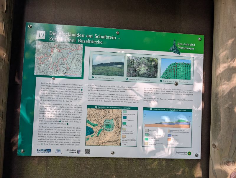 Bei dieser Tour konnten wir direkt vom Campingplatz aus starten. Dabei führte der Weg zuerst durch das Dorf, dann am Friedhof und Freibad vorbei. Hier treffen wir auf der Beschilderung der “Extratour Der Ehrenberger” (E9), der wir überwiegend folgen. Es geht zuerst über Hutewiesen den Berg hinauf, bis wir in die Kernzone des NSG Schafstein kommen. Ab hier wandern wir durch den Wald hinauf bis in das Gebiet der Blockhalden mit weiten Aussichten ins Land hinein. Mit dem Buchoniarundweg (B) geht es anschließend langsam wieder durch den Wald hinunter, wobei dieses Teilstück schon fast alpin anmutet. Dann stoßen wir erneut auf die “Extratour Der Ehrenberger” und wandern bergab durch weite Hutewiesen hinunter nach Wüstensachsen. Landschaftlich eine wirklich beeindruckende Tour.