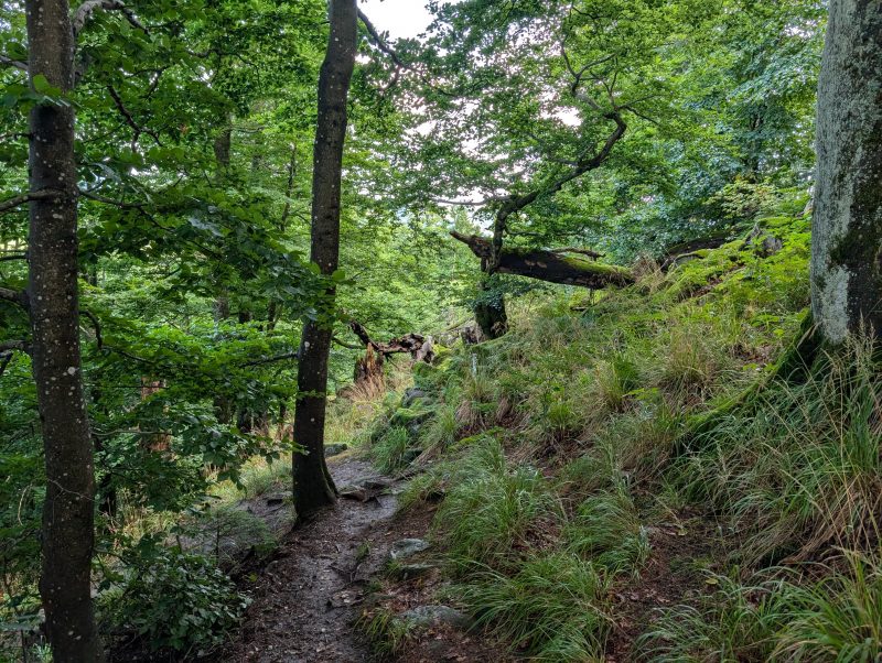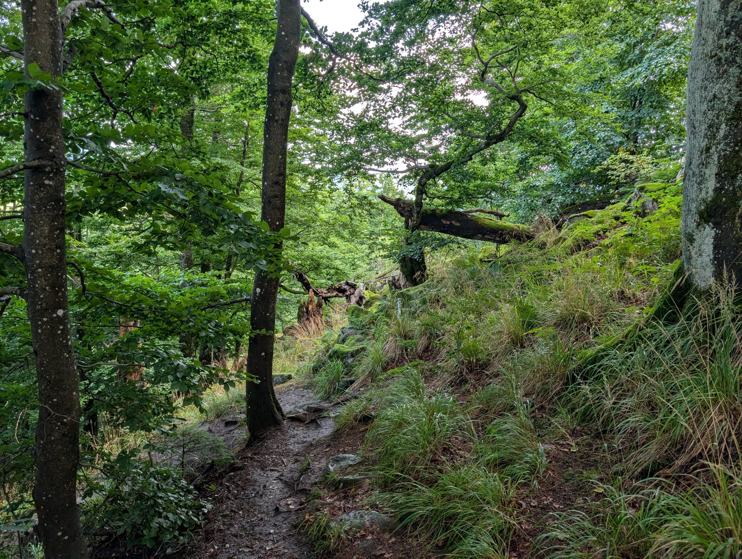 Der Eselsweg bietet erst ein wenig Aussicht und die Sonne schafft es durch die Wolken. Im Wald geht es mit Hut aber auch ohne Sonnenschutzmittel auf der Haut.