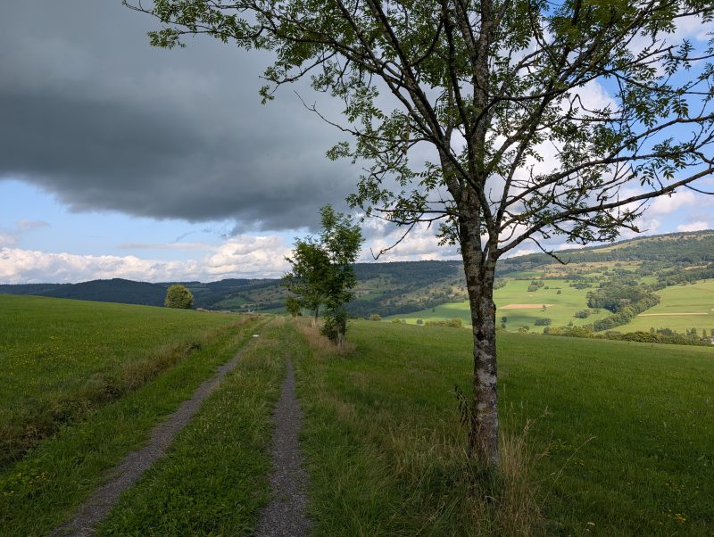 Es ziehen Gewitterwolken heran und der Schritt wird doch wieder schneller. Ein Golfplatz, dann Wiesen und Felder und Blick auf Schlüchtern.